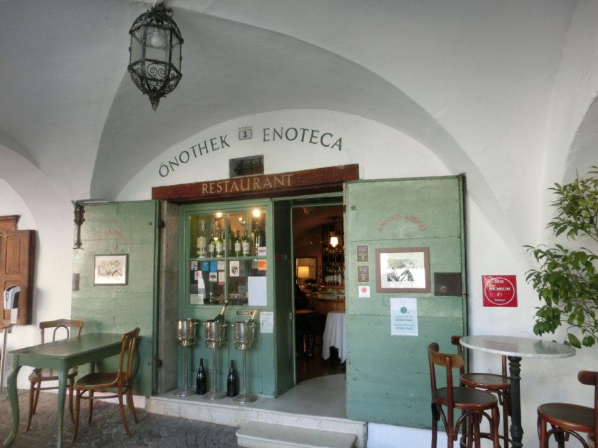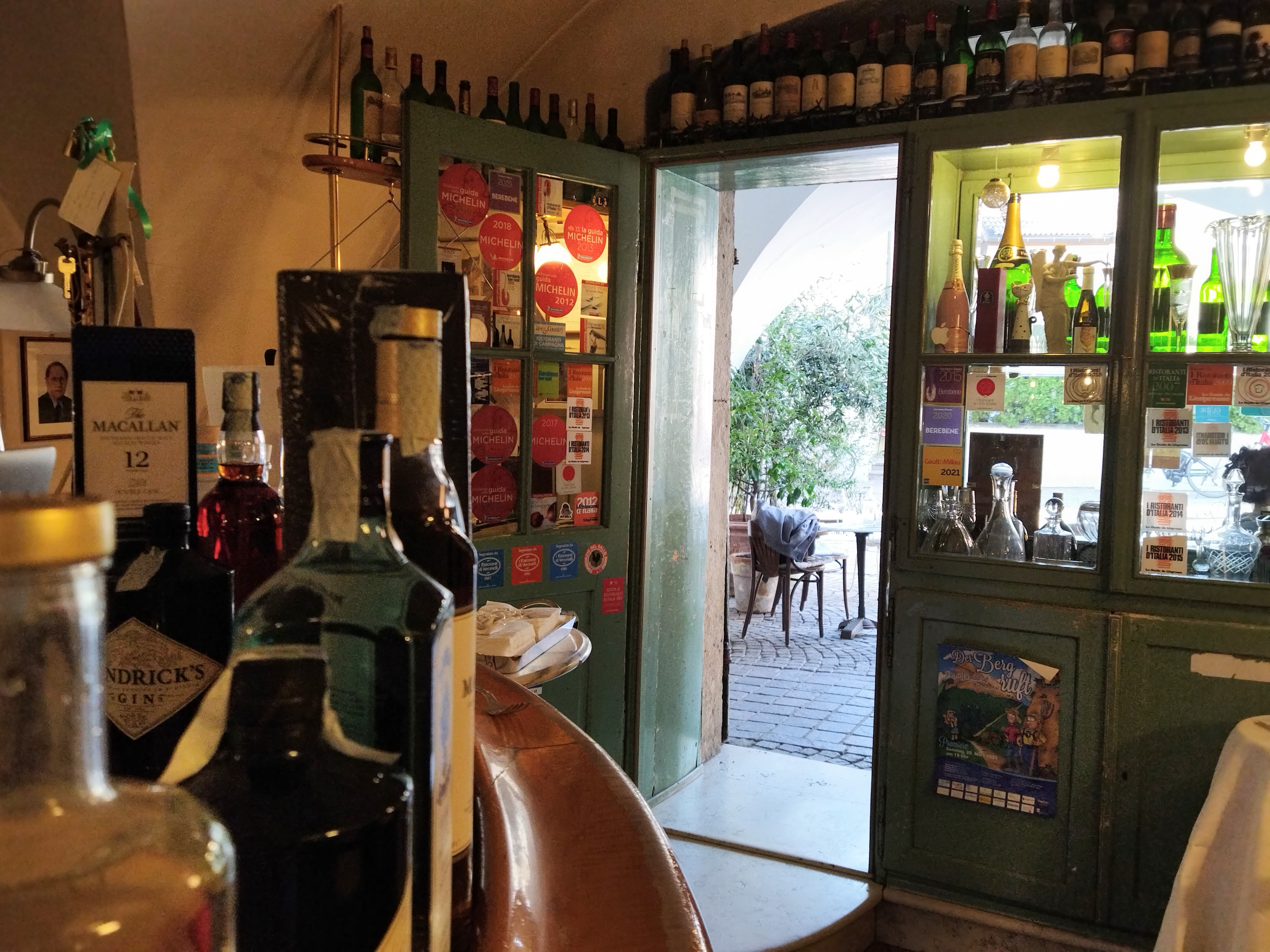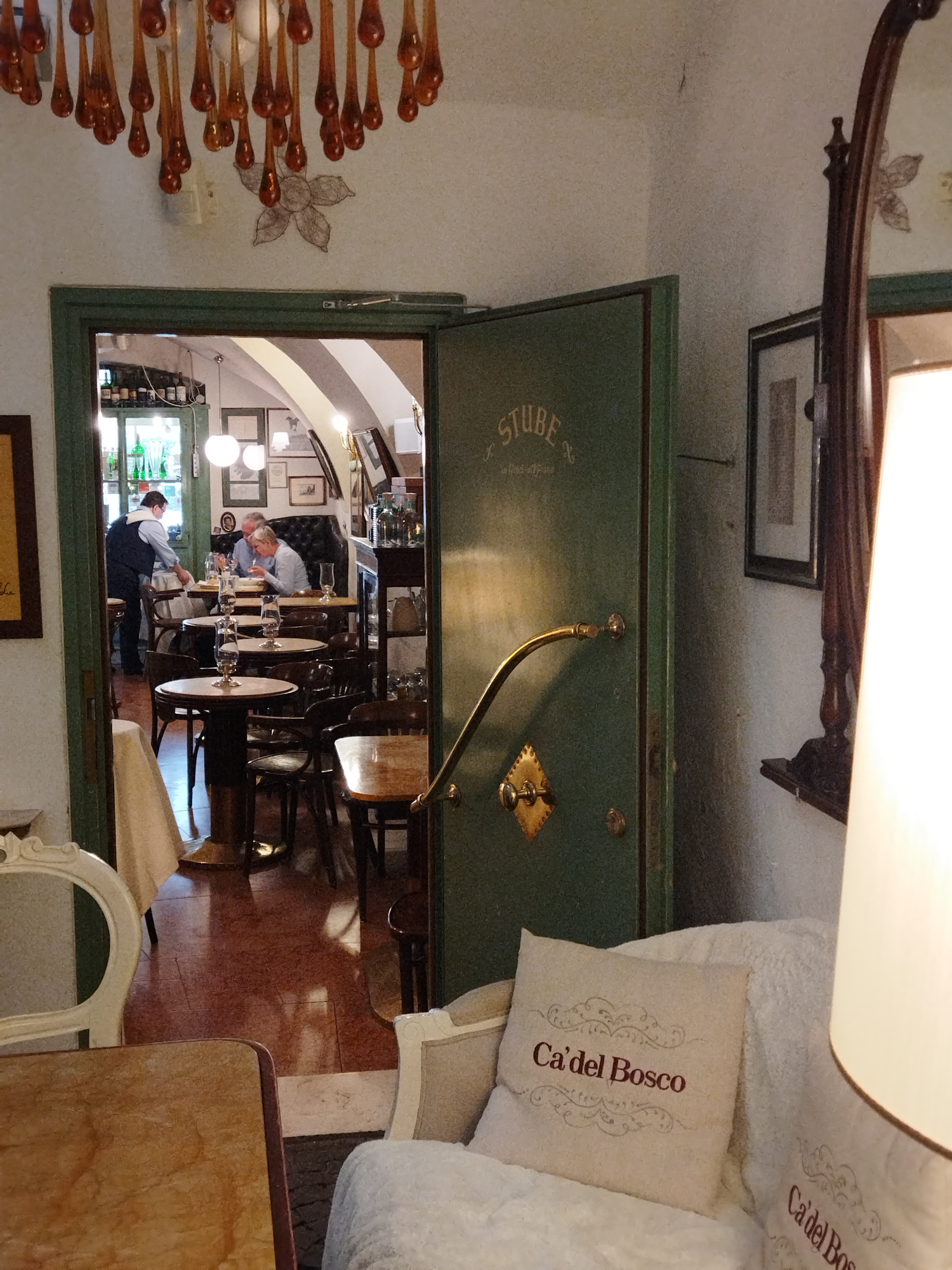 前置きはともかく・・・そんな影響からか、このお店の名前もイタリア語でなく、サイトはなんとドイツ語の一か国語表記(汗)。しかし、行った日に郷土料理がありそうなレストランがなかった(閉まっていた)こと、お店の雰囲気がよかったこと、そしてこの地はイタリア随一のピノ・ネーロ種のワインで有名だということで、エノテカであるこのお店に入ったのでした。お店で話しかけられたのはまず「ハロー」、そして「〇△□xxx」ドイツ語!とはいえ、ブォンジョルノ、とイタリア語で話しかけるとイタリア語モードになってくれます。皆さん完璧なバイリンガル!
