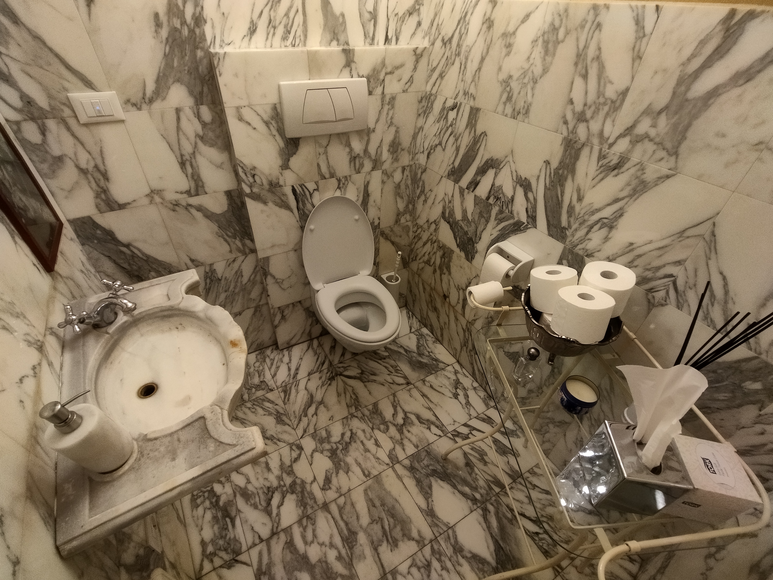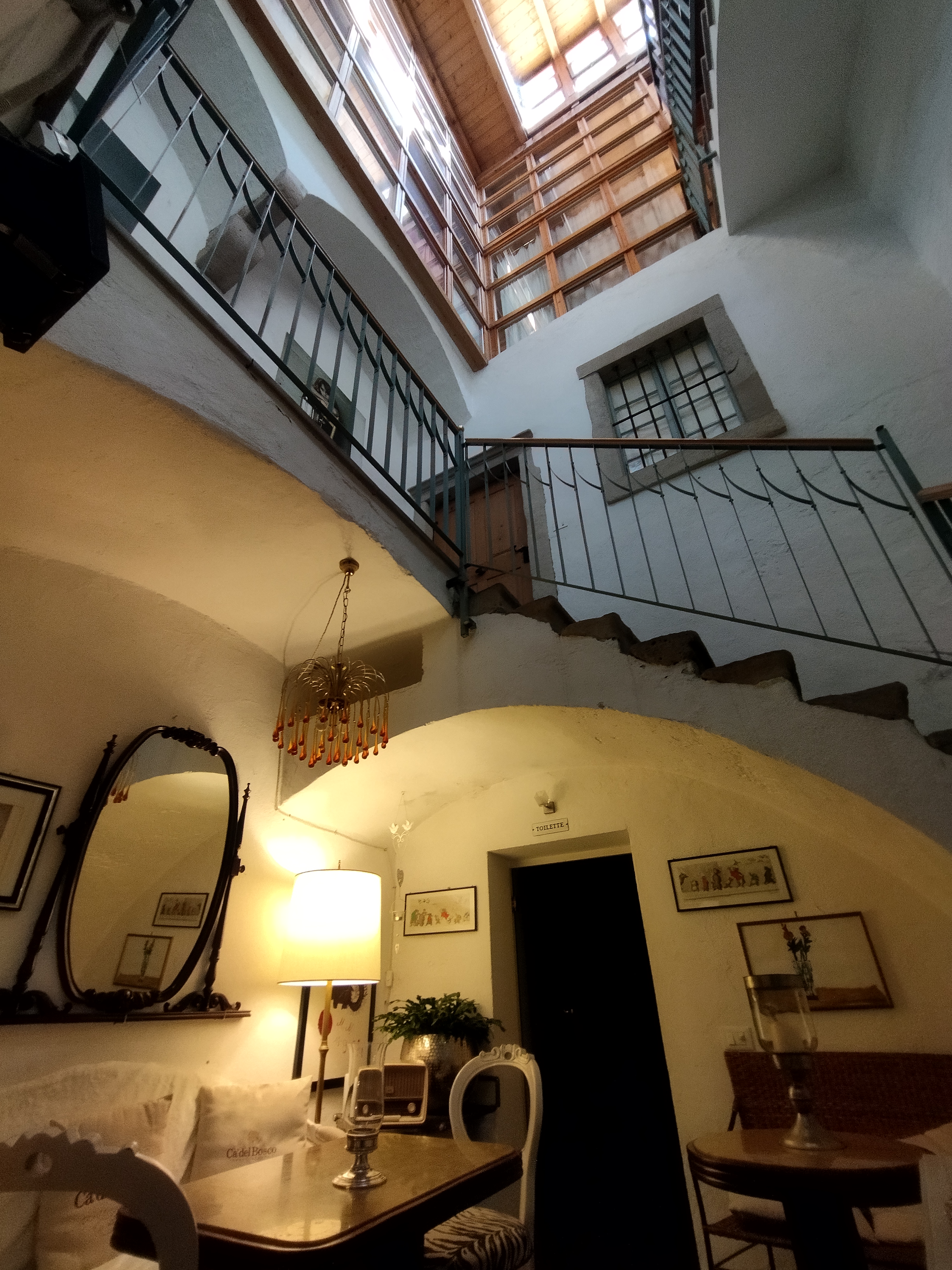 トイレのために中にも入りましたが、中の内装もシックでおしゃれ。上の写真の左奥にトイレがあるのですが、その手前の小さなスペースがまたおしゃれだったんです。それだけでなく、総大理石?のトイレも清潔で高級感あふれていて、おもわず写真を撮ったという(ギャラリーに掲載・笑)。スタッフもとてもスマートで、北部だからなのか、お店の格だからなのか、お値段はなかなかのものでしたが、全てがハイクオリティのエノテカでした。私はハムとチーズの盛り合わせを頼みましたが、数は少ないと言えどパスタや魚・肉料理もありました。あとでサイトを探す時にレビューも見たのですが、ここのストゥルーデル(この州の郷土菓子、シナモンがきいたリンゴのパイ)が絶品なんですって!しまったーーー!!・・・ということで、今度エ―ニャに来ることがあったら、ストゥルーデル目当てにお茶しに行こうかな?と思います。