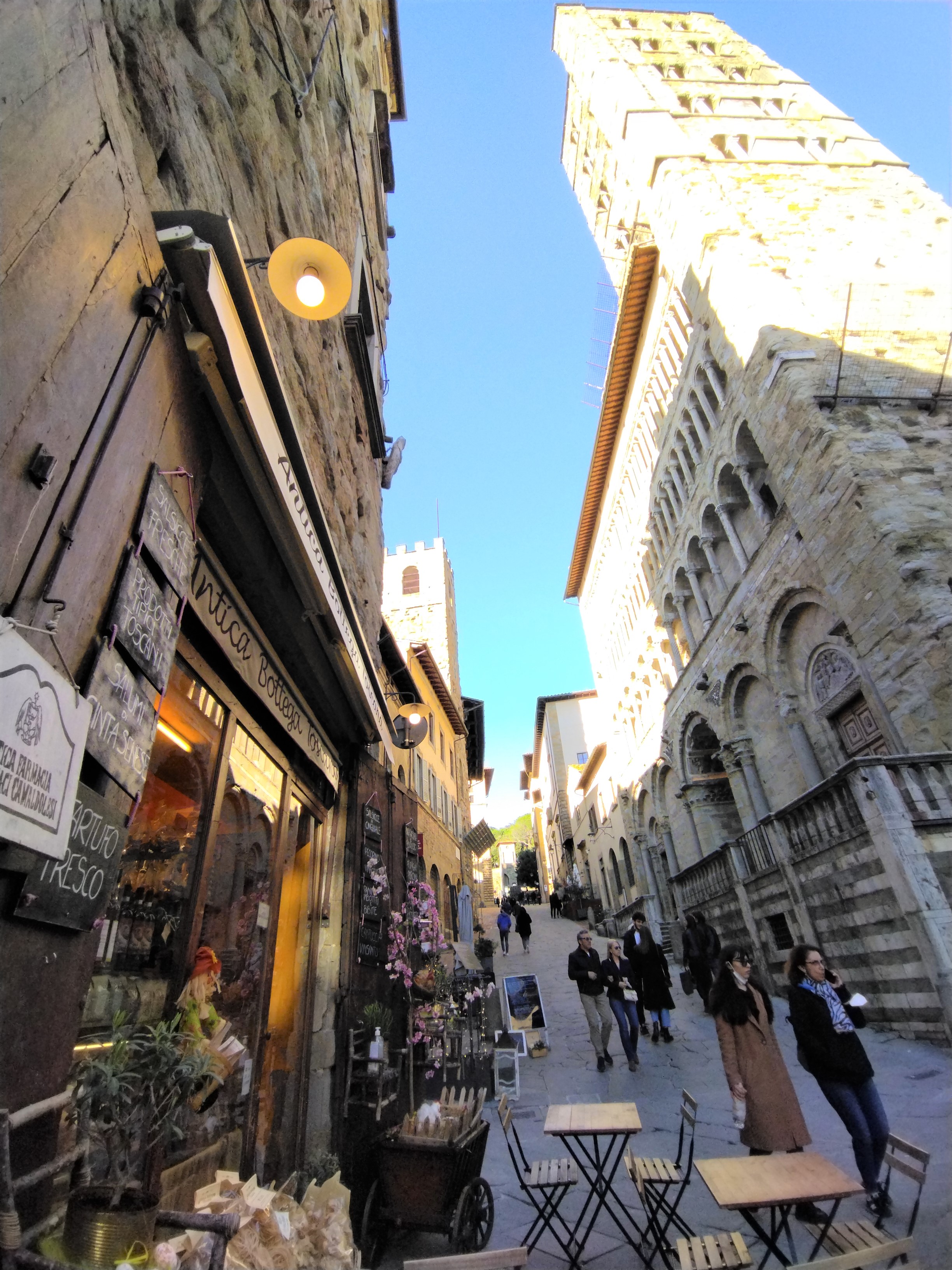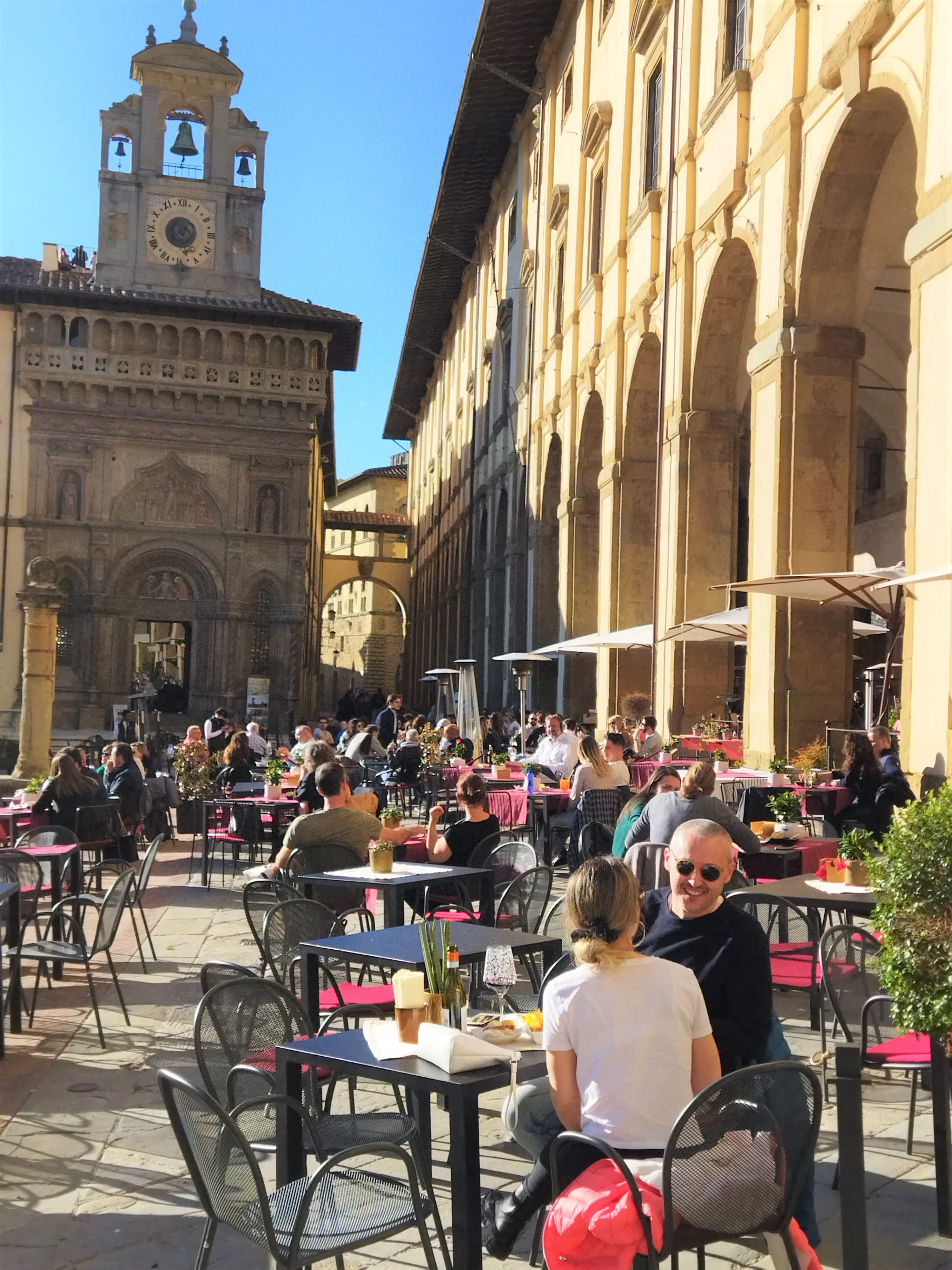 右側に教会が見えたら手前を右折し、アレッツォ旧市街で外せないグランデ広場へ。そうそう、この道で前からオシャレだなぁ〜一回入りたいな〜と思っていたエノテカ、冬に見てたアレッツォが舞台の刑事ドラマによく出てたんですよね。ホンマ、次はゆっくり来てここで食事かアペリティーヴォしないと!