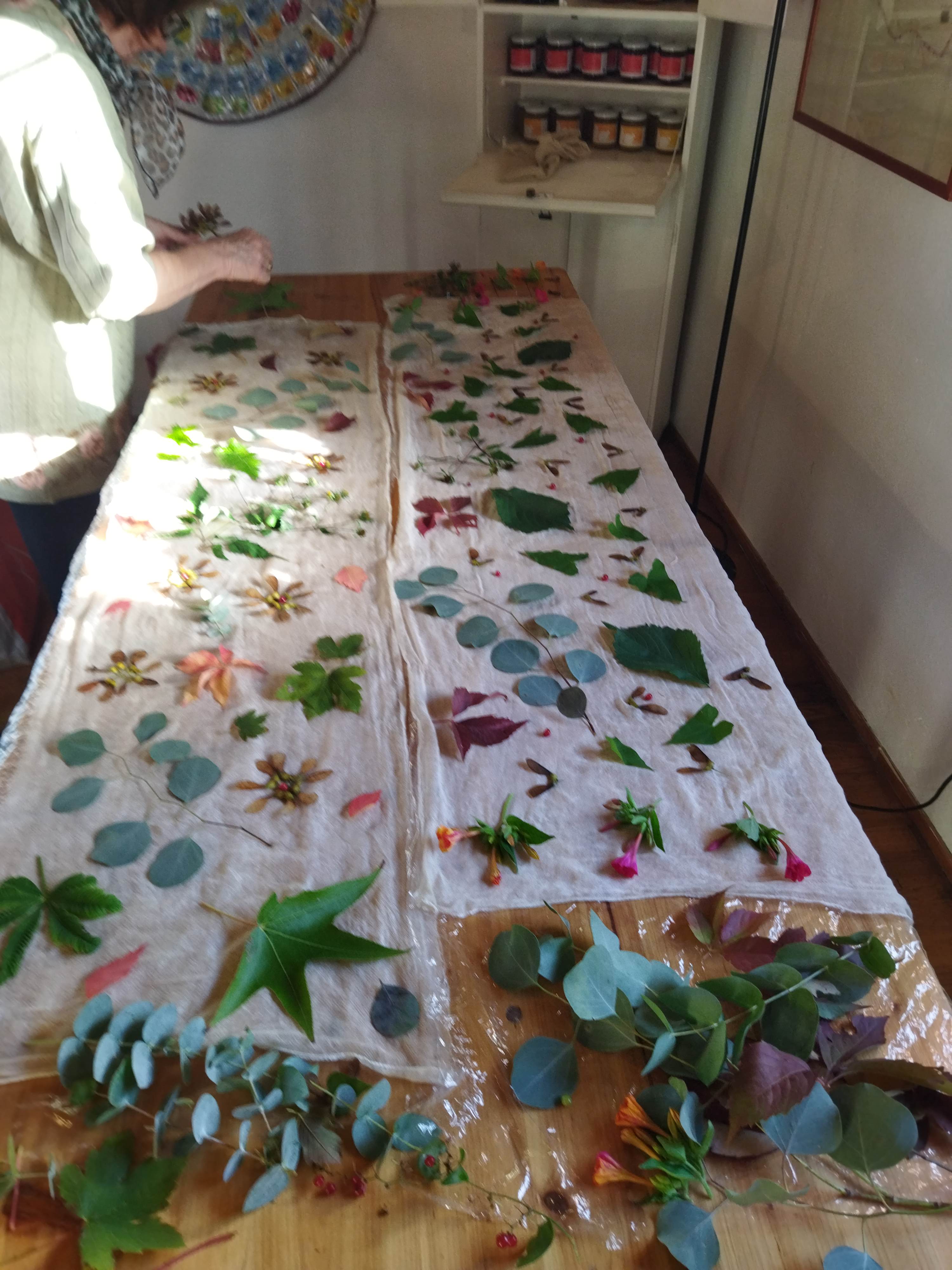まずは、クリスティーナや参加者が持参した植物、休暇の家の庭に生えてる植物から各自プリントしたいものをピックアップ。「いま見えている色が出てくるとは限らないわよ〜サ・プ・ラ・イ・ズ!」色はその植物が持つ色素やタンニンによって違い、また同じものでも季節微妙に変わったりするんだとか。それがまた自然の営みなのだから、余計に味わい深く、唯一無二のものできる理由。