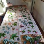 1つの長テーブルに2人づつ向かい合って、ラップの上に敷かれた下生地に好き好きにし素材を置いてゆきます。選んだ植物もそうだけど、置き方でも規則性なく置くのか、対称的に置くのかなどにも個性が見えて面白いです。テーブルにクリスティーナが回ってきた時に、葉脈を出したいならどれ?この花の色はこのまま出るの?など、サプライズと言えどヒントをもらいながら、またフラフラ回って「あなたの素敵!」「これいいから、素材もらっとぃい?」など、参加者で意見交換や物々交換も。