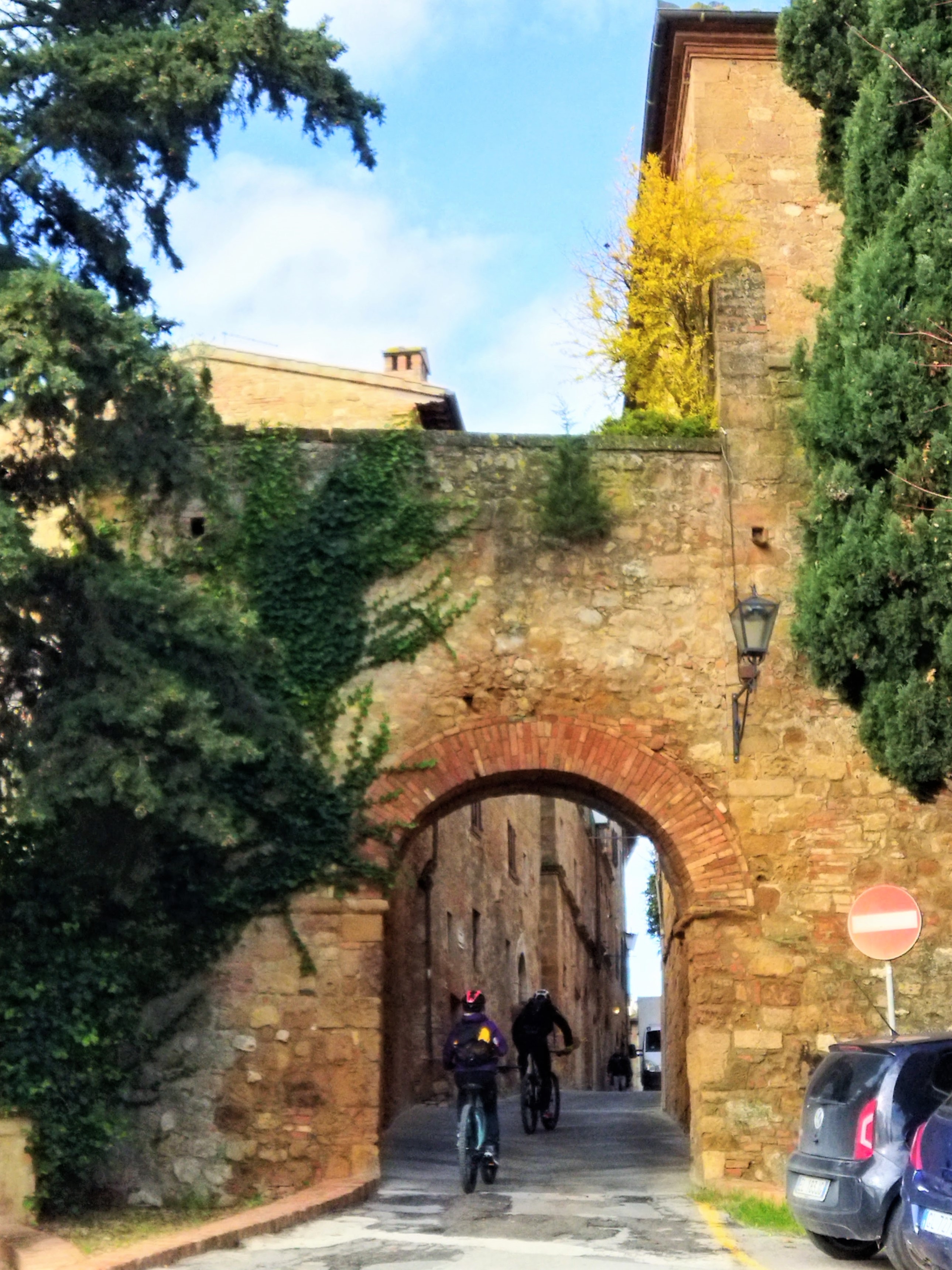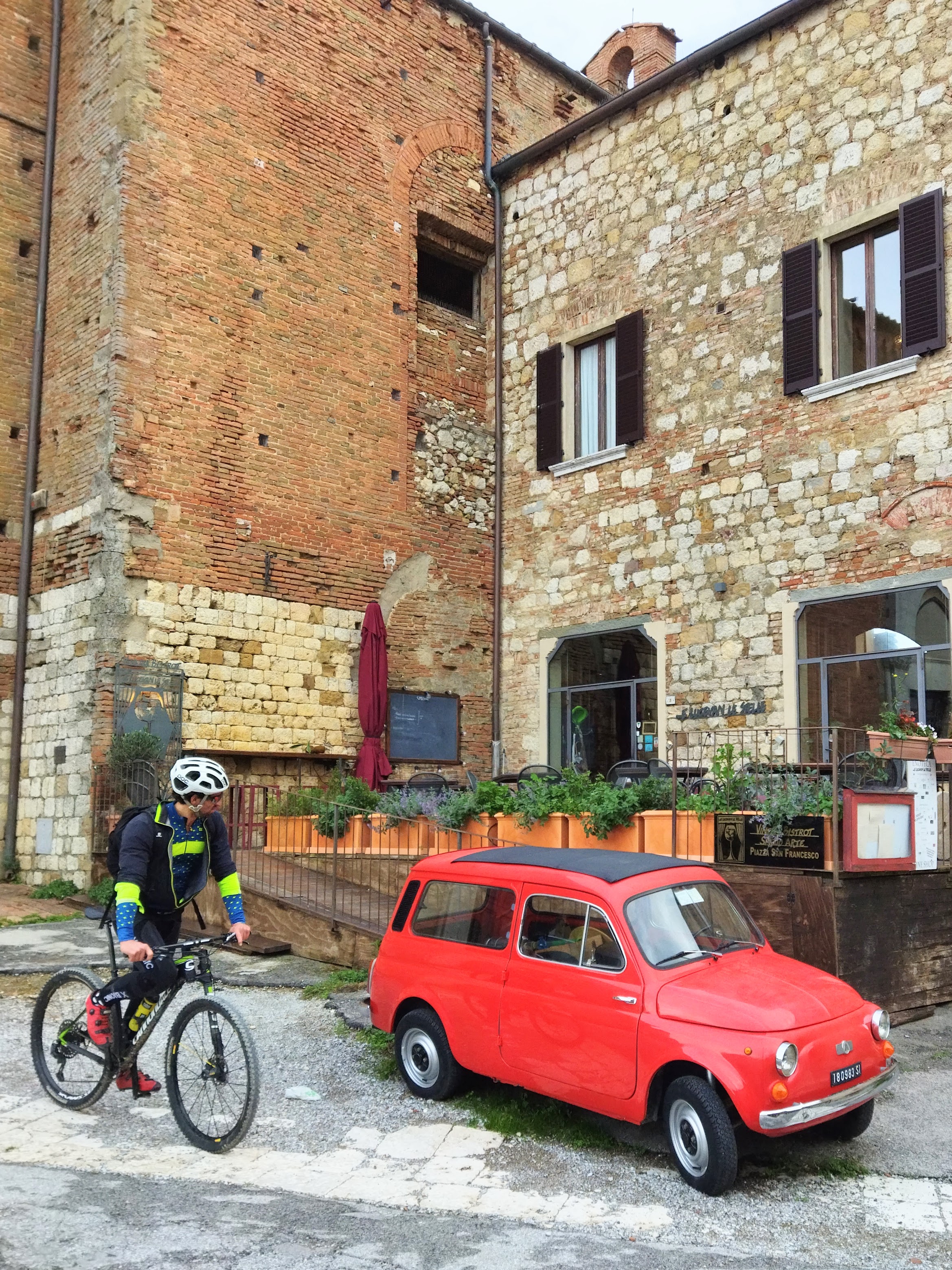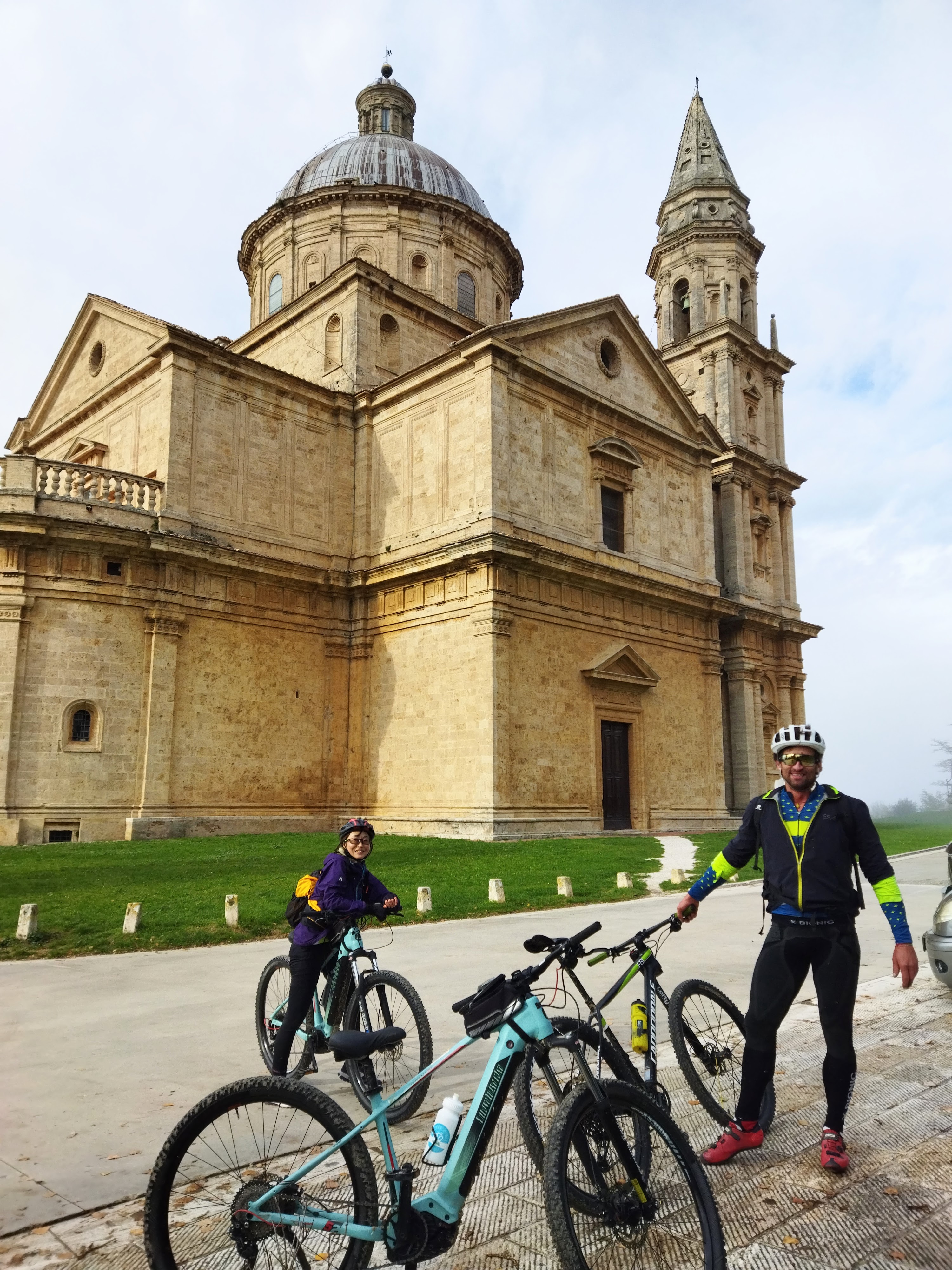 E-Bikeレンタルの本部はバーニョ・ヴィニョ―ニにありますが、そこから15キロ圏内であれば出発地にE-Bikeを運び、到着地に回収しに来てくれるので便利です。私たちのスタートは協同組合本部と宿泊先があるモンティキエッロ村。そしてガイドは、宿泊のB&Bオーナーでもあるフランチェスコ。幼い娘さんが2人いる30代後半の男性ですが、B&Bの建物1階左側は彼の筋トレと自転車車庫、右側は水彩のアトリエ、そしてワイン醸造家の学位も持つ何とも多趣味でパワフルなお兄ちゃんです(笑)。