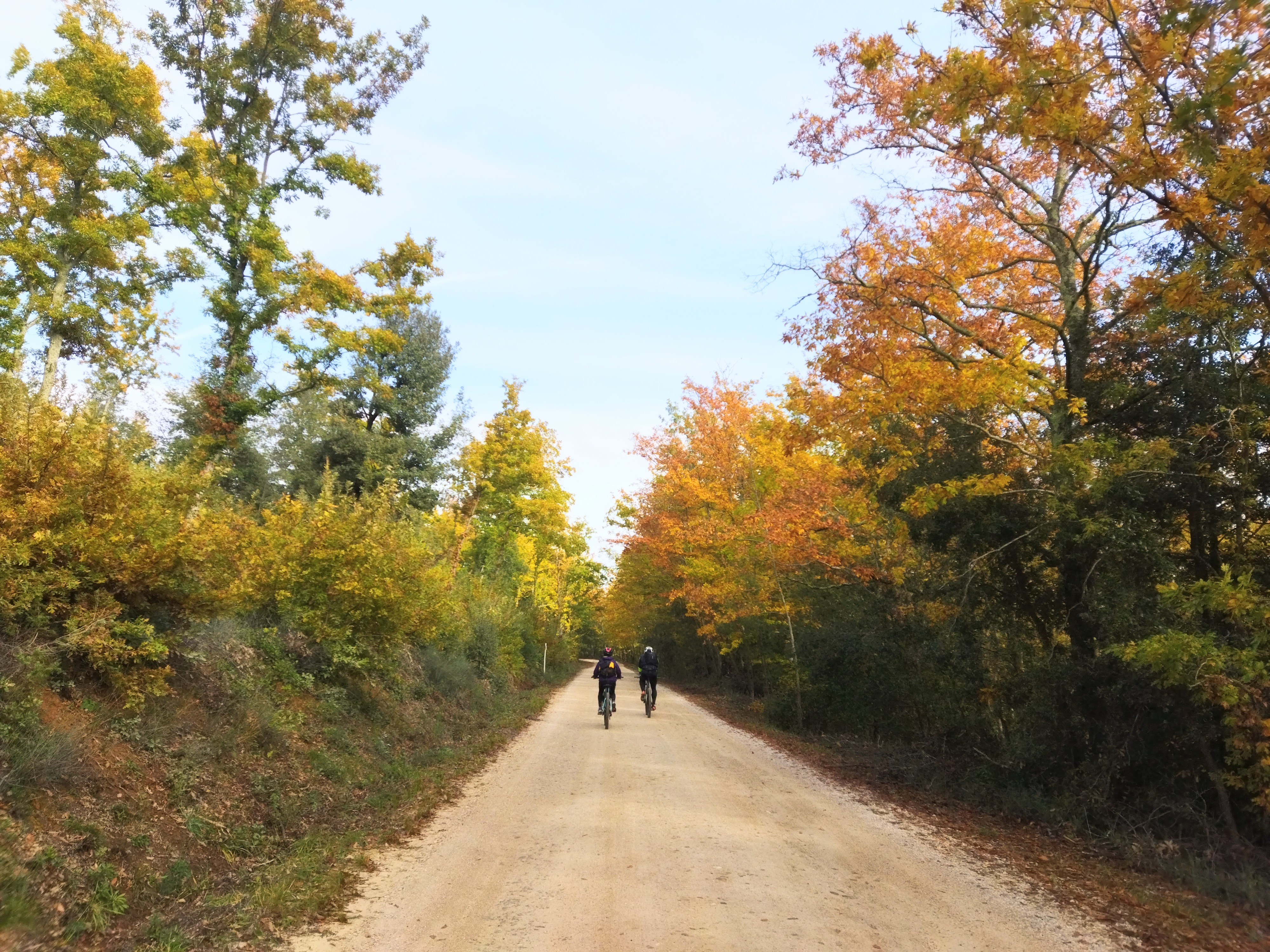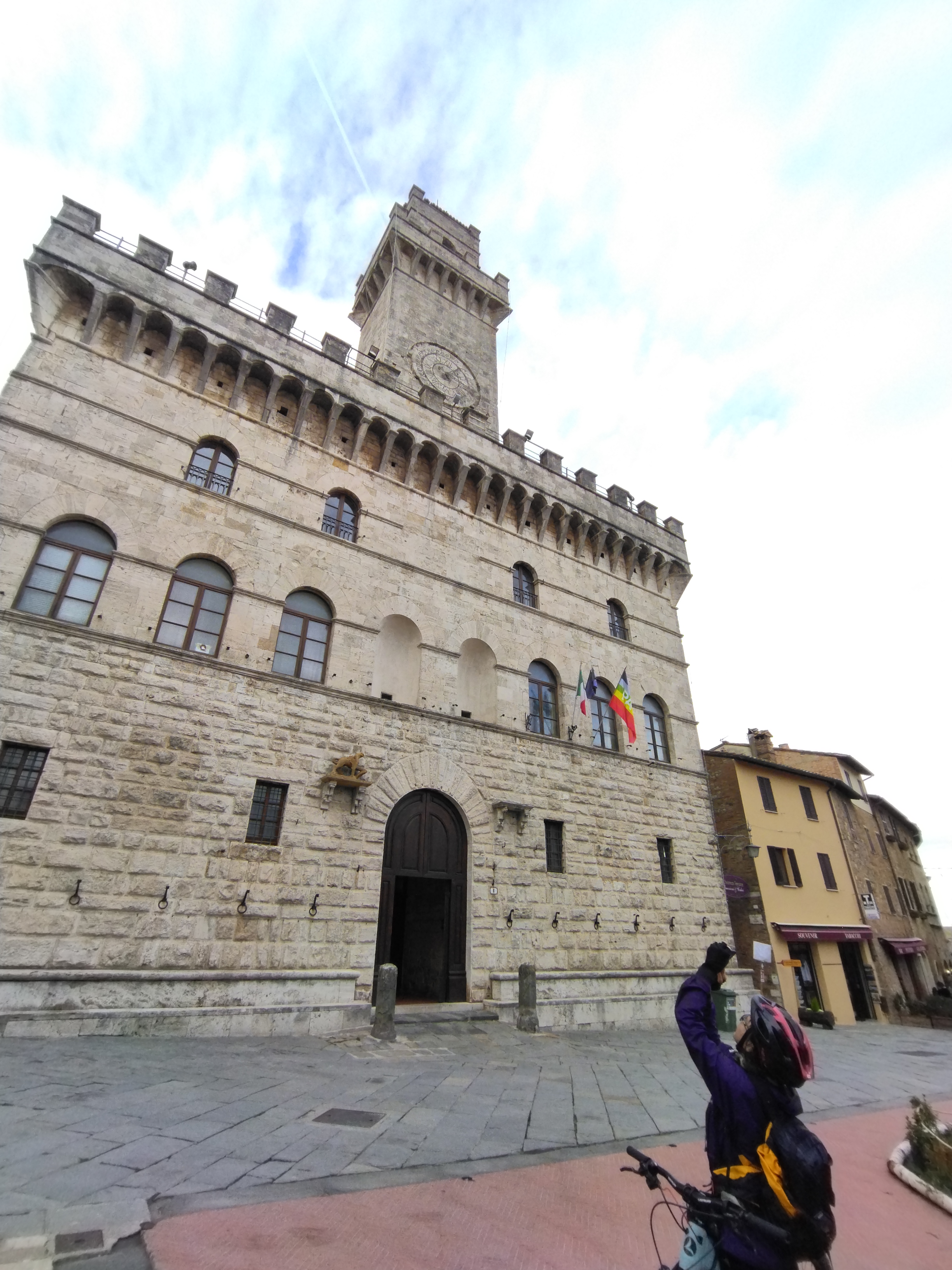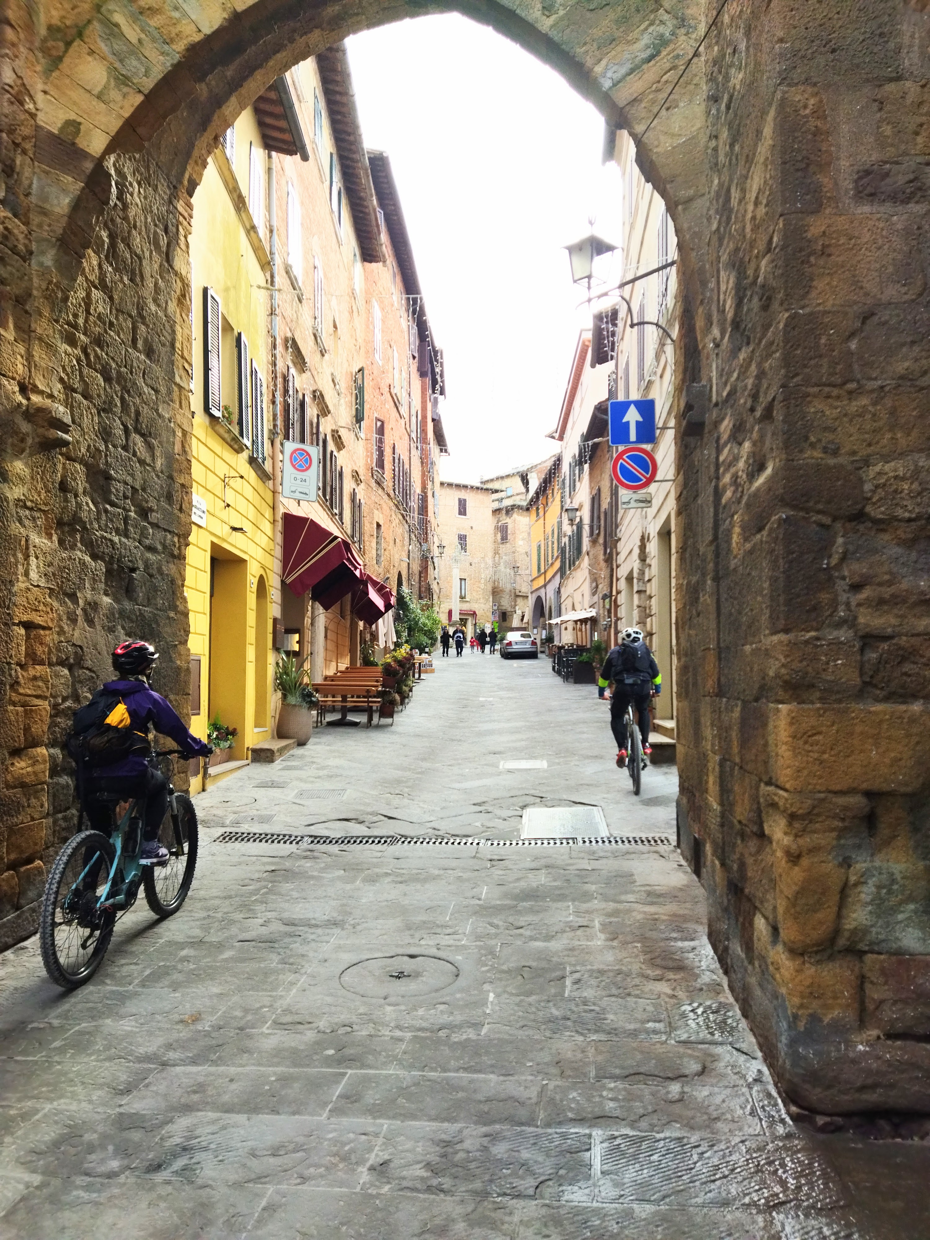 E-Bikeレンタルの本部はバーニョ・ヴィニョ―ニにありますが、そこから15キロ圏内であれば出発地にE-Bikeを運び、到着地に回収しに来てくれるので便利です。私たちのスタートは協同組合本部と宿泊先があるモンティキエッロ村。そしてガイドは、宿泊のB&Bオーナーでもあるフランチェスコ。幼い娘さんが2人いる30代後半の男性ですが、B&Bの建物1階左側は彼の筋トレと自転車車庫、右側は水彩のアトリエ、そしてワイン醸造家の学位も持つ何とも多趣味でパワフルなお兄ちゃんです(笑)。