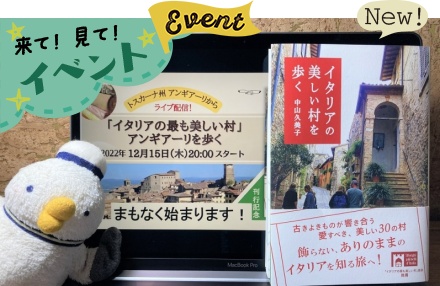 もう3週間前になりますが、書籍「イタリアの美しい村を歩く」刊行記念イベントライブ「アンギアーリを歩く」のレポート記事が、かもめの本棚さんのサイトで公開されました!