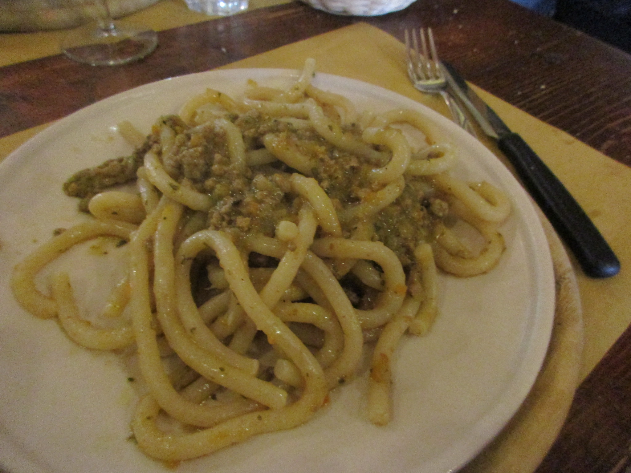 プリモは生パスタが充実しており、ホワイトラグー(トマトの入ってないミートソース)のピチ(シエナのパスタですが、県境だけあって2種ありました)を、そして、その土地でしか食べられないものを絶対食べたいので、チェルタルド名産の赤玉ねぎを使ったスープを頼みました。