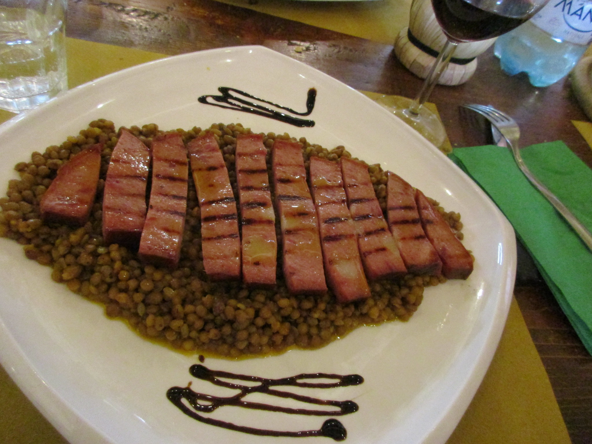 メインは目玉焼き+この地域名産のブリスト(豚頭部のソーセージ)添えと、イノシシのモルタデッラのレンズ豆添え。ブリストは臭みを消すためか?スパイスが結構きいています。しかし、どれもこれも美味しくて大満足!更に、お値段も7皿+水+クオーターワインで 64ユーロ とコスパも満点、オーナーのおじさんもすごく感じが良かったです。