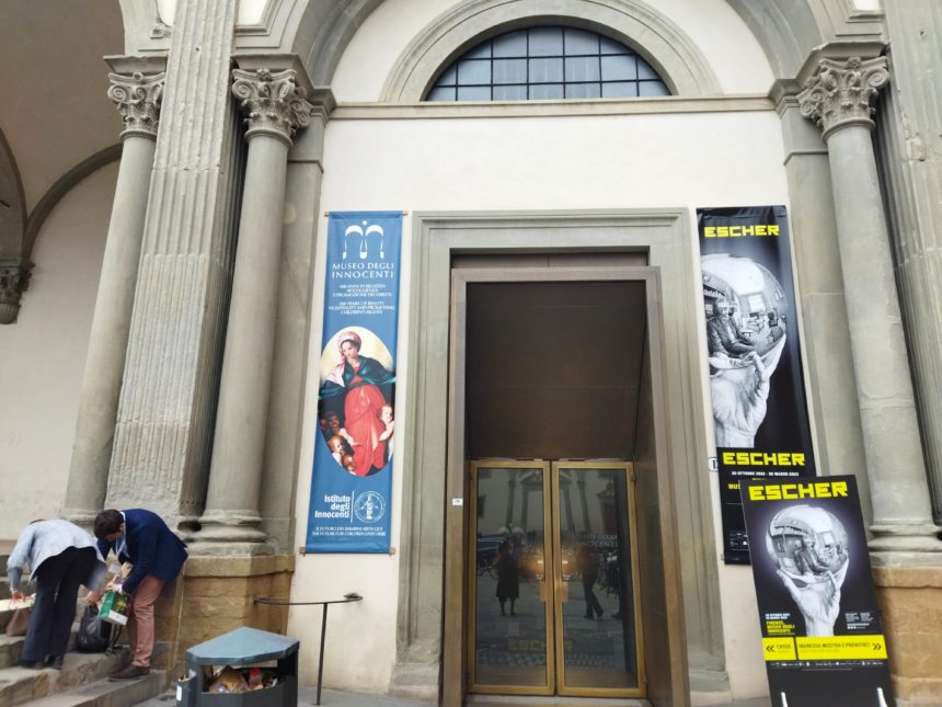 オランダ人の画家、エッシャー。だまし絵で有名な画家ですが、私は名前は聞いたことがあるとはいえ、はっきり認識したのは昨年にアブルッツォ州の村に行った時でした。その後に調べて見ると、見たことのある模様が繰り返させる絵や論理的にはあり得ない建築の絵など、見覚えのある作品が・・・そしてちょうどフィレンツェでエッシャー展をやっていることを知り、やっと先日行ってきました。場所はサンティッシマ・アヌンツィータ広場にある捨て子養育院。ここもリニューアル後に行けていなかったミュージアムなので、まさに一石二鳥!昨年の秋から始まり終了も間際の平日だと言うのに、けっこうな人でにぎわっていました。