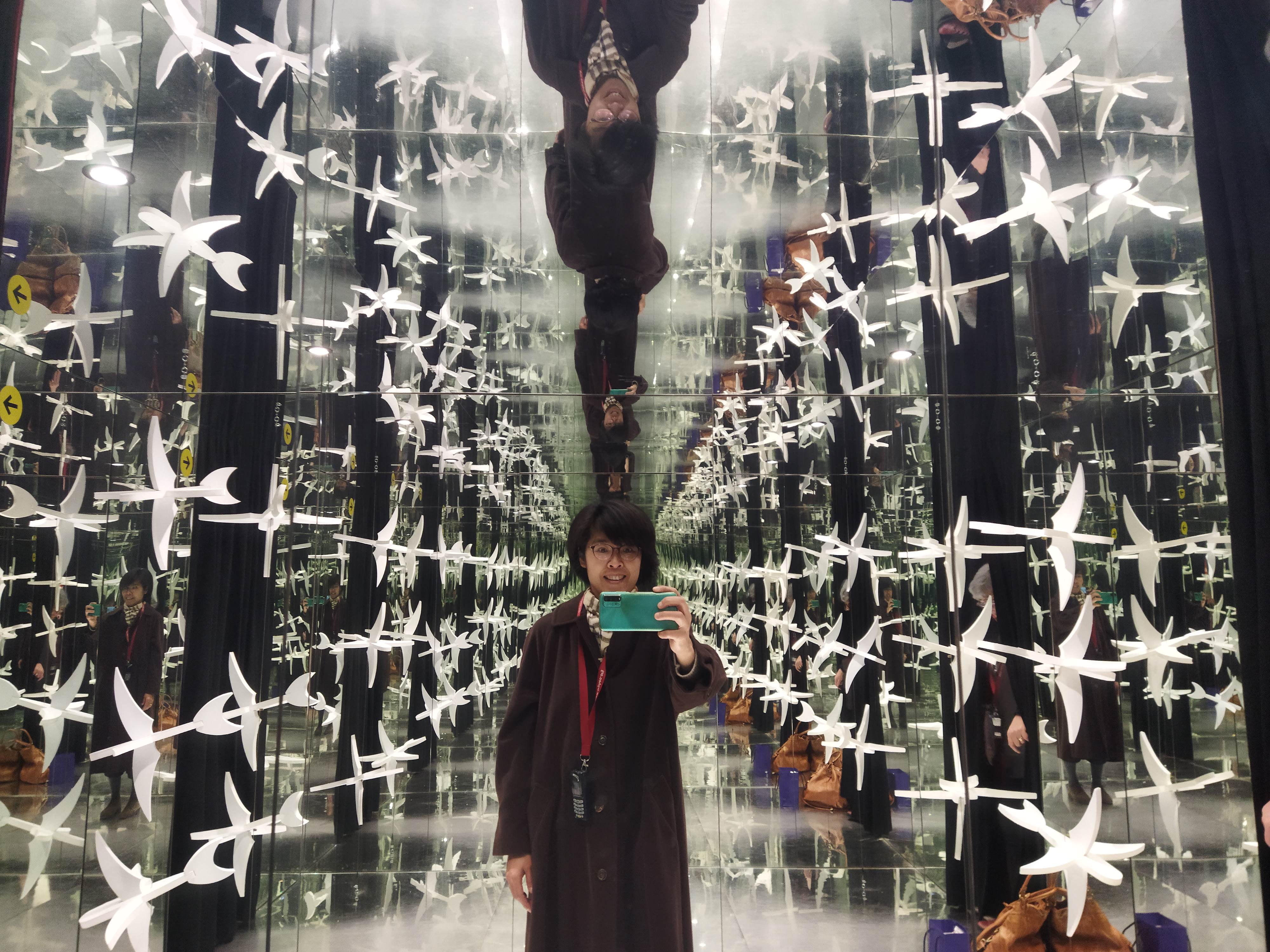 そして床に連続した模様を施した鏡の廊下では、四方を同じ柄に囲まれるという不思議体験もでき、極めつけは代表作の「写像球体を持つ手」などに自分が入り込めるセルフィーコーナーがあるところ!