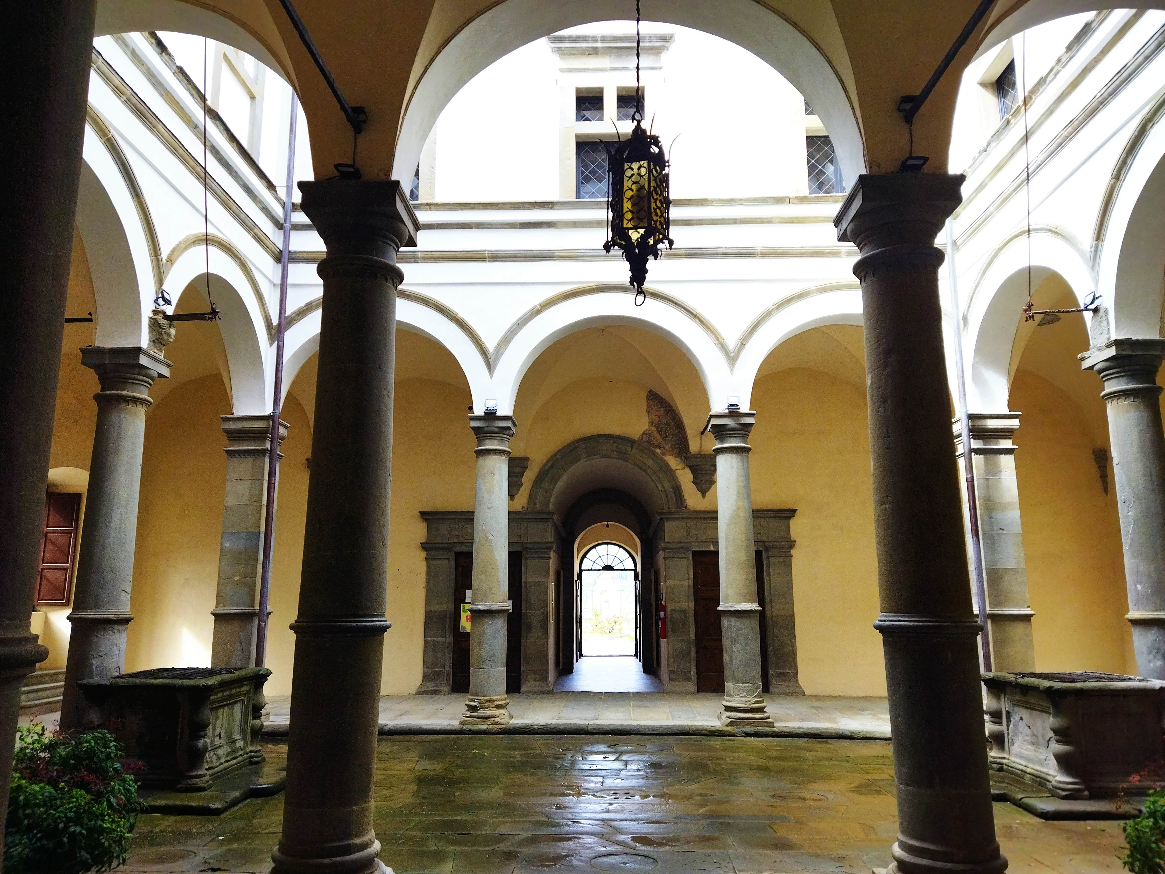 サンタゴスティーニ教会の斜め前には、14世紀建設のプレトリオ宮とその塔が残っています。プレトリオとはフィレンツェ共和国から派遣された裁判や行政を担うプレトリオの館であり、塔の壁にはプレトリオを勤めた家の紋章が飾られています。一時はサンタゴスティーニ教会のあるディ・モンテ広場まであったそうですが、縮小後、19世紀末には市の所有となり、現在は国防省警察署や市役所の事務所になっています。