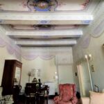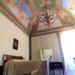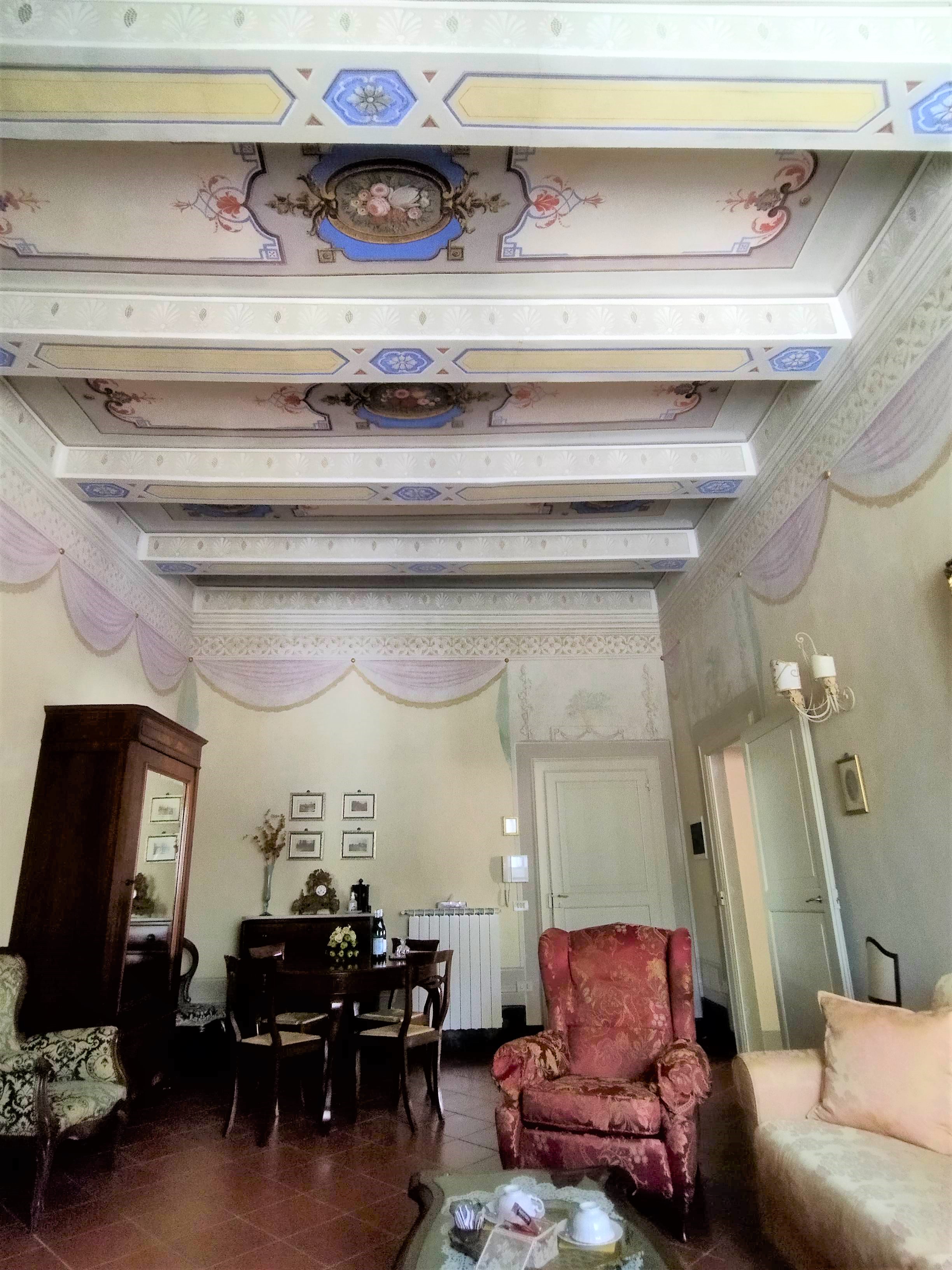 その後はなんと! ご家族のダイニングでランチを一緒に頂くことに・・・! ほかのいくつかの部屋と同じように、ムジェッロ地方の芸術家、ガリレオ・キーニ(キーニ工房やその作品についてはこちらの記事を)の天井画、トッリアーニ家の紋章の入ったプレートなど、歴史を感じされるものばかり。お食事を頂きながら、アンナマリアさんとまだまだお話は続きます。