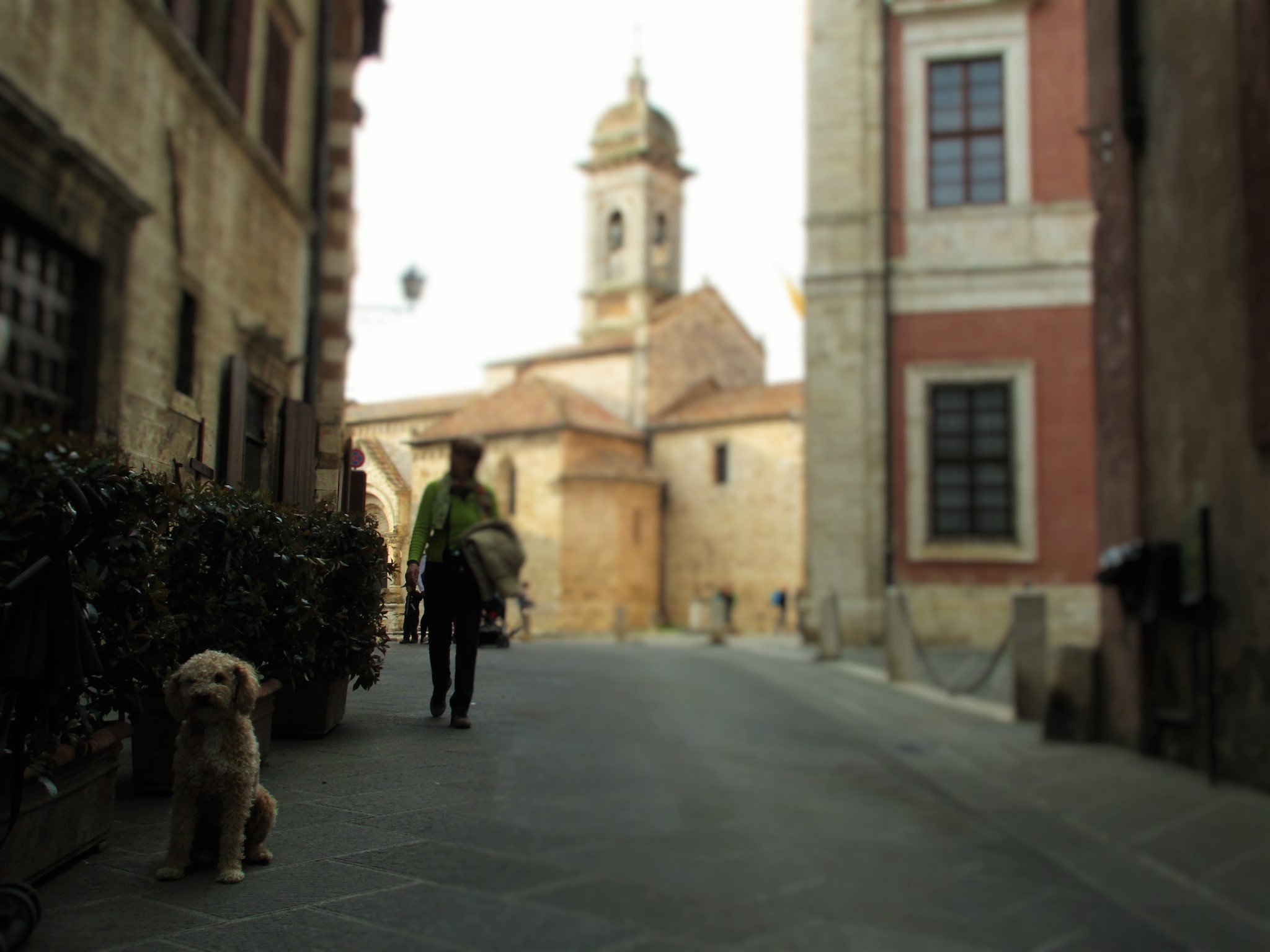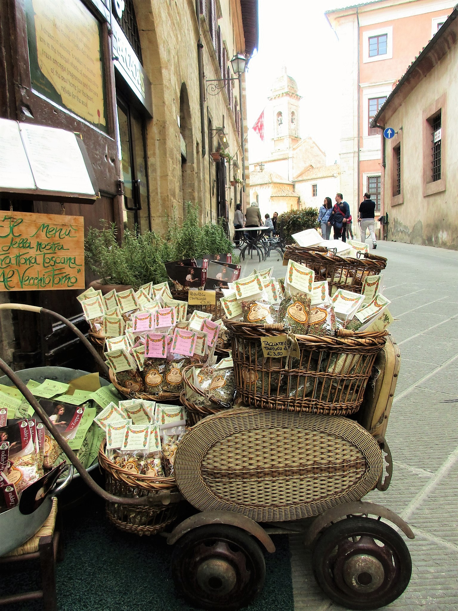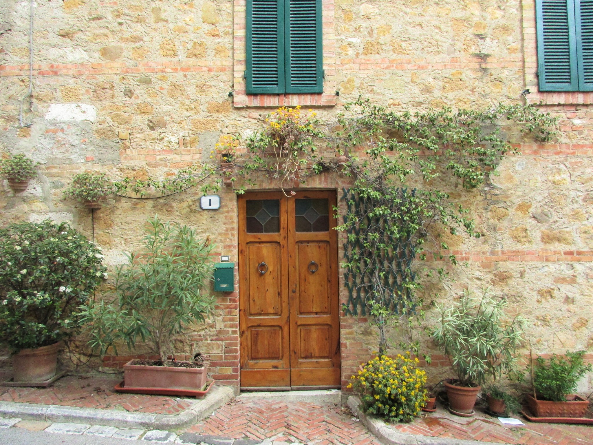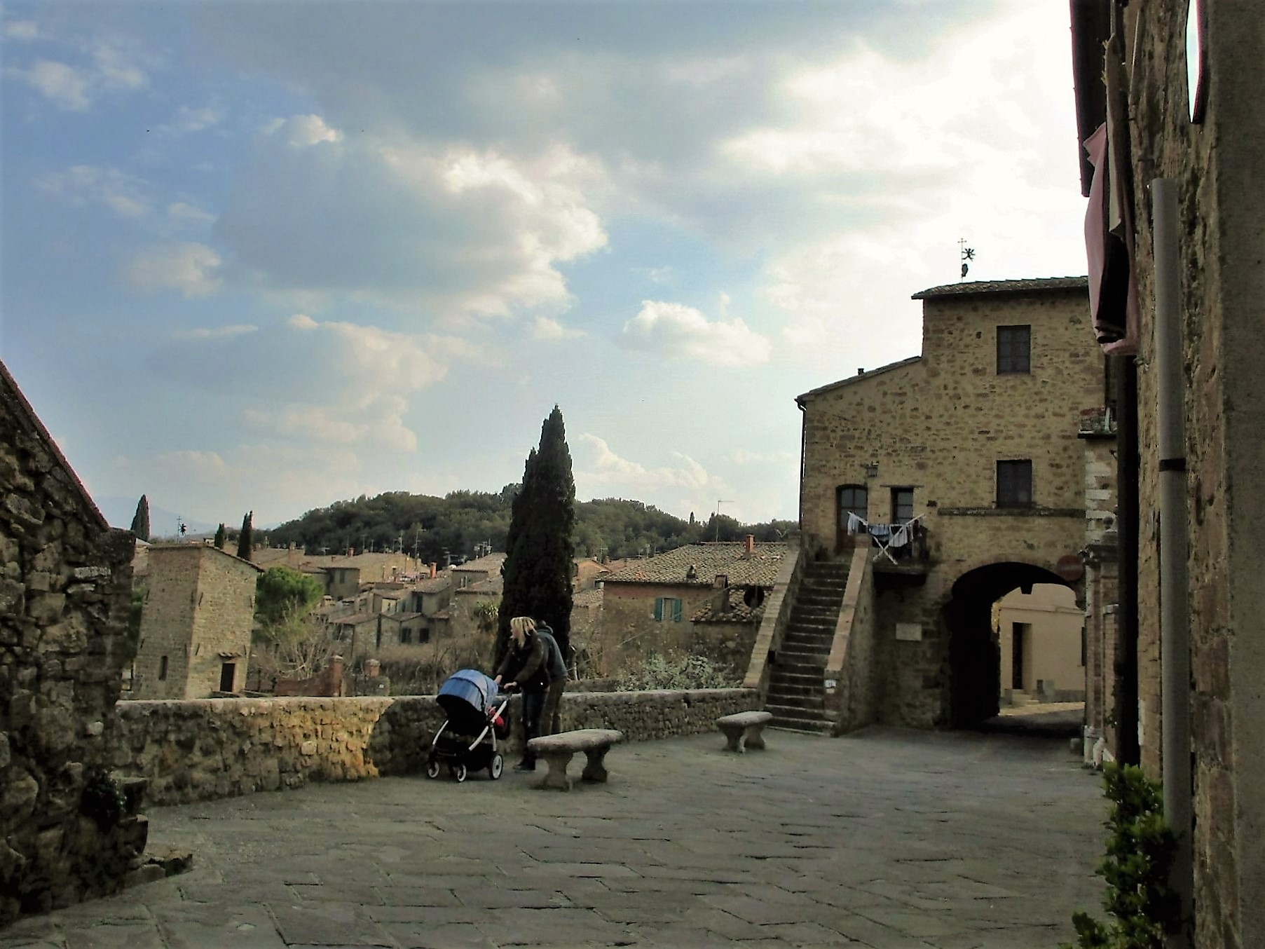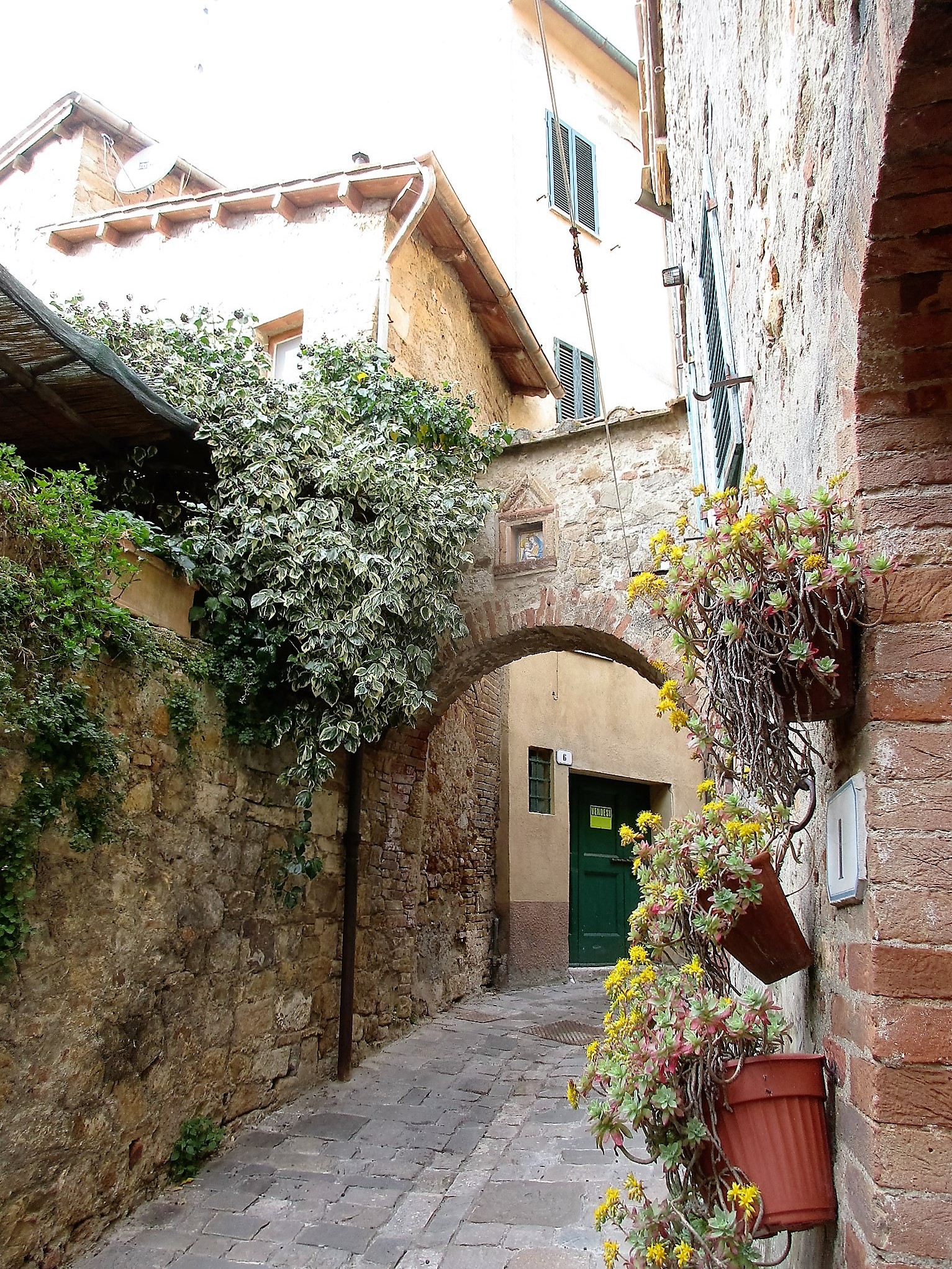 石造りの建物に飾ってある花、糸杉やオリーブに囲まれた城壁、他のトスカーナの小さな村と同じく、絵になるスポットはあちこちあります。残念なのは、せっかく風景が世界遺産のオルチャ渓谷 ド真ん中にありながら、町はそれほど高台にないせいなのか、景色を見渡せるパノラマポイントがないことでしょうか。ただ、冒頭に書いたように バスのシエナ~ピエンツァ~モンテプルチャーノ路線にあるので、車を使わず自分でオルチャを周る時、宿泊するのにも便利な町。B&Bやレストランも、旧市街の大きさから比べると充実しています。