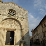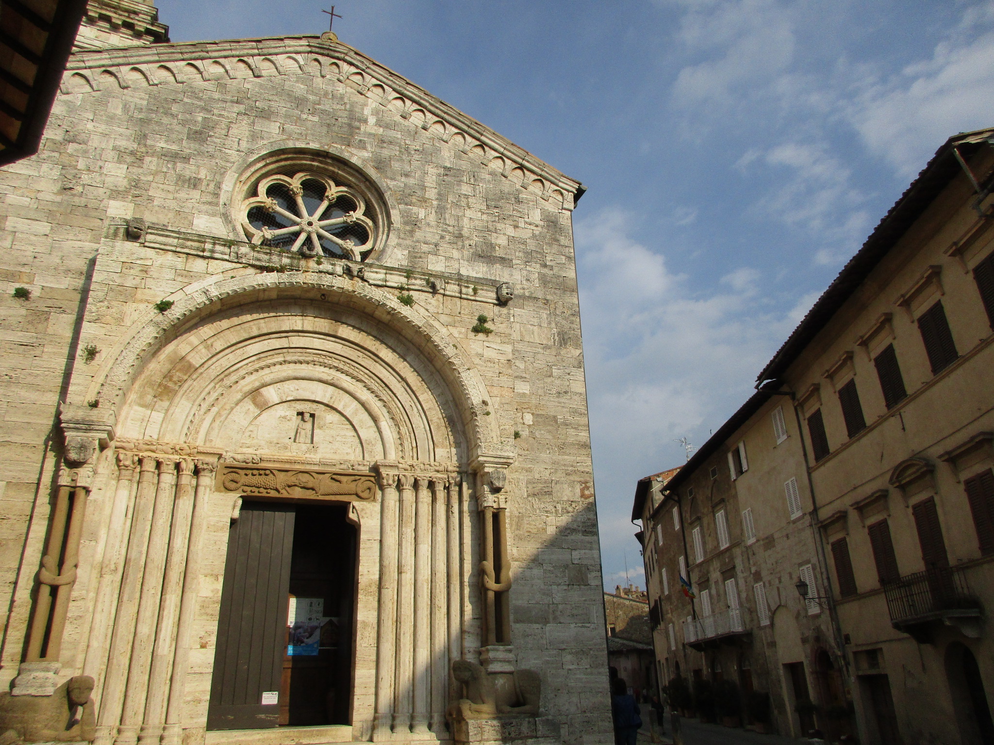 それから更にまっすぐ行くと、サン・クイーリコ・ドルチャのシンボル的な教会が見えてきます。コレッジャータ =(司教座聖堂はないが)聖堂参事会に管理される、この教会の起源は8世紀の教区教会で、正式名称はクリーリコの聖人たちとジュリエッタ教会(オープン時間は夏季:9-19、冬季:9-18)。13世紀初頭にほぼ現在の姿になりましたが、その後も拡張が行われ、側面の正面に近い方の扉は、当時シエナのドゥオモ建設にも携わっていた彫刻家・ ジョヴァンニ・ピサーノ の手によるものです。