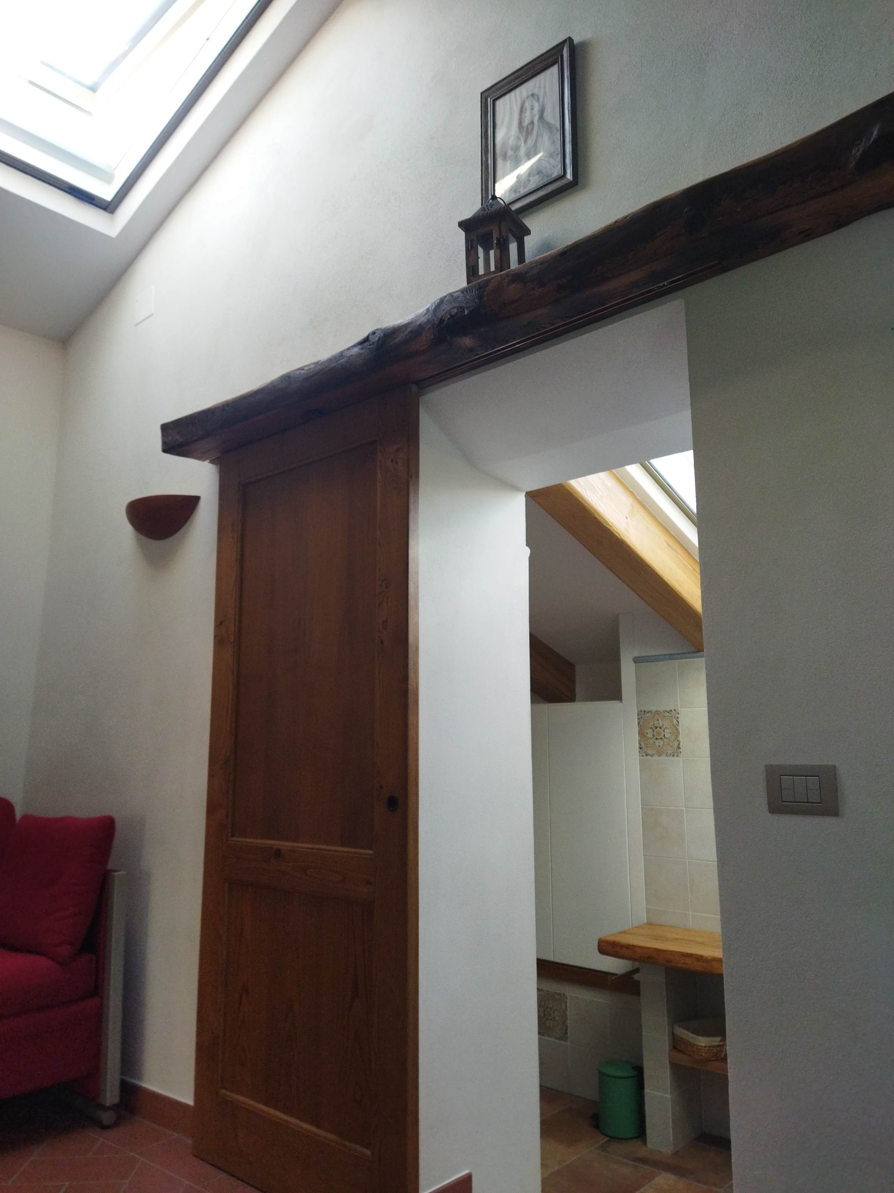 アパート入ってすぐはダイニングキッチン。必要な調理器具やお皿、基本調味料(塩、こしょう、砂糖、酢、そしてオリーブオイルは自家製!)も完備、各種紅茶やカッフェ、はちみつも。皿洗いの洗剤や蜜蝋ラップもアンナが作ったものです。写真には写っていませんが、シングルベッドにもなるソファーもあり。