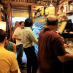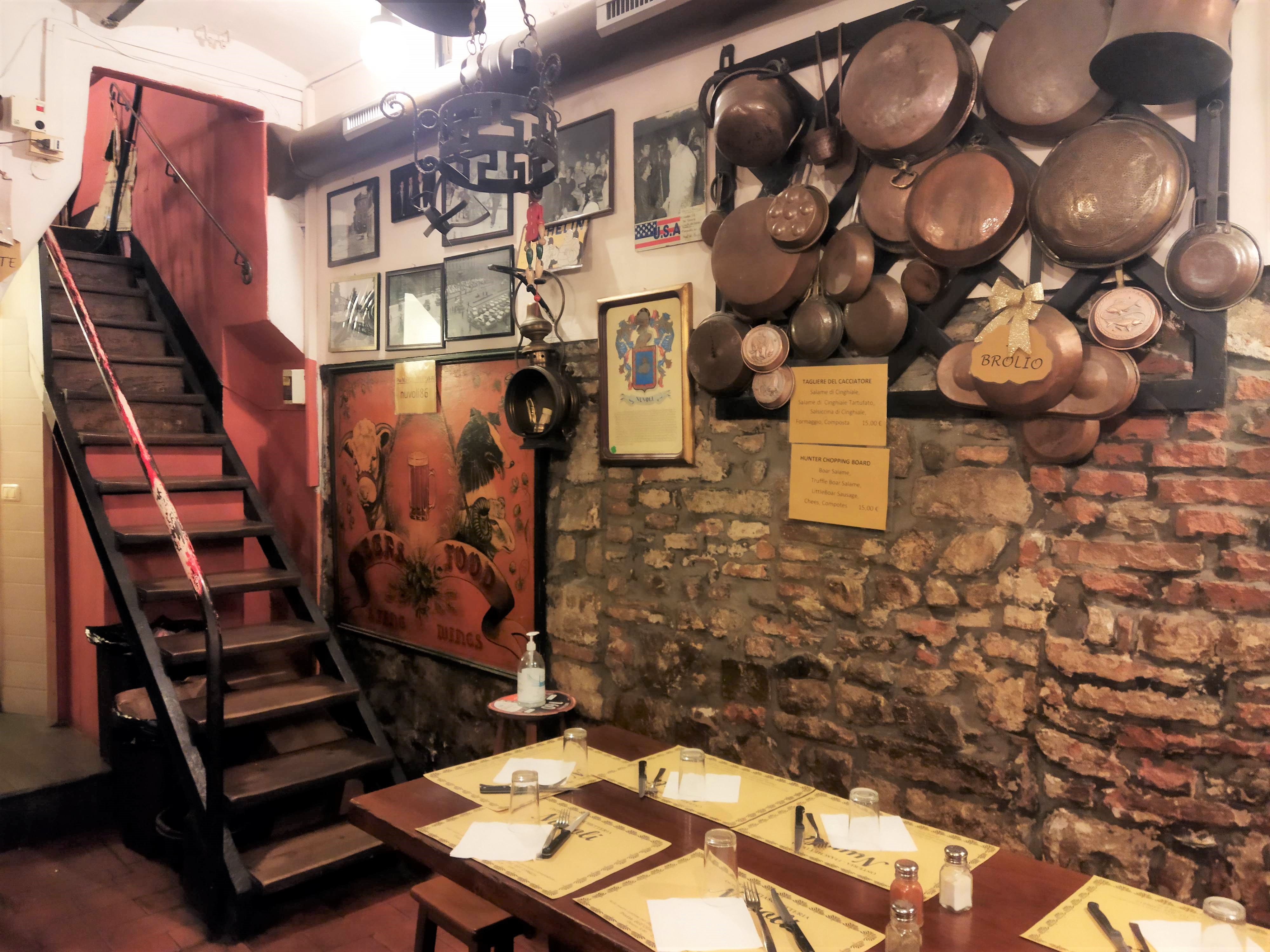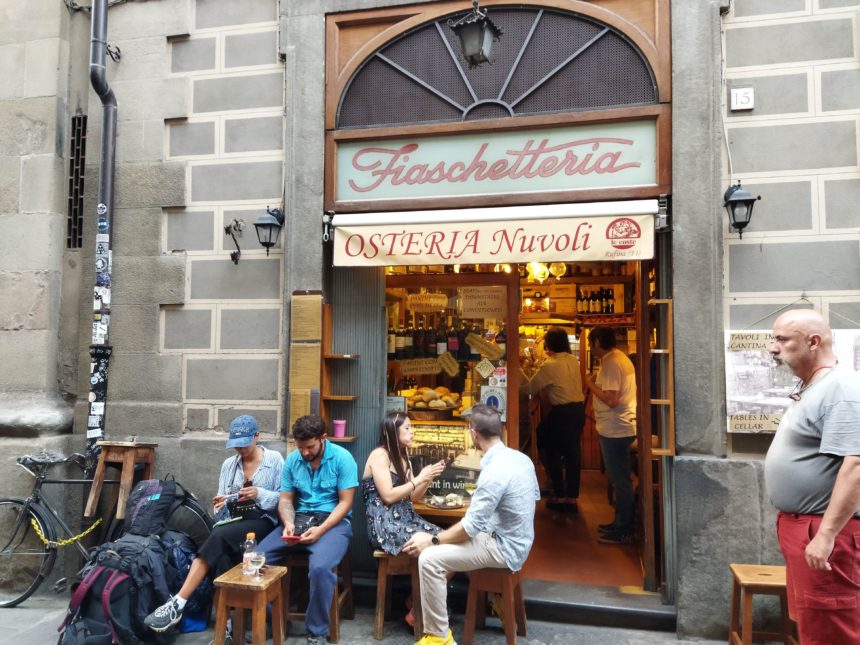 ドゥオモに近い路地にある小さなお店、フルネームだと、Fiaschetteria Osteria Nuvoli(フィアスケッテリア・オステリア・ヌ―ヴォリ)。オステリアはだいぶん知られてきましたが、大衆食堂のこと。一方フィアスケッテリアは、フィアスコ=ワインを入れる丸みのあるボトル、つまり、ワインをカウンターで提供するお店、つまり立ち飲み屋(笑)。そんなゆるい雰囲気は入口からも漂っていて、入ったらまさにカウンターでワインを飲むオッサンやら、パニーノをテイクアウトする人でにぎわっています。私も軽く食べたいときにパニーノと赤ワインをテイクアウトして、外の丸椅子で食べることは何度かあったのですが、今回、初めて地下のテーブル席でお料理を食べに行きました。