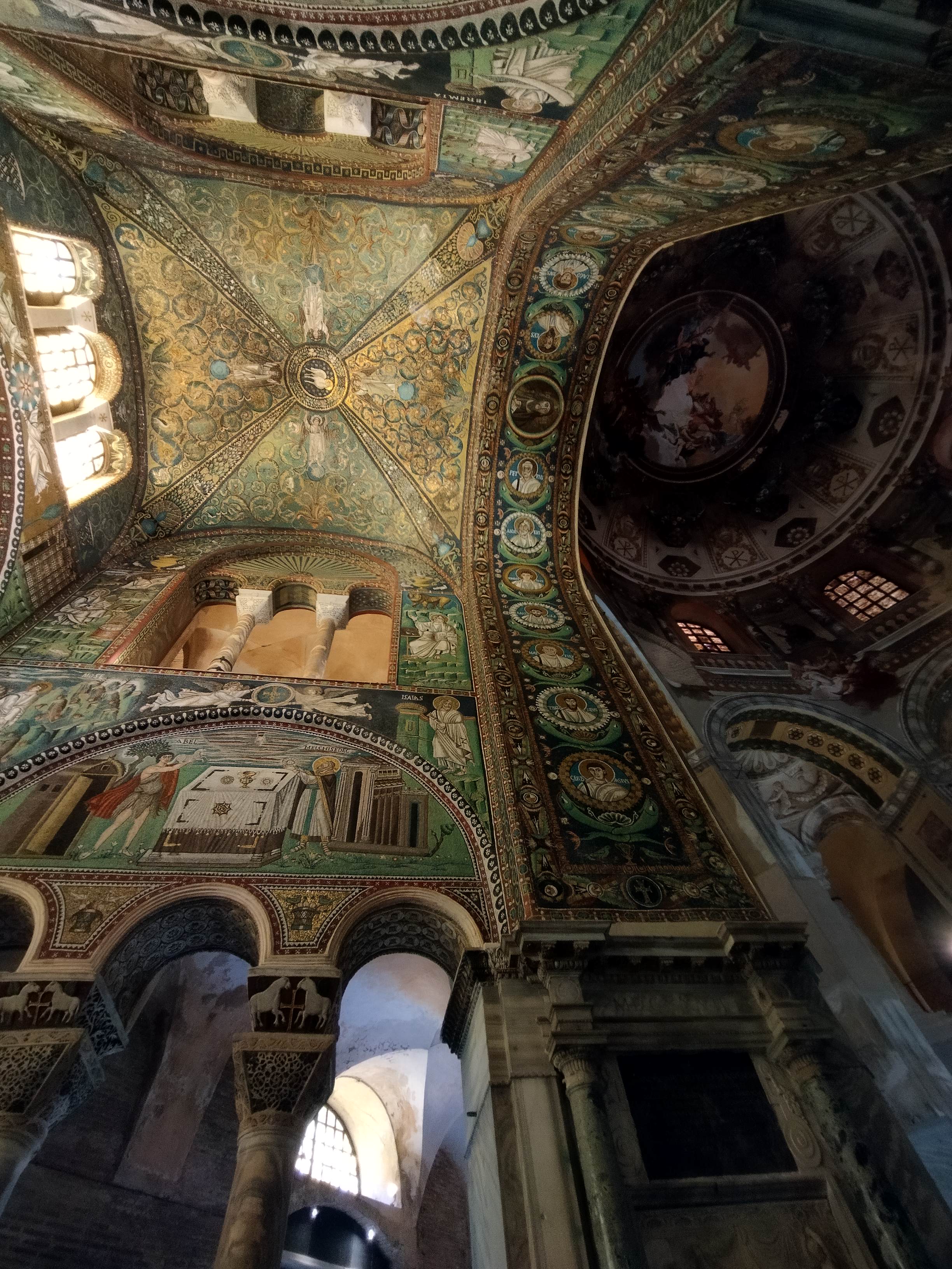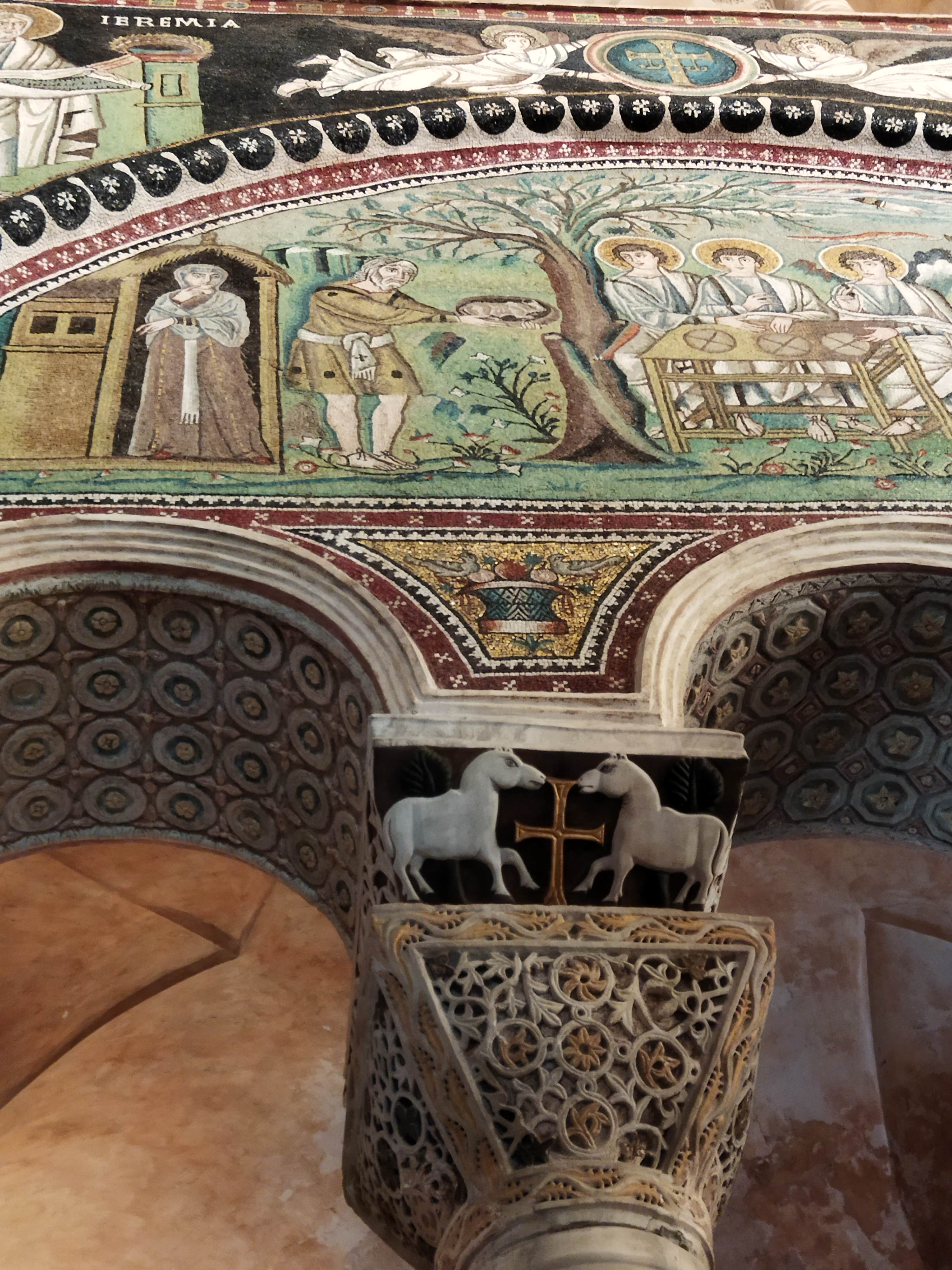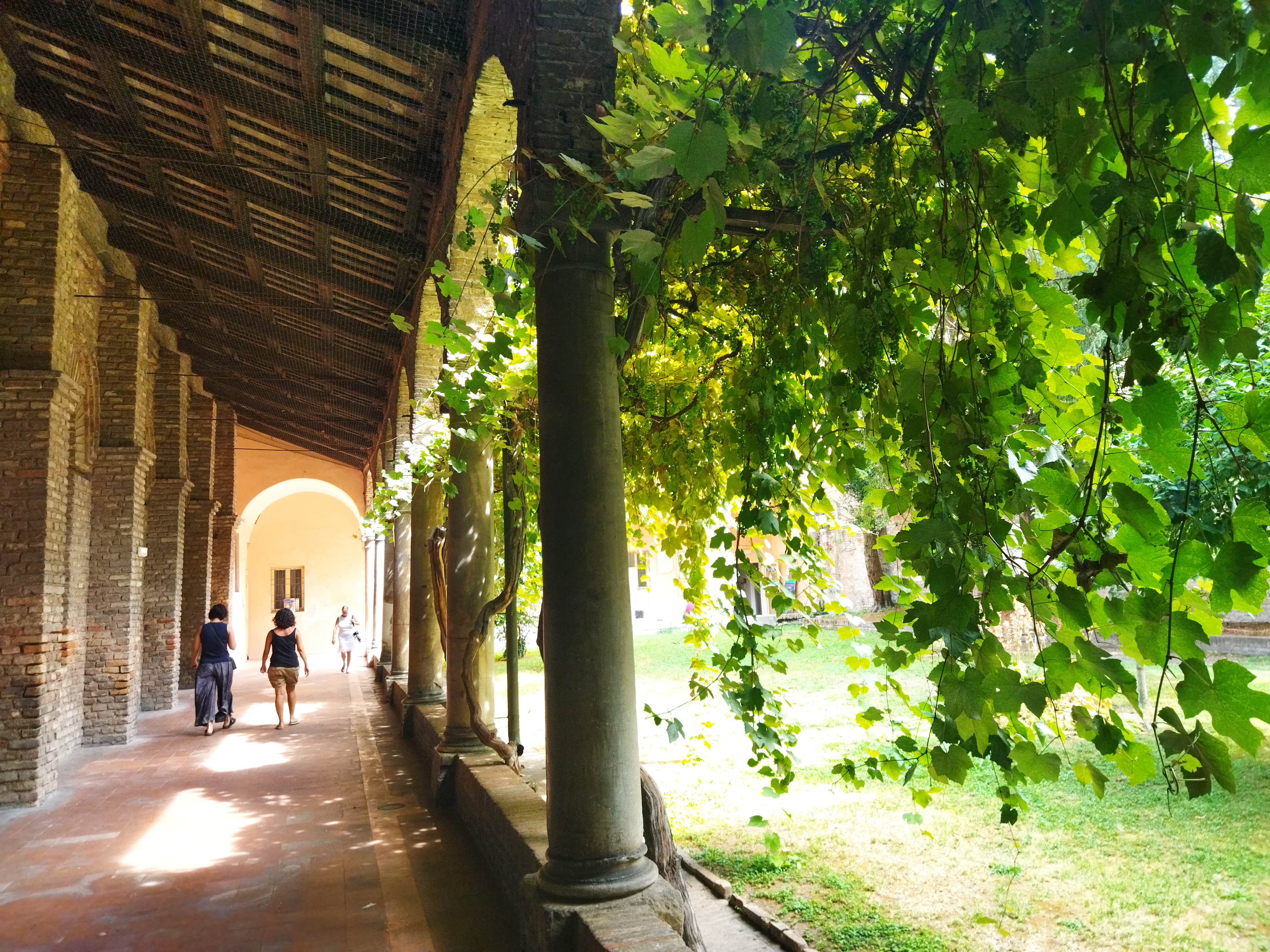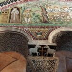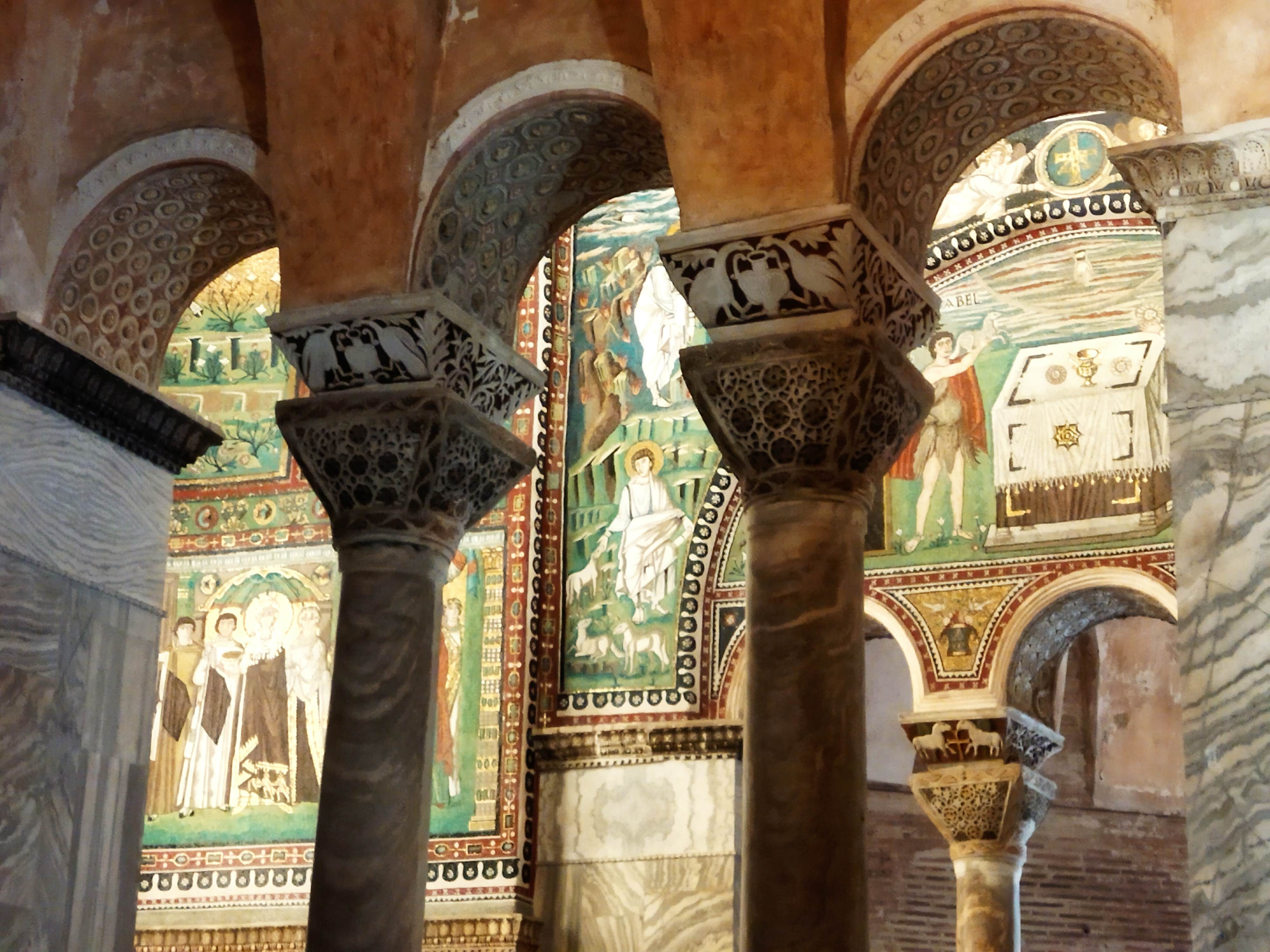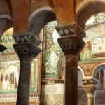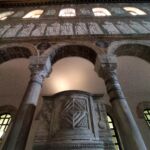5世紀末~6世紀前半、東ゴート国王・テオドリックの建造で、3身廊のアーチの上にずらりと並ぶ殉教者たちが印象的です。かつてここの床に敷き詰められていたモザイクは、度々起こった高潮の被害のために、16世紀に床面が1.2m以上も持ち上げられたので、残念ながら見ることはできません。右隣、出口になっている中庭もとても素敵です(ギャラリーに写真あり)。