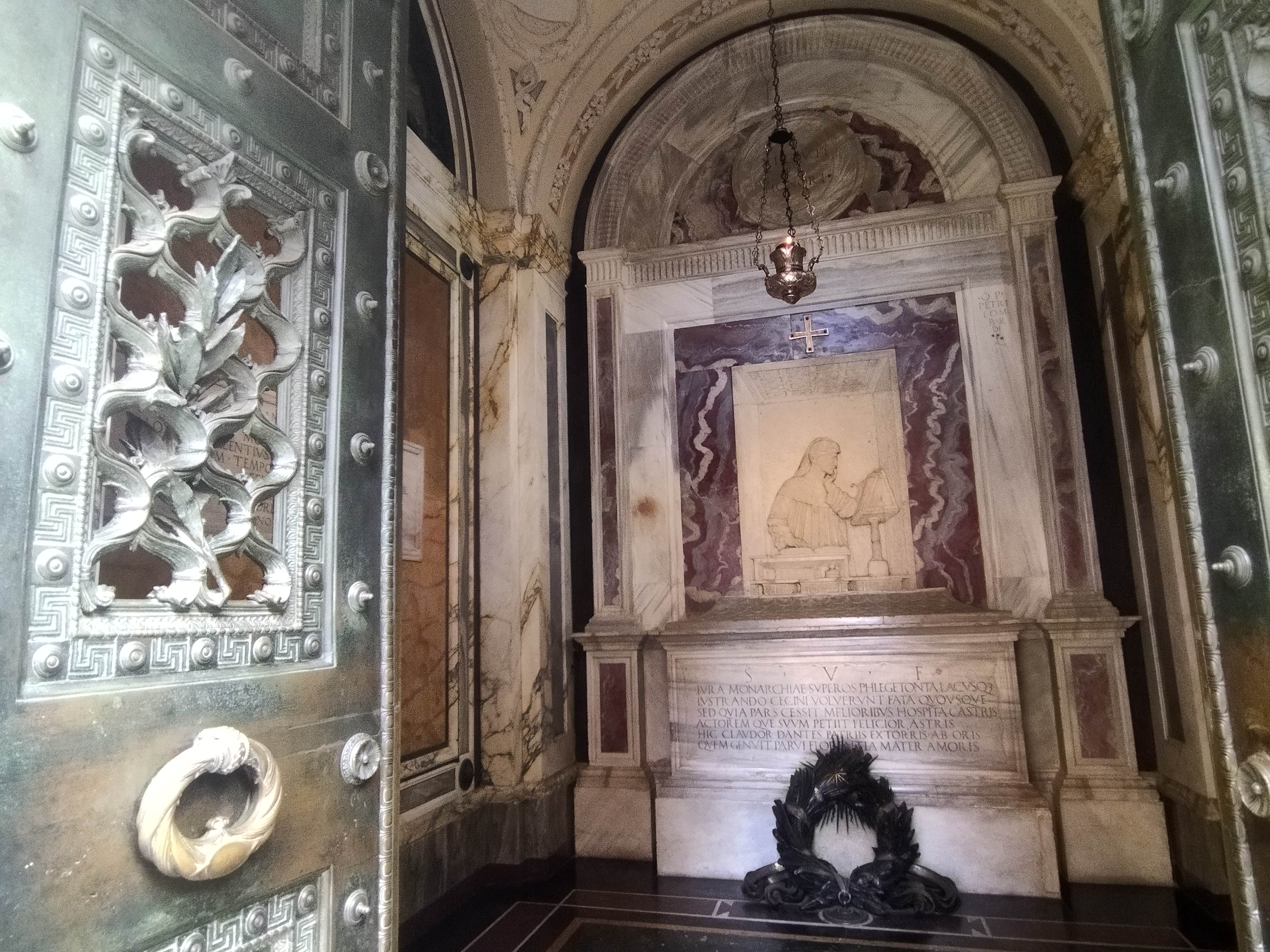 ラヴェンナには、当時は俗語であったイタリア語で「神曲」を書き、偉大な詩人・イタリア語の父として有名な ダンテ・アリギエーリのお墓 があります。あれ?ダンテはフィレンツェ生まれ・育ちだし、フィレンツェのサンタ・クローチェ教会にもお墓があるのでは?と思った方もいらっしゃるでしょう。ダンテはフィレンツェ共和国の政治にグエルファ党(教皇派)として参加していましたが、ギベッリーニ党(皇帝派)との政治紛争でフィレンツェから永久追放され、最後はラヴェンナ領主に招かれてラヴェンナに住み、ここで生涯を終えたのです。1321年にダンテが亡くなった時はラヴェンナ領主により小さな礼拝堂が建設され、ラヴェンナがヴェネツィア共和国統治下にあった1483年、現在も墓にあるレリーフが制作されます。1500年~1700年にフィレンツェとラヴェンナで彼の遺骨を巡って抗争があった間、それはフランチェスコ会の修道士によって守られ、1782年に現在のお墓となりました。