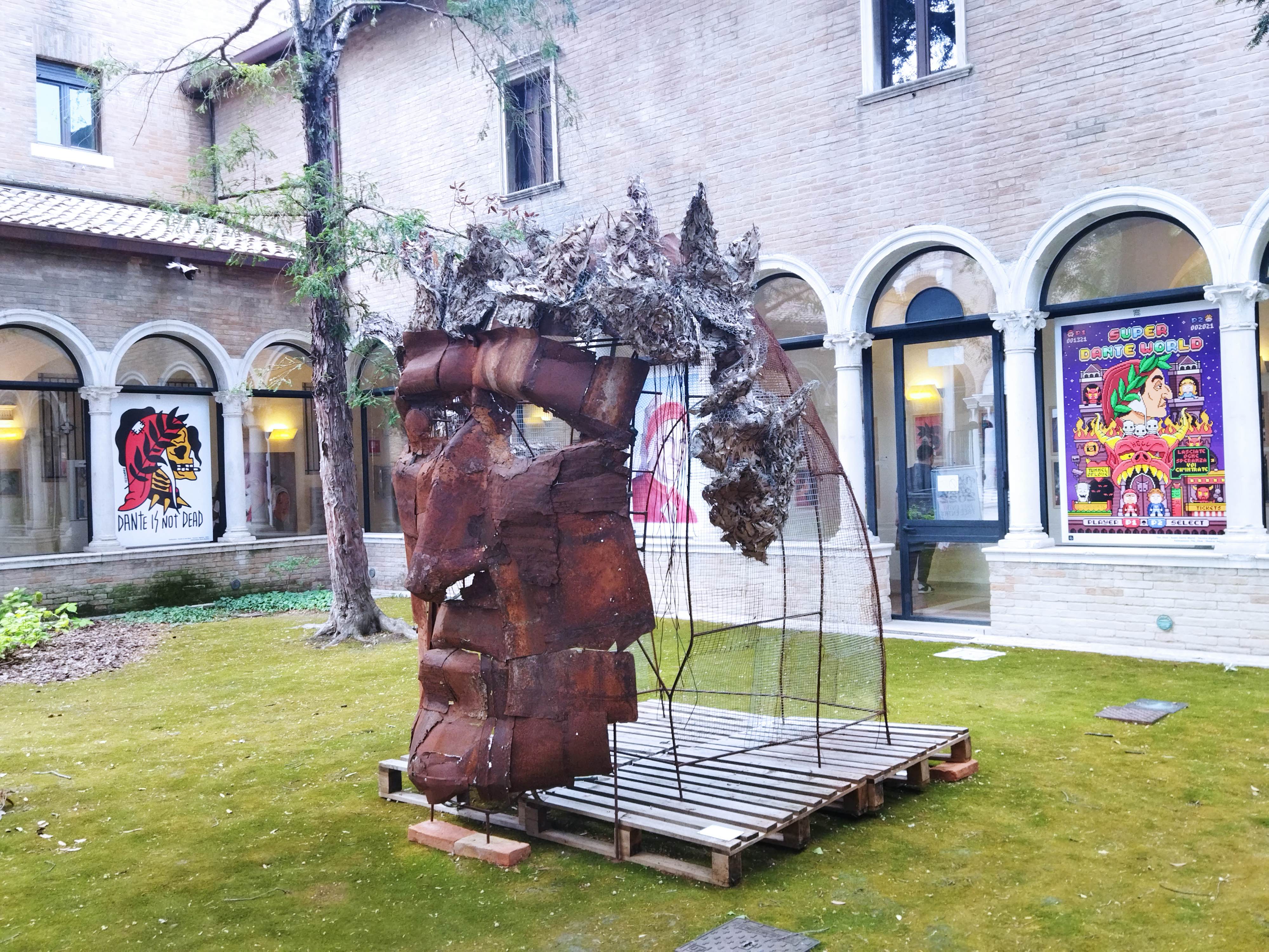 その裏には ダンテの家と名付けられた博物館 が。ダンテにまつわる美術品や資料が展示されていますが、博物館に入らずとも、中庭には原題アーチストによるダンテの肖像画や彫刻があってとても楽しいです。