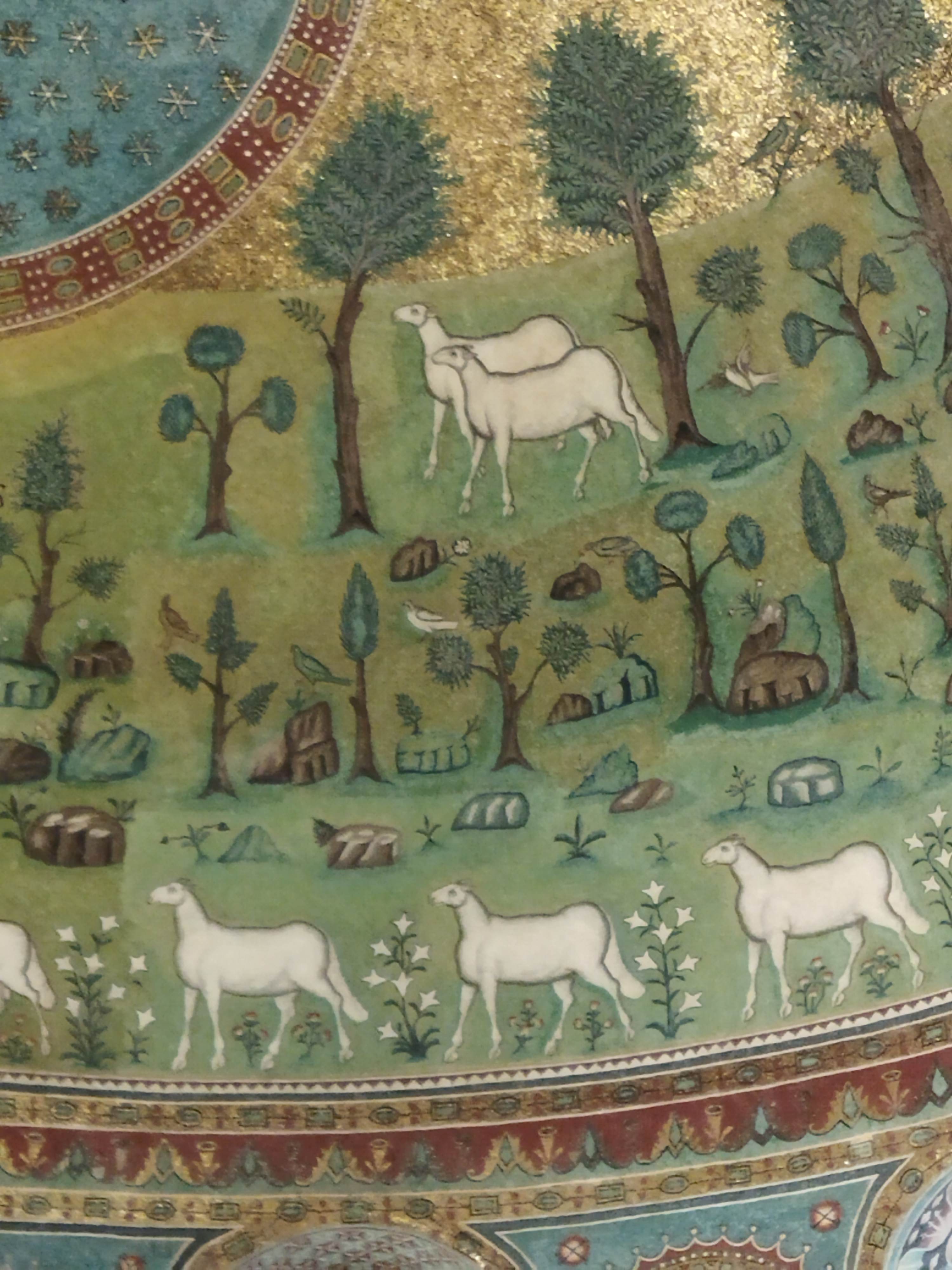 こちらは6世紀半ばの建設。共通パスには入ってないものの、どうしても見たかったには後陣の半ドーム天井キリストの変容」で、可愛い羊や緑がいっぱい。牧歌的で心が和みます。