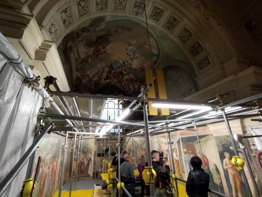 サンタ・マリア・デル・カルミネ教会の右翼廊にあるブランカッチ礼拝堂は、マゾリーニ、マザッチョ、フィリッピーノ・リッピによって1428年~1485年にかけて完成された「聖ペテロの生涯」によって彩られ、ルネサンスの先がけとなる画法や当時のフィレンツェの様子が垣間見られることで有名です。1990年に大がかりな修復によって鮮やかな色がよみがえりましたが、それから30年以上たった今、分析と必要があれば修復を行うための足場が設けられ、通常の見学は中止されています。しかし足場がある今だからこそ、今まで見上げていたフレスコ画を至近で見られる!という期間限定、生きているうちにもう機会はないかも?というのもあり、こちらも鼻息荒く申し込んできました。さすがに希望者が多くて私がフィレンツェに行ける日に予約をゲットするのが難しかったのですが、ブランカッチ礼拝堂のスタッフの方が親切で、希望日に残席わずかのところに滑り込むことができました。