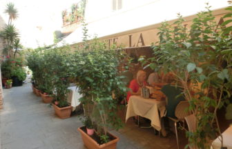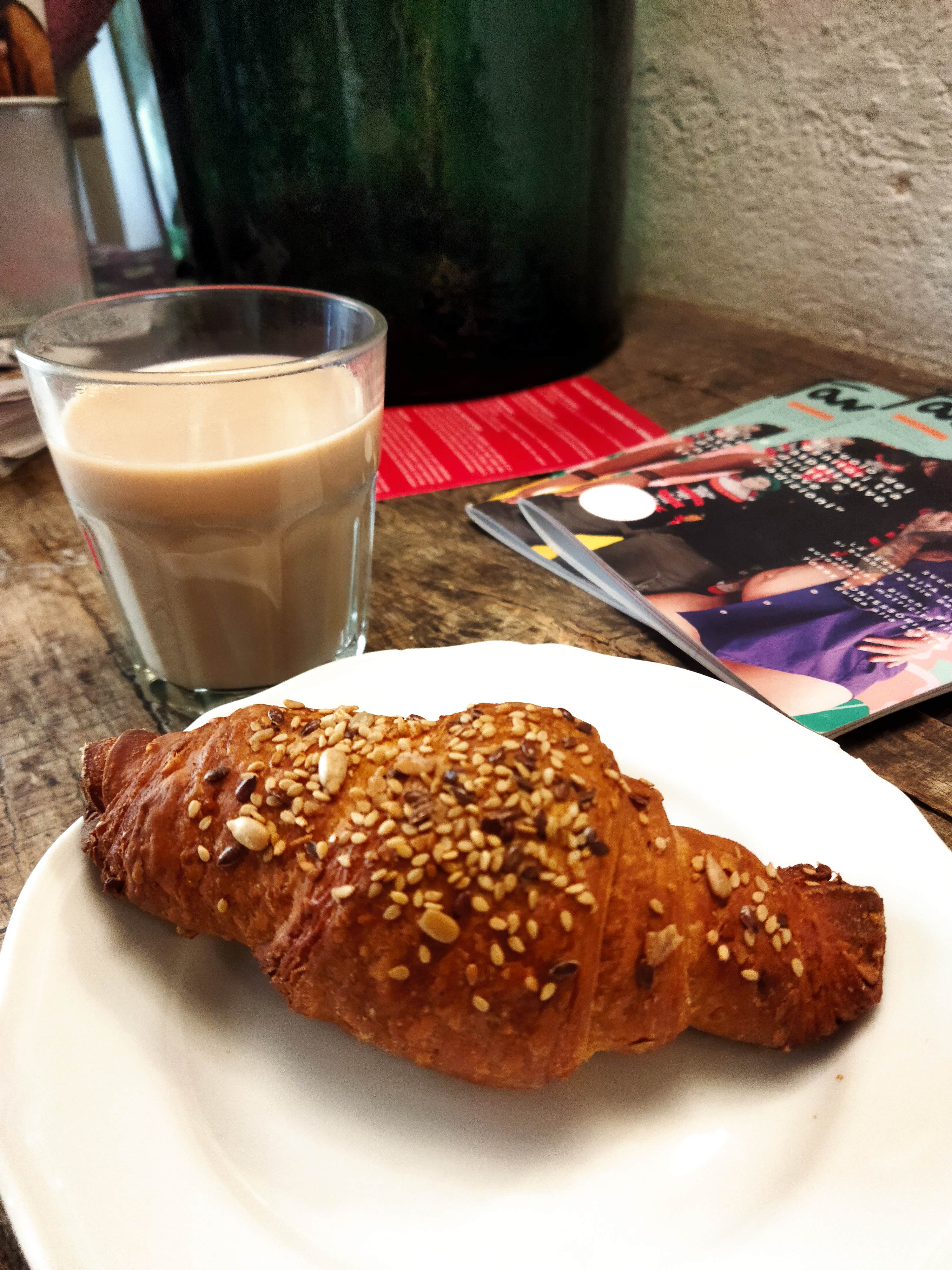 奥の厨房で焼かれたイタリア流朝食の定番・美味しそうなブリオッシュ(クロワッサン)各種に、パウンドケーキ、タルト、マフィンなどもいろいろ。いくつでも頼みたいものがありましたが、遅めの朝食でランチも2時間後くらいなので、シンプルに全粒粉のブリオッシュにしました。もちろんサックサクでトッピングされたゴマやシード類が香ばしい。1つだけ注意!はカップチーノは提供しておらず、私はカッフェラッテにしました。あとで周りを見ると、アメリカンコーヒーもあるようで、久々にそれにしておけばよかったかな、とちょっと後悔。