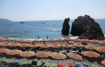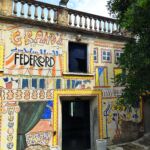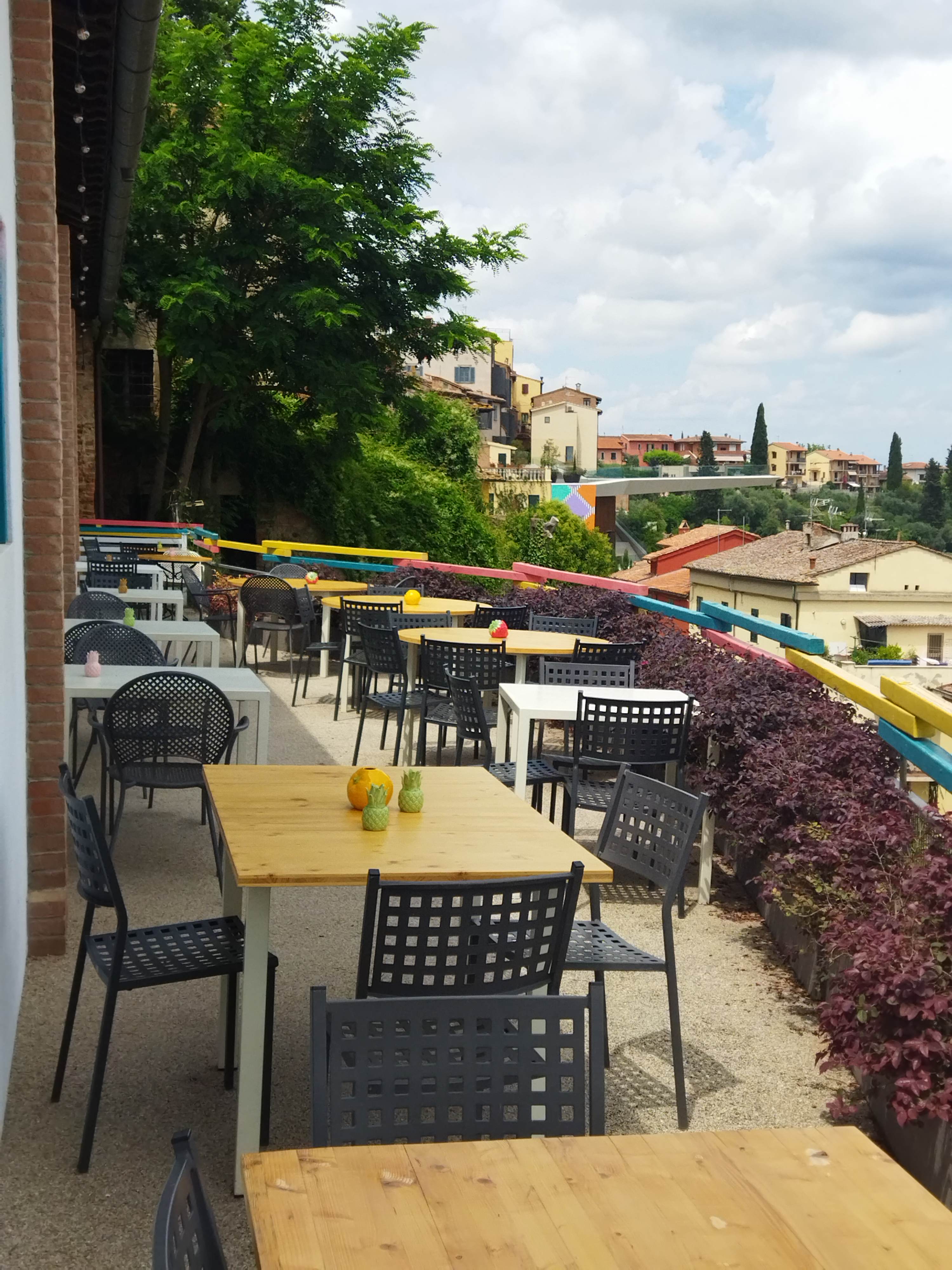このテラスはPalazzo senza tempoからしか行けないと思って開館時間を調べて行ったのですが、近くの路地からいきなりこのテラスに出てびっくり。そう建物に入らなくても両脇の路地から直接このテラスに行くことができます。そう考えると、早朝や夕暮れに行ったらどれだけ美しいのだろうか・・・それだけで、ペッチョリに泊りたいな、と思ったほど。2枚目の写真は下にあるカフェからテラスの下を見上げたものです。カフェも屋外席がありますが、屋内も全面ガラス張りのため景観を十分楽しめます。