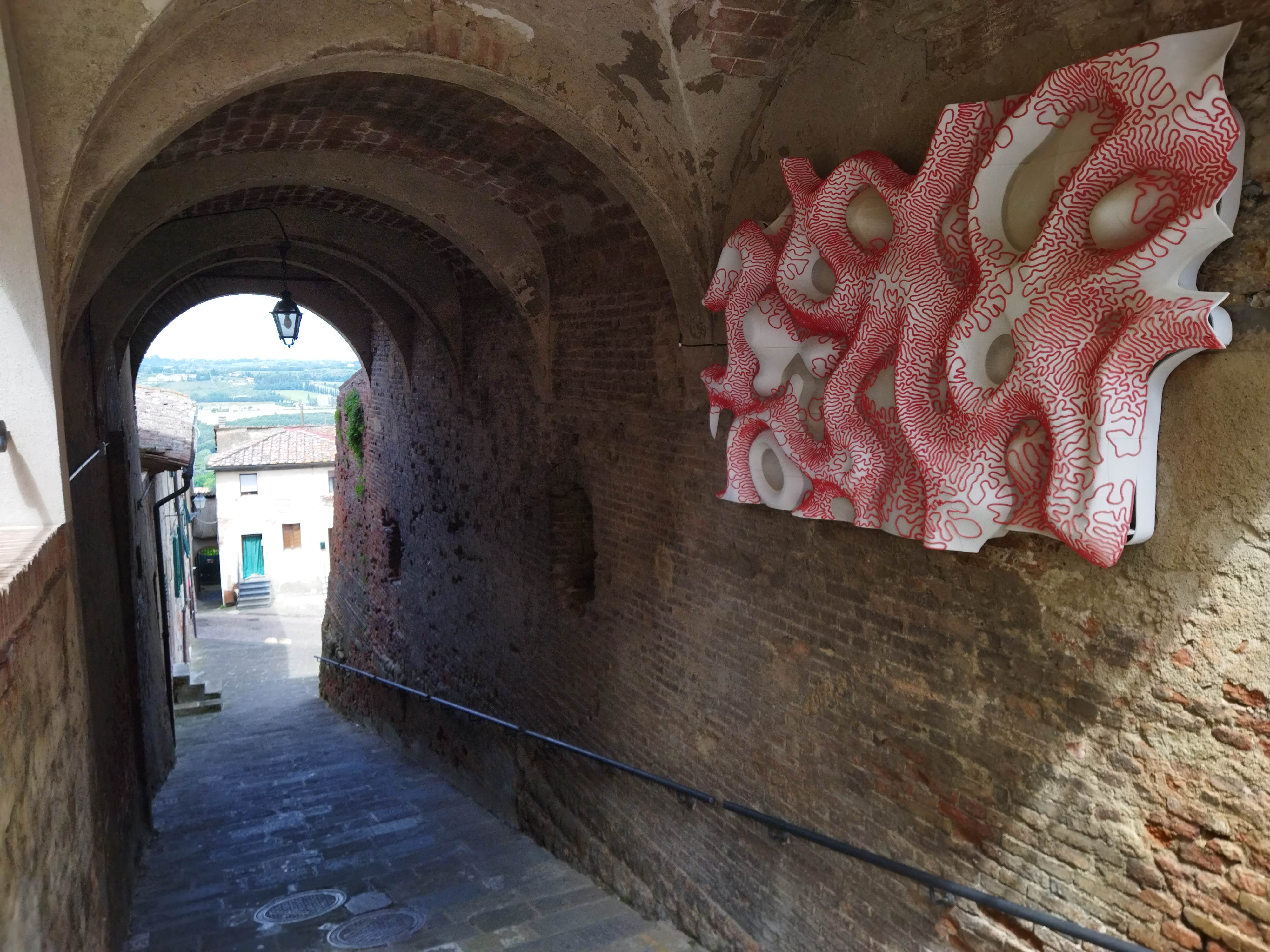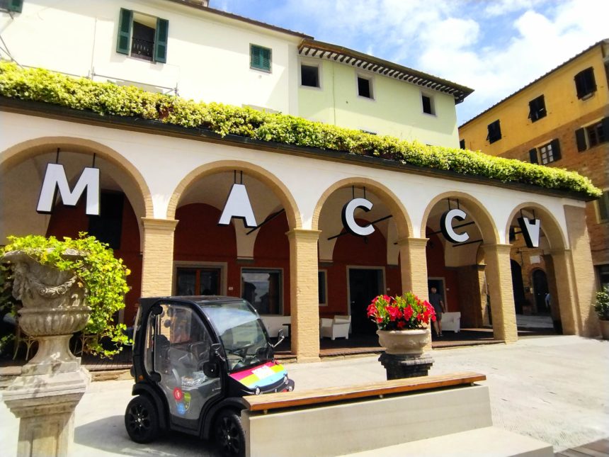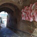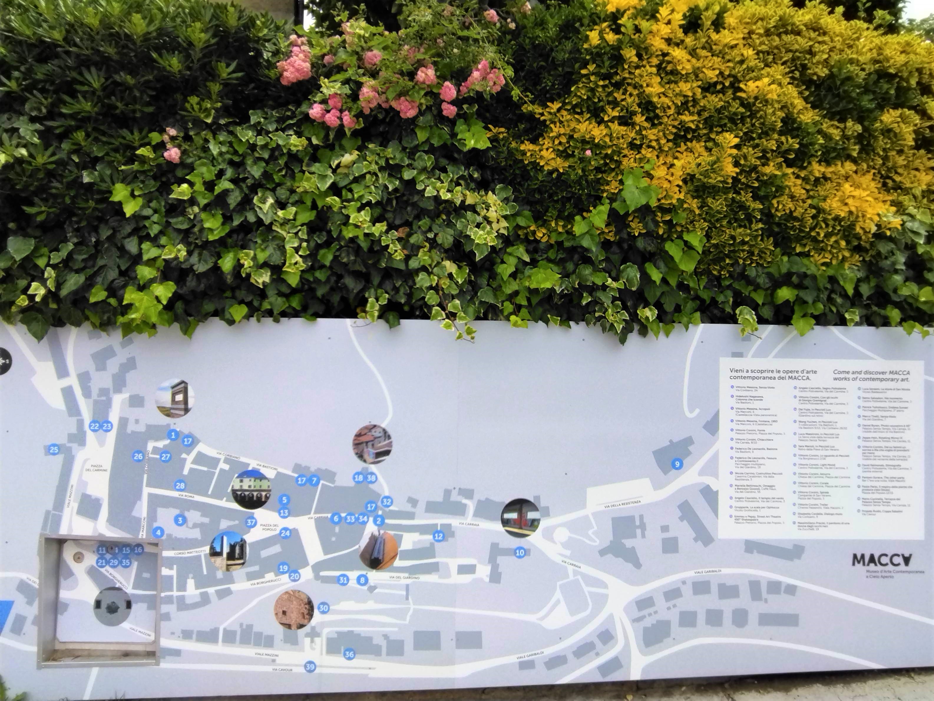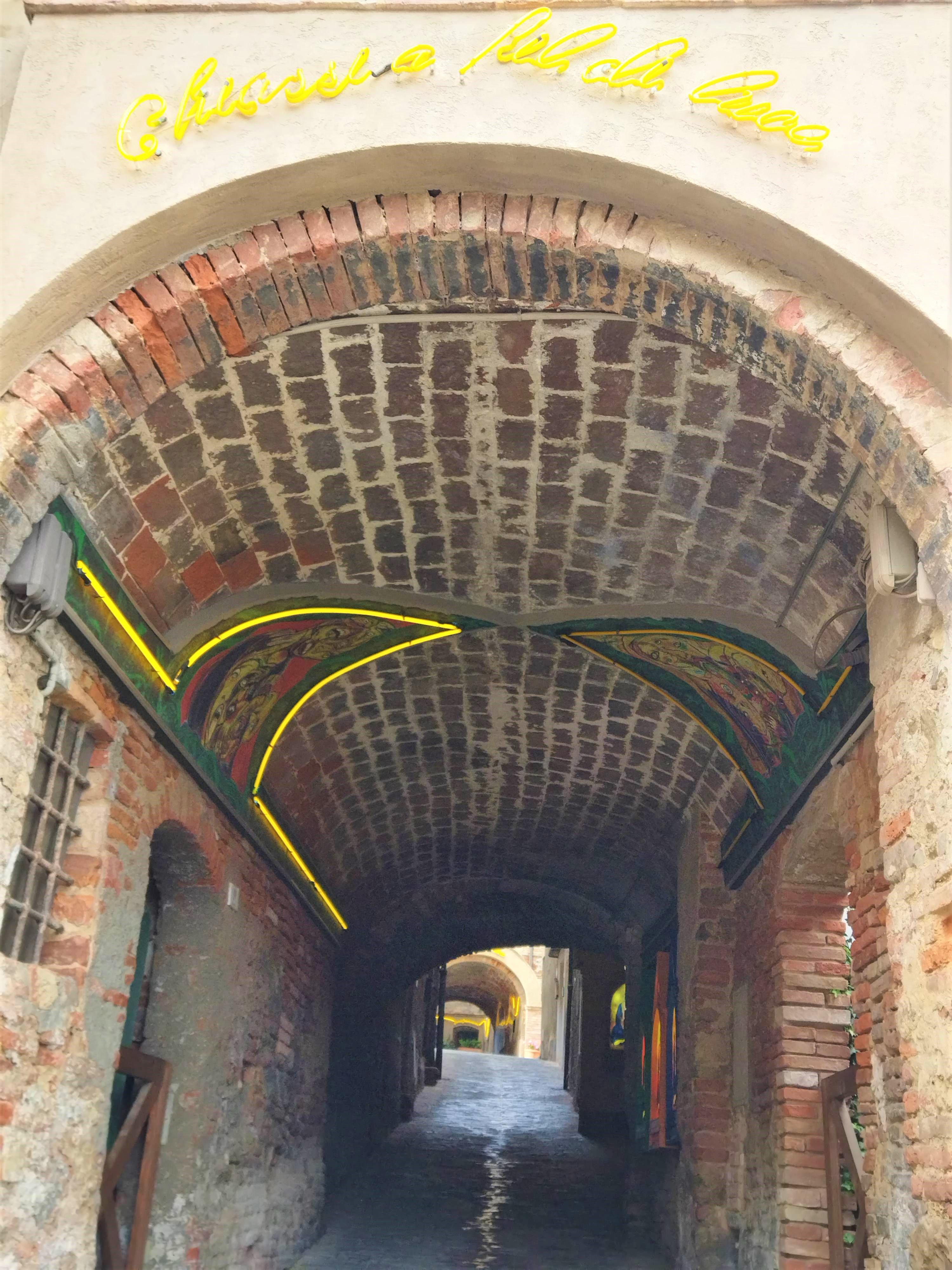 私の中では行った村が少ないピサ県ですが、前々からとても行ってみたかった村がこのペッチョリです。実は10年以上前に息子たちのためにペッチョリ近郊の恐竜公園に行き、その後にちょっとだけペッチョリの村も散策したのですが、あまりはっきりした記憶はなく・・・しかしこの数年にSNSで見る斬新な村の様子に驚き、ちょっと調べてみると面白いことが分かりました。それは、TOP写真のアーチの下にある頭文字「MACCA=Museo d’Arte Contemporanea a Cielo Aperto」、つまり、屋外の現代アートミュージアム。始まりはなんと30年近く前、村のプロモーションツールとして採用されたのは「現代アート」。今ある資源を活かすのではなく、新しいものを取り入れるのは、意外とクローズなイタリア文化の中ではそうそう簡単ではなかったと思います。特にこんな小さな村、中世の面影を残す村では、景観問題であるとか、市民や市議会でも反発があったのでは?と想像に難くありません。実際、初期にインスタレーションされたのは、村に自然に溶け込むようなレンガ色の作品がほとんどでした。