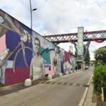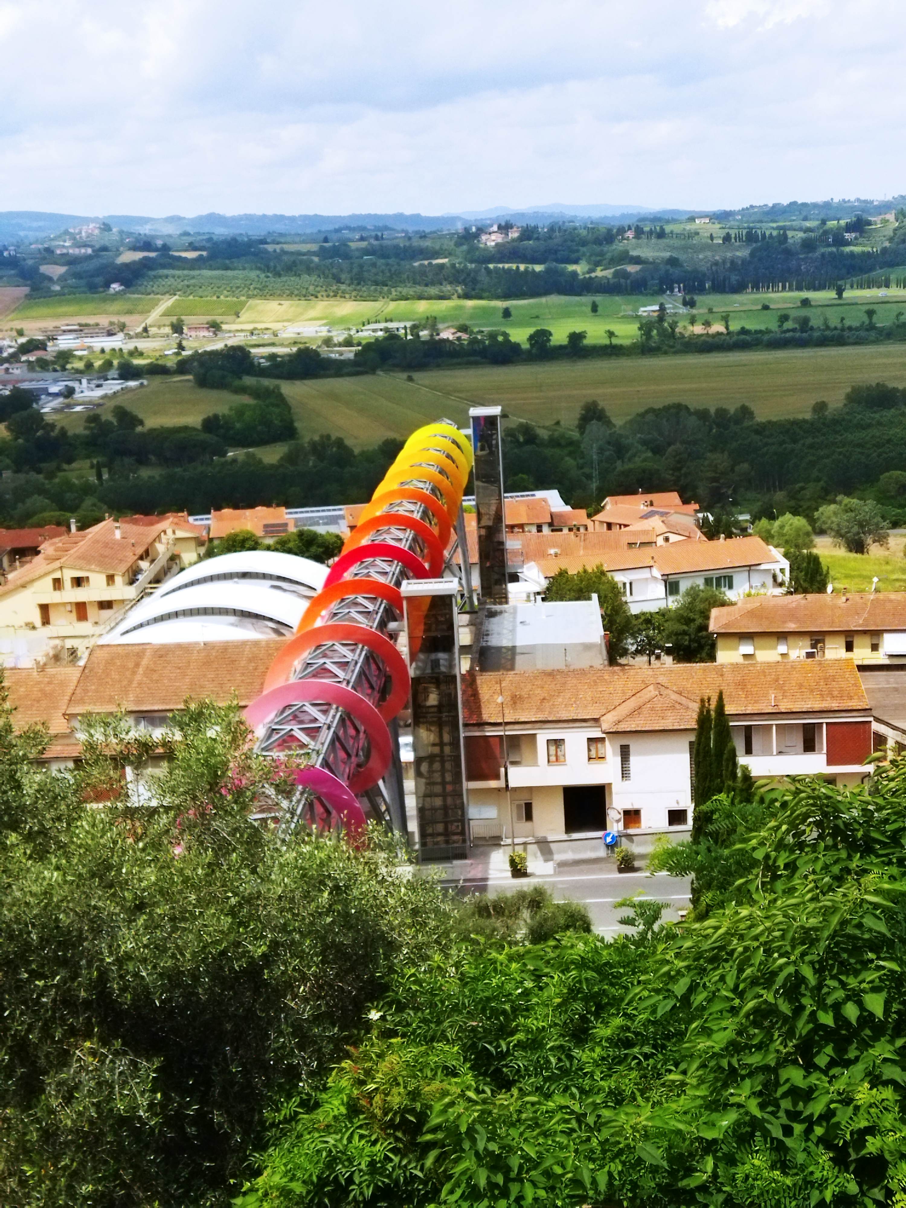 歩道橋に設置されたカラフルな渦巻きは「エンドレス・サンセット」、終わりのない空の色の移り変わりを表しています。旧市街からエレベーターで下り、歩道橋を歩いて行くと真ん中に1つ、端に1つ、と新市街の2か所にエレベーターで下りられるようになっています。なのでここはまさに市民の足で、ベビーカーを押す若い夫婦や犬の散歩の人、私のような観光客もちらほらと。外から中から、下からと写真を撮ってみましたが、なんだか村に溶け込んでいるのが不思議です。
