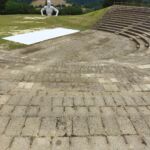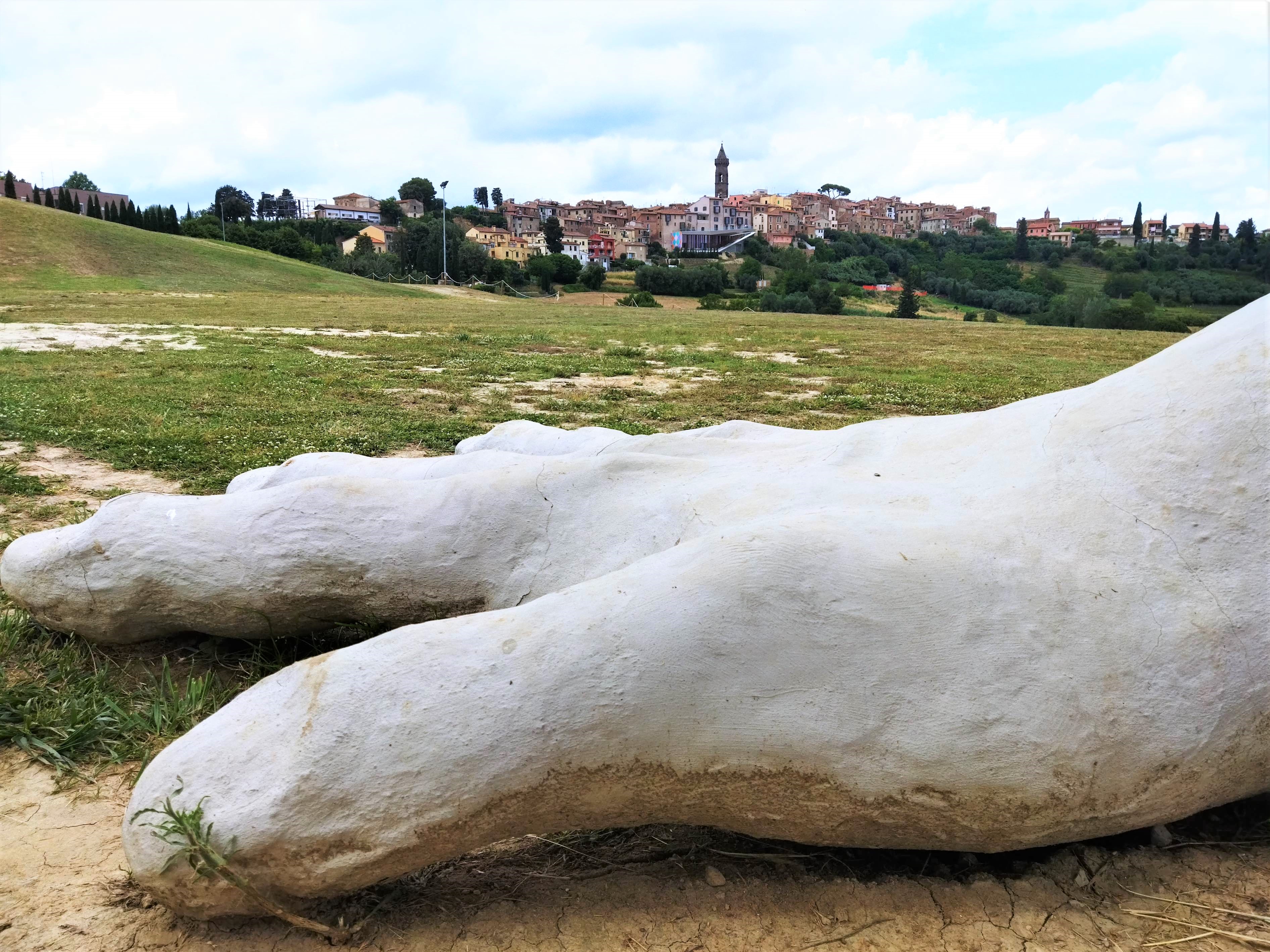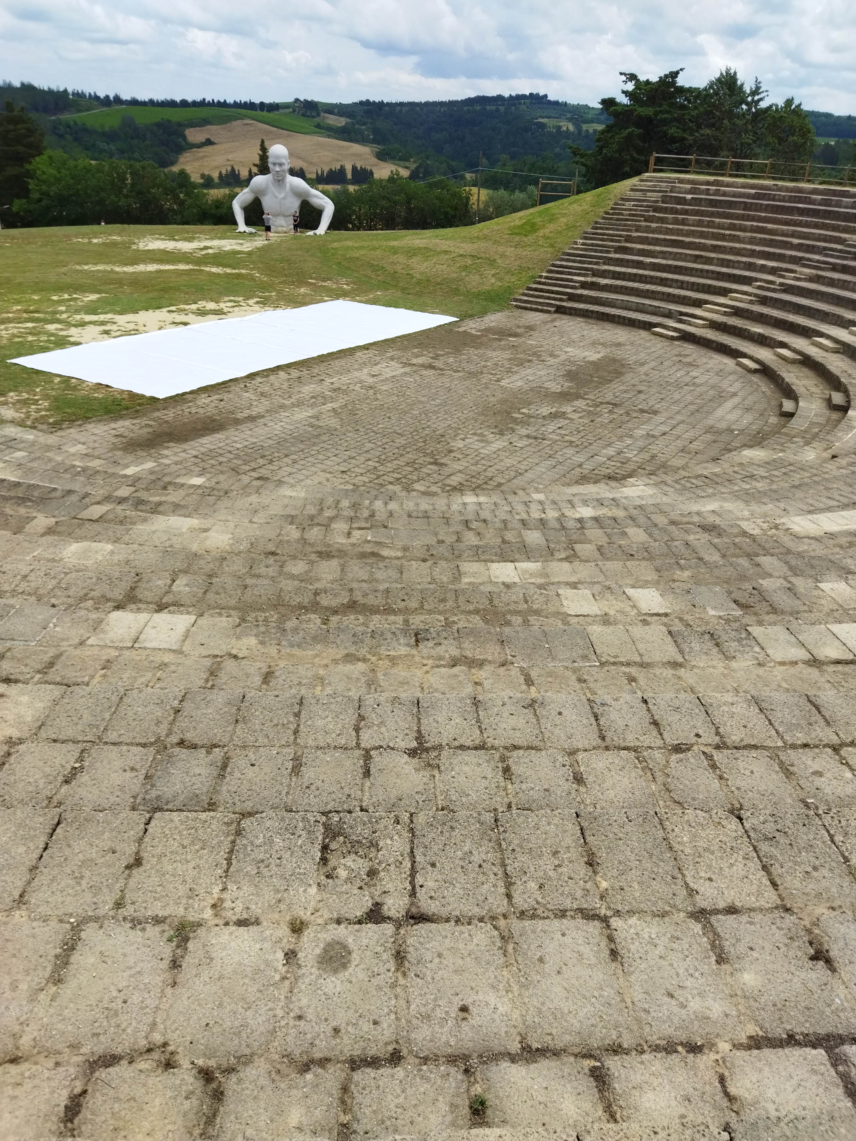 2011年からは村の景観覆すような大規模な作品や建築が増えていきます。その最たるものは3つ。1つ目は、ペッチョリ周辺のゴミ回収施設のインフラ整備から生まれた会社に設置された巨人の4つの像で、そのうち1つは村すぐそばの屋外劇場に設置されています。村の中からでもその姿が見られ、近づくにつれてその大きさが実感できます。