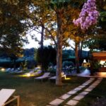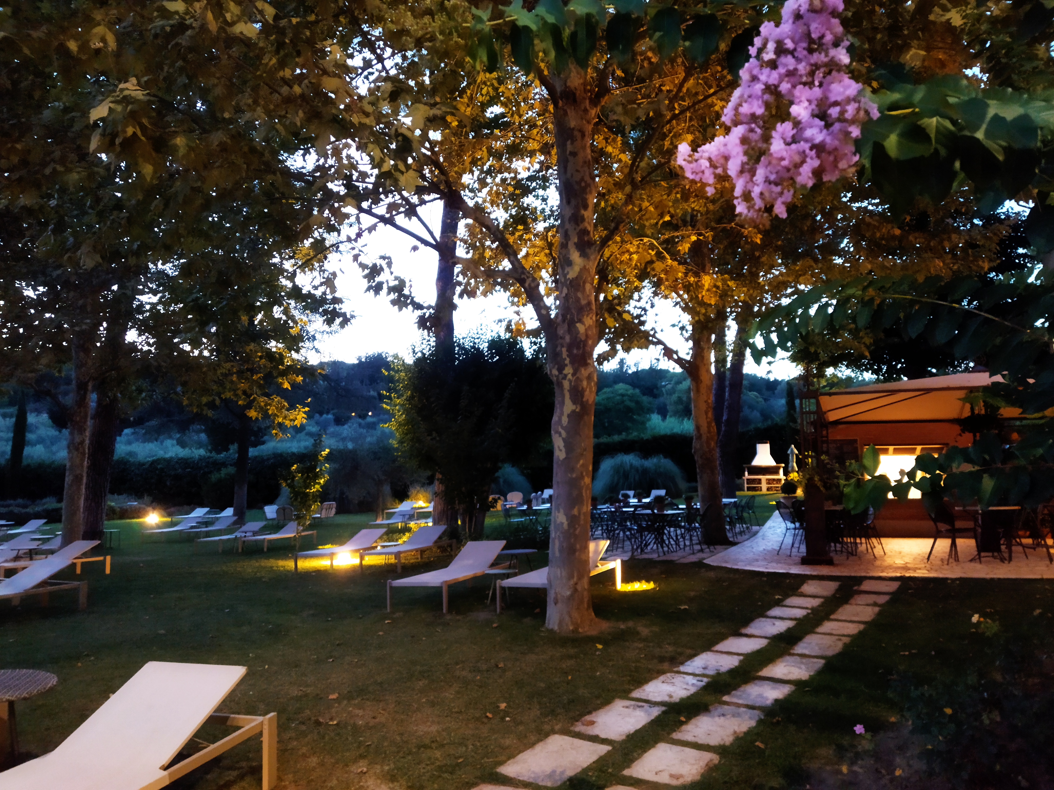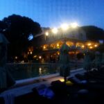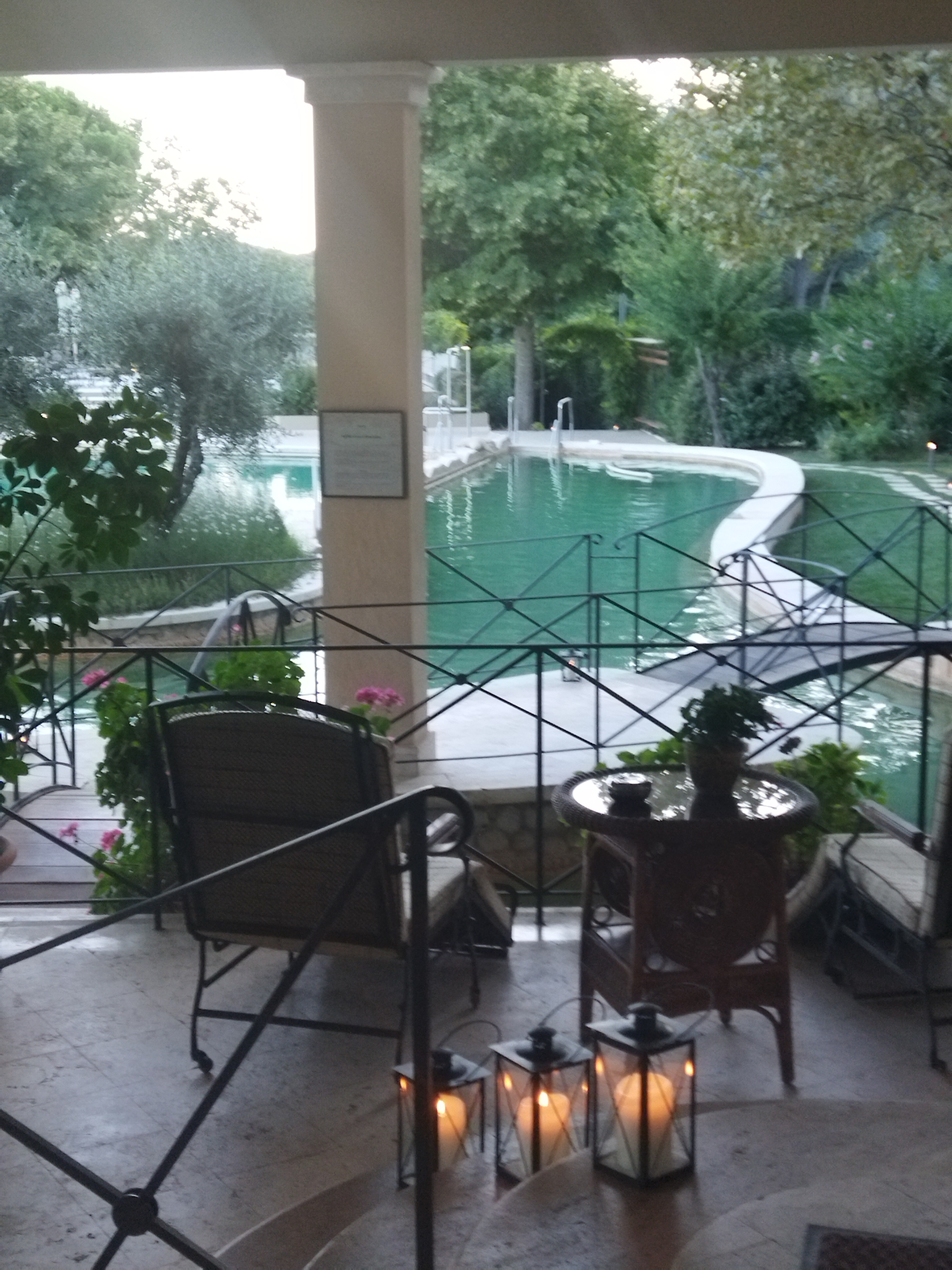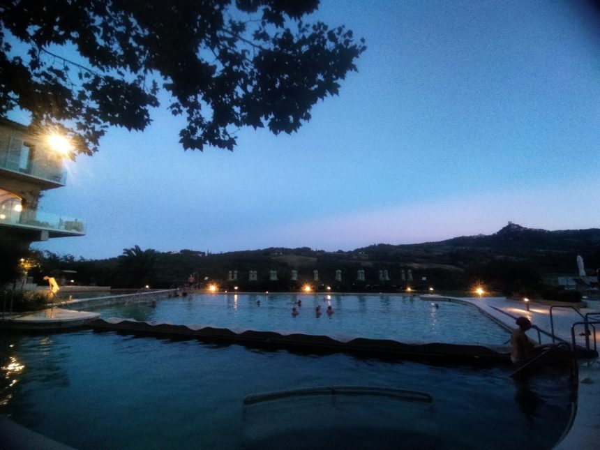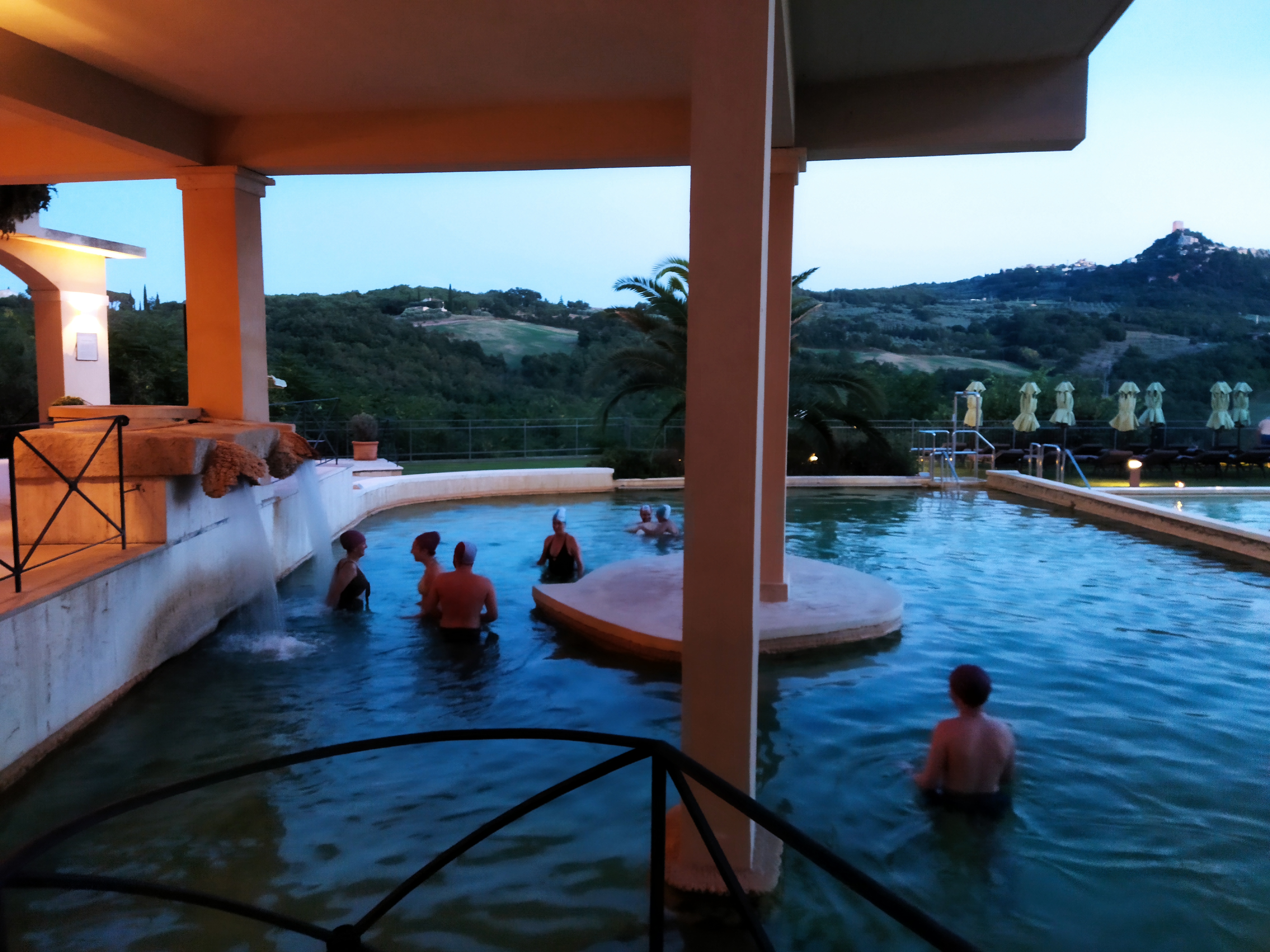 今回、私たちが行ったのは、4つ星ホテルのポスタ・マルクッチ。実はここはかつて他のホテルに比べてレトロですが良心価格の3つ星ホテルで、子どもがいない時(つまり20年近く前!!)にここの温泉プールの夜間営業に行ったことがありました。星空の下、月に照らされたロッカ・ドルチャの要塞を眺めながらゆったりと温泉に浸かる・・・この至福の時をもう1度!と思ってから時は過ぎ・・・ホテルは美しくモダンに改装され4つ星ホテルになりましたが、温泉プールの夜間営業は継続、その名も「Bagno sotto le stelle=星空の下の入浴」・・・料金は倍になりましたが、久しぶりだしもうそれは仕方がない!