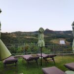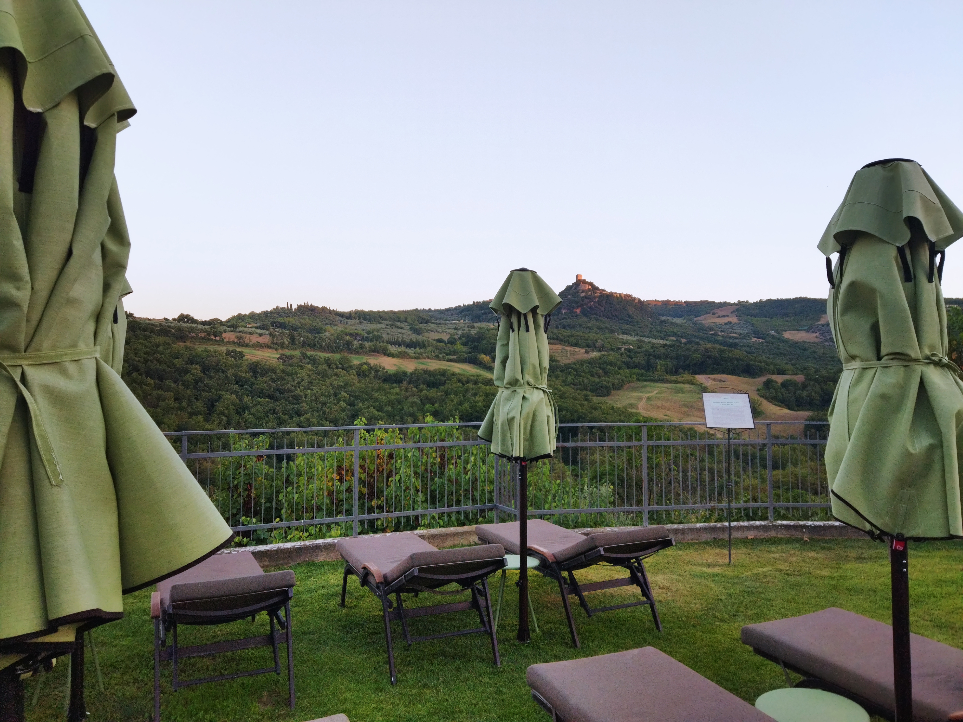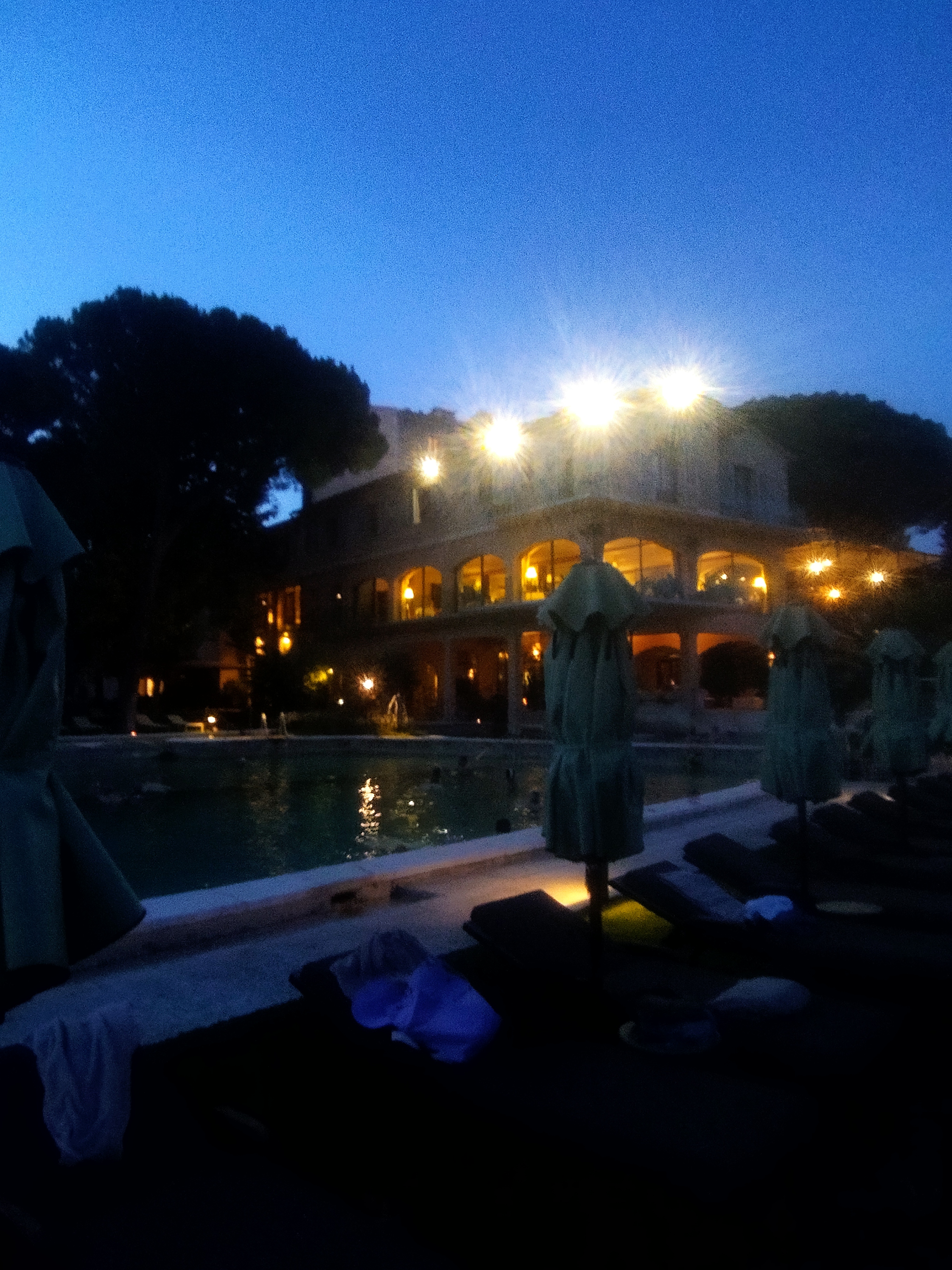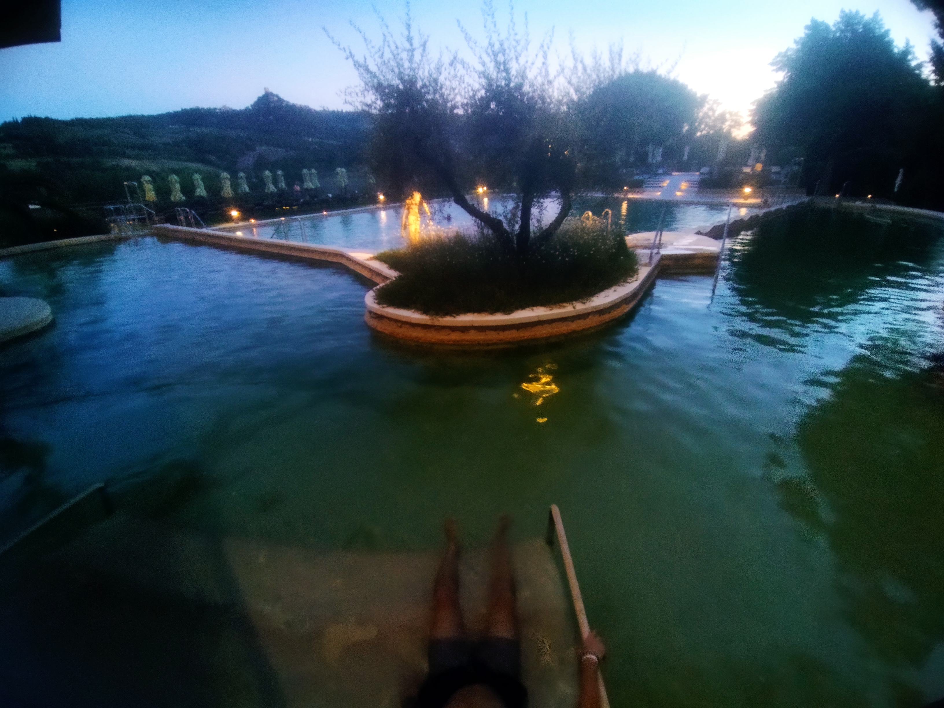 夜は寒くなることもあるオルチャ渓谷の丘ですが、今年は酷暑なので温泉から出ても寒いことはなく、水着のままでビーチベッドに。寝転びながらゆったりと、浮かび上がるロッカ・ドルチャの要塞を眺める...これこれ、もう1回やりたかったやつは!