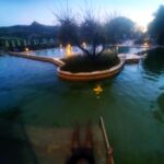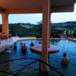 ビジターは予約制で、コースは2種類。営業時間が20時~23時と3時間だけなのもあって、私たちは30ユーロのコースへ。このコースでは、熱めとぬるめの2つの温泉プール入場(打たせ湯、ぷかぷかクッション、ベンチあり)、ビーチベッド&ミニテーブル、飲み物とおやつのミニブッフェにシャワー付更衣室使用(シャンプー、リンス、ボディーシャンプー、ドライヤー完備)、ビーチタオル貸出。50ユーロコースだと上記+室内のサウナやトルコ風呂なども使用できます。注意点はスイミングキャップが必須で現地で買うと5ユーロもしますので、家にある人は必ず持っていきましょう(サイトに未掲載+予約時にも言われなかったので、これはちょっとマイナスポイント👎)