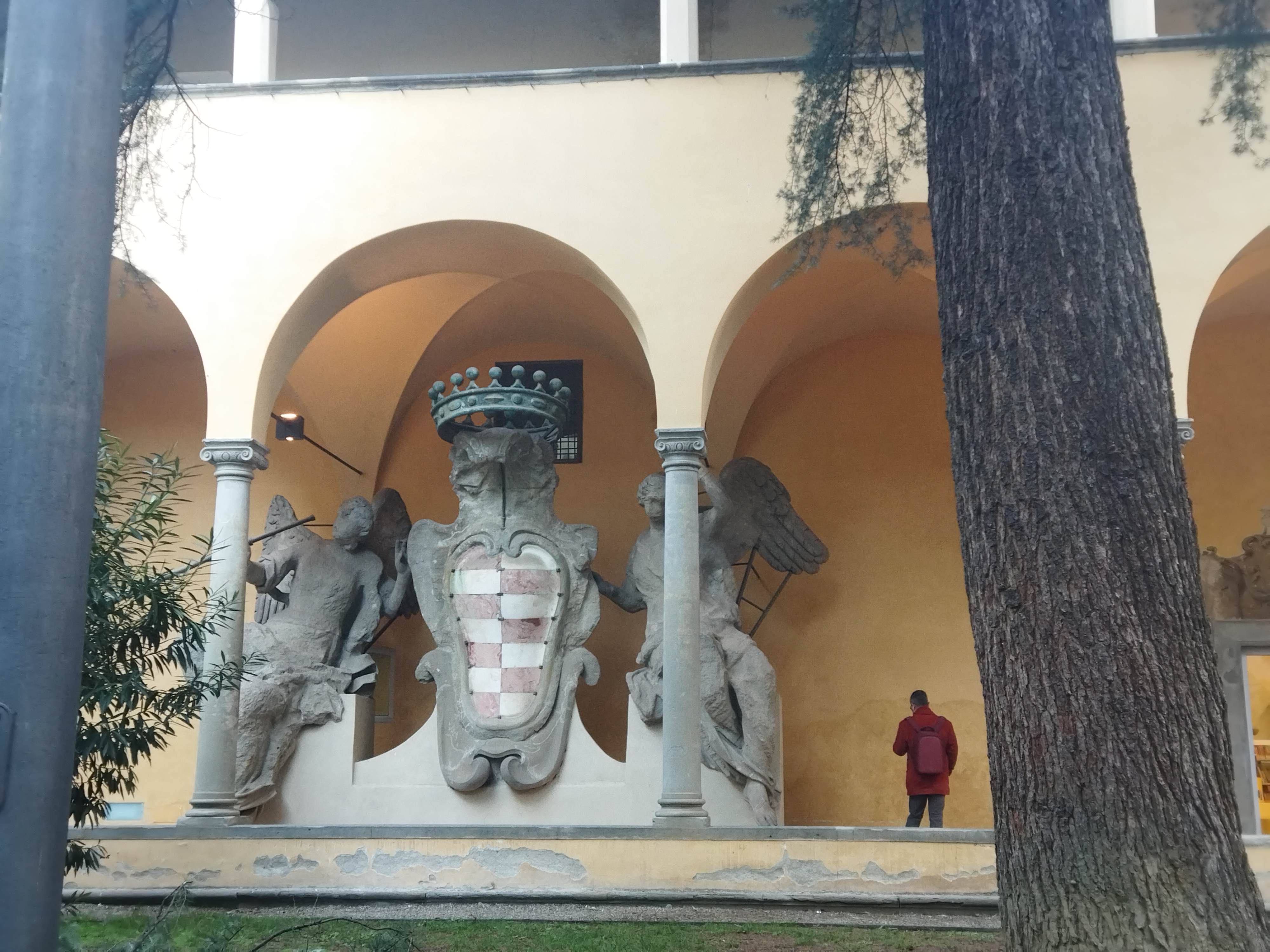 もうすでに日本のガイド本や在住者のブログなどで有名なオブラーテ図書館のバール、私もやっと?(笑)行ってきました。場所はドゥオモの裏手すぐ、と立地も最高ですが、当然フィレンツェ市民が使う図書館のため、観光客の方はちょっと入りにくいかもしれません。まず門をくぐってすぐの柱廊のある中庭、大きな紋章の彫刻にワクワク。あまり知られていないかもしれませんが、ここはかつての修道院。バールを紹介する前にこの建物の歴史をちょっと覗いてみましょう。