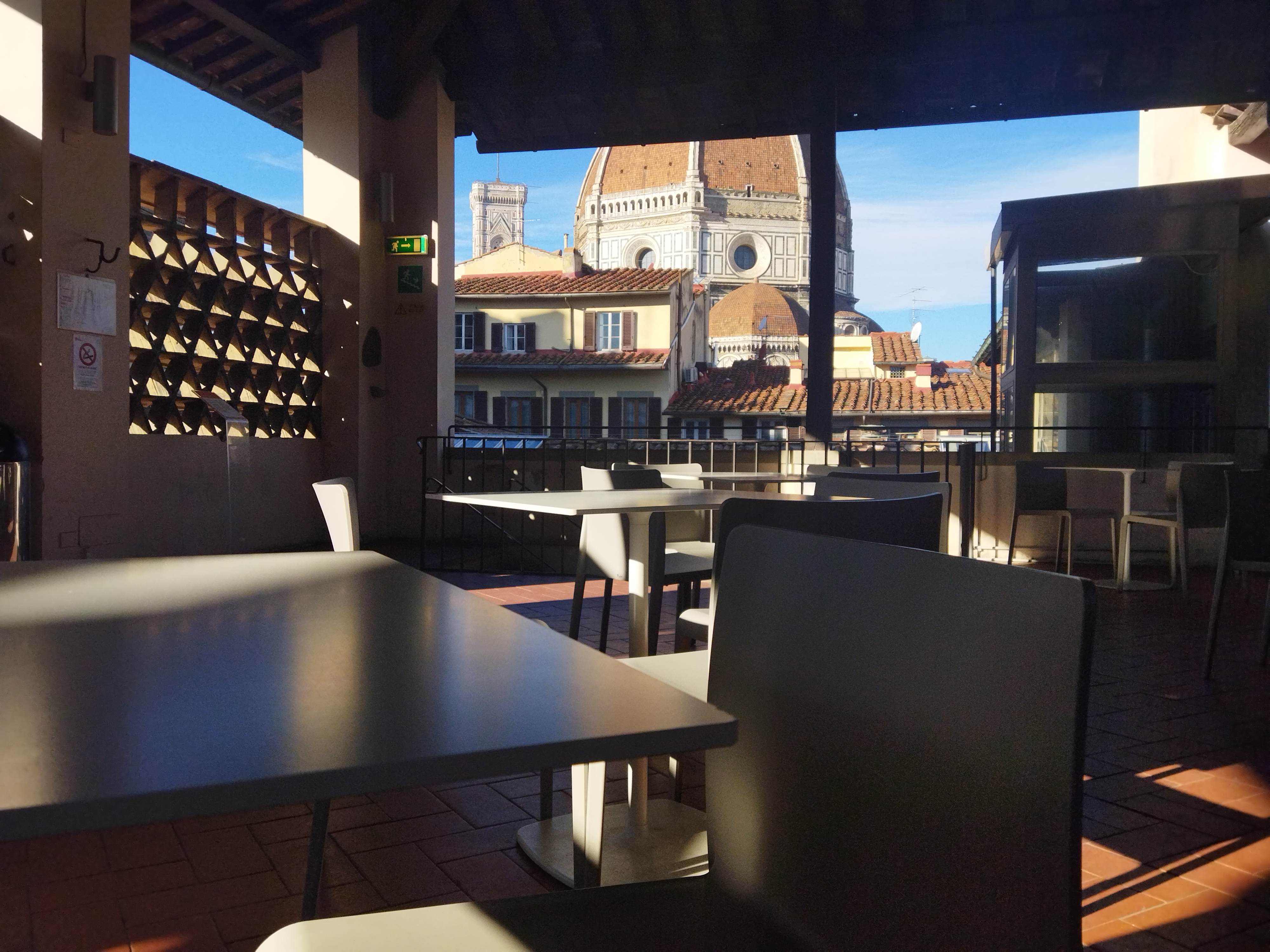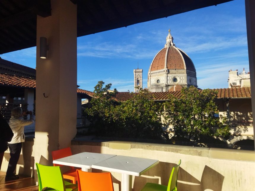 私が訪れたのは12月でしたが、晴天だったためにテラス席にも人がいました。このテラスはかつて、病院のベッドなどに使うシーツなどの洗濯もの干場であり、また1966年にフィレンツェを襲ったアルノ川の氾濫時には1階から運んできた書物を乾かしてた場所だそう。しかし、本当に日当たりが良い! ここからの眺めがTOP写真なのですが、青空に映えるドゥオモが美しすぎて・・・地元民かと思われる年配の方たちもスマホでたくさん撮影していました。