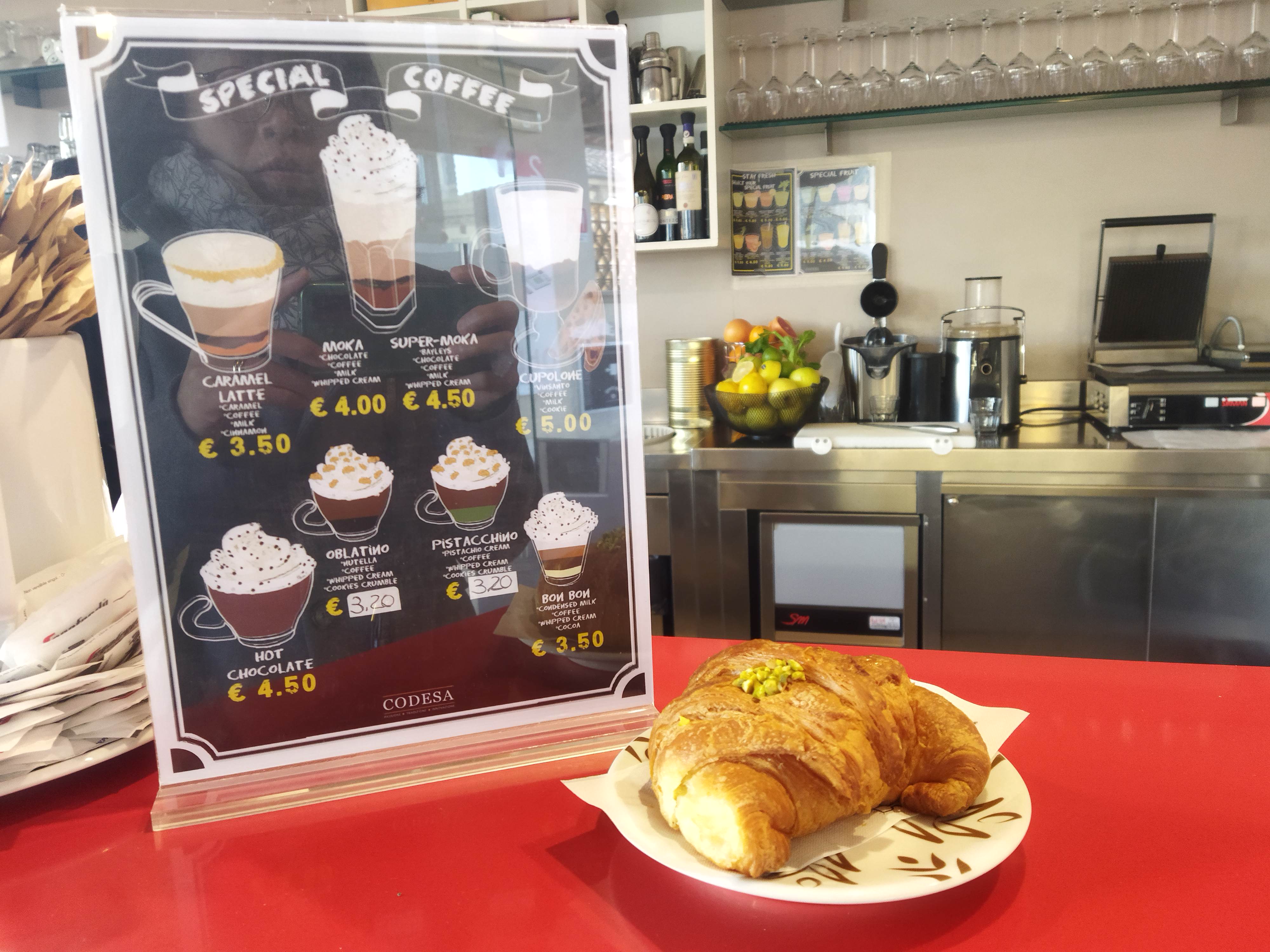 室内でも、いや、室内だと更に近くでドゥオモがドーーン!!の最高のパノラマなんです!・・・あれ、みんな知ってました?笑。バールとしてはいたって普通で、エスプレッソにカップチーノ、各種ブリオッシュなどの朝ごはんができます。ちょっと変わり種エスプレッソがあったり、アぺリティーヴォができたり、ちょっとしたお菓子も買えるし、何しろこんな絶景を見ながら席料なしでまったりゆっくりできるのが素晴らしいです。