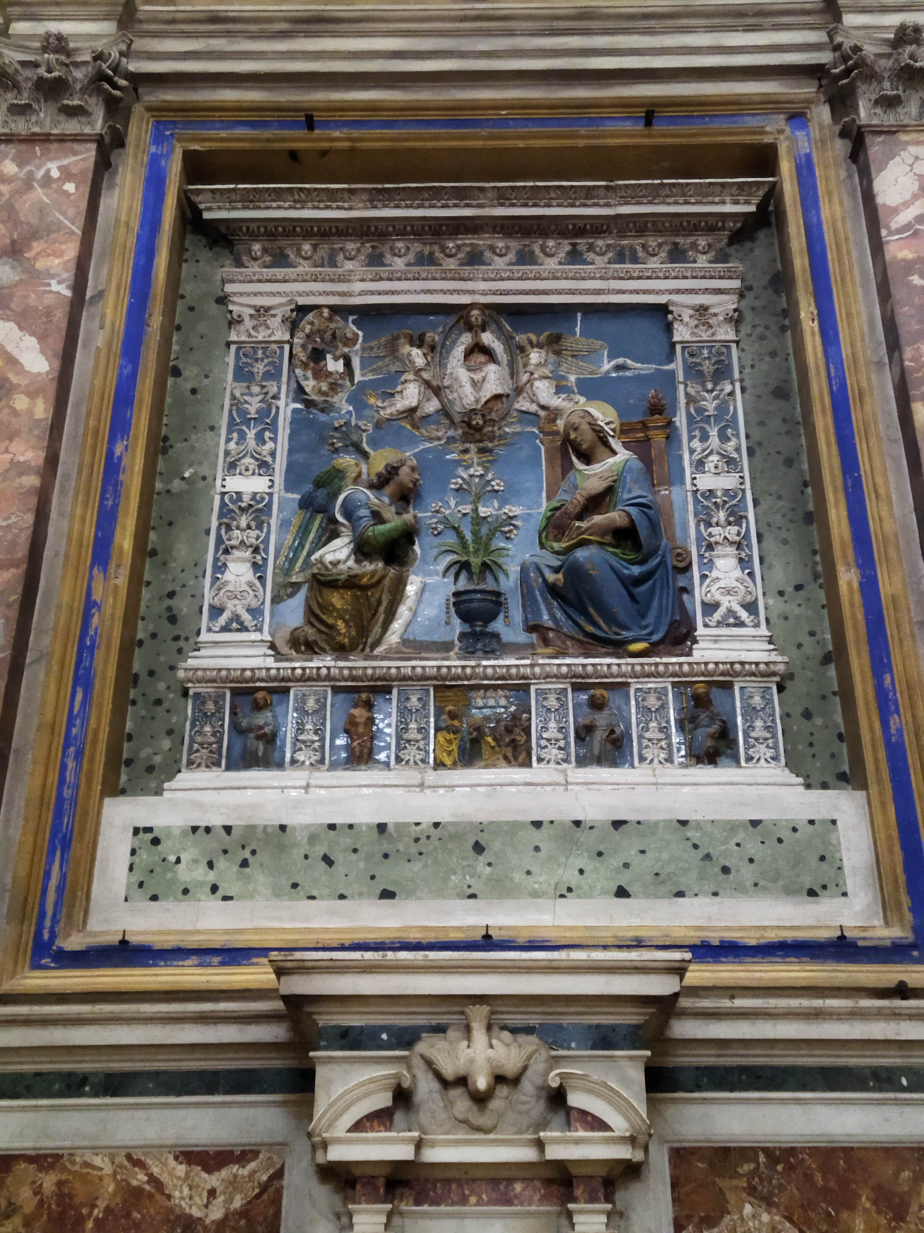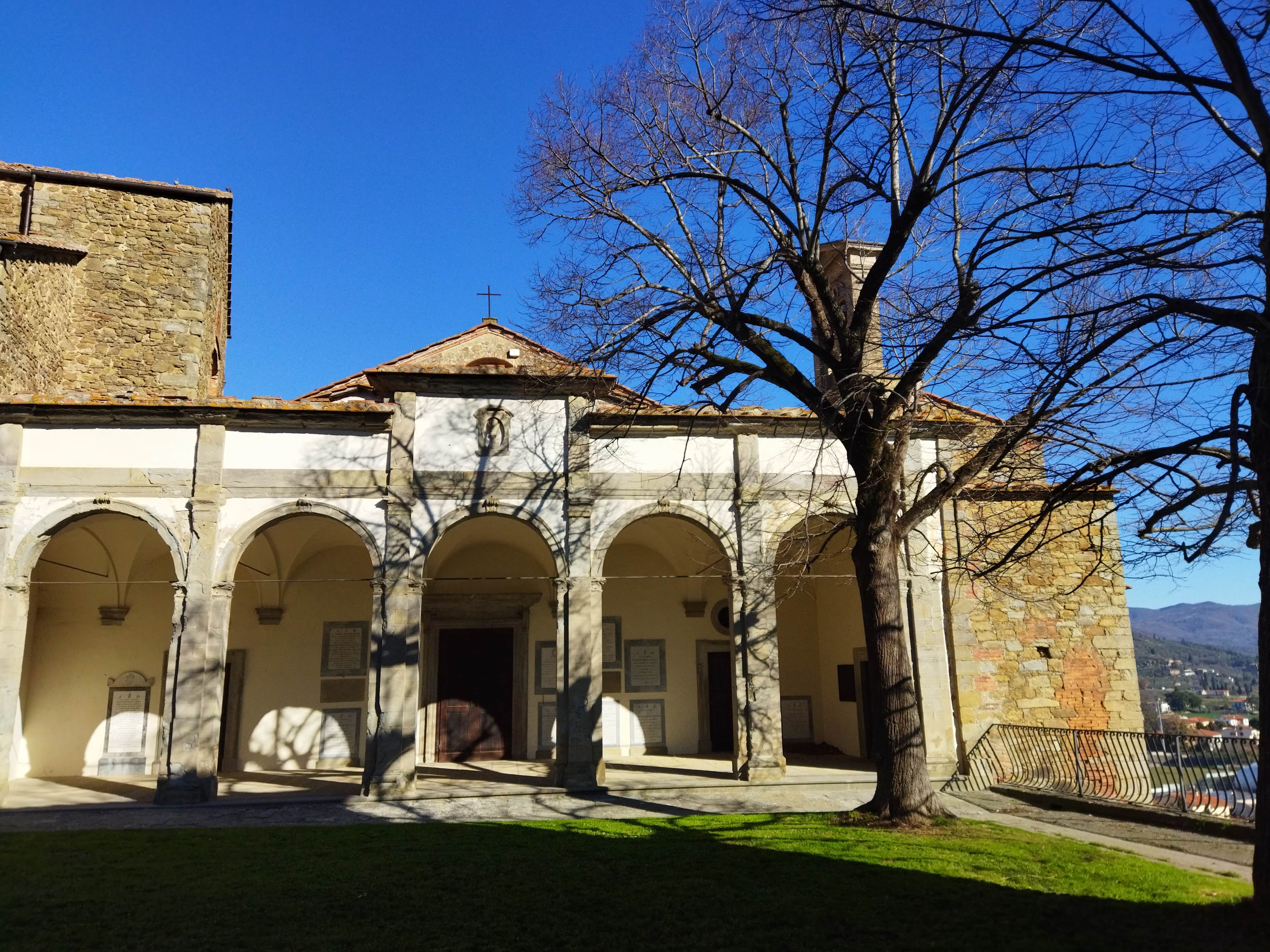 カッセロ、そしてヴァザーリのロッジアからも見えていた大きな鐘楼は、村の低い位置にあるサン・ジュリアーノ・コッレジャータ教会は19世紀の建設。中にはバルトロメオ・デッラ・ガッタの聖母像や、ロッビア工房の彩色テラコッタなどの作品も見ることができます。今では付属品のように右にくっついているのがサン・ジュリアーノ教区教会で、こちらは15世紀中ごろに再建されたもの。