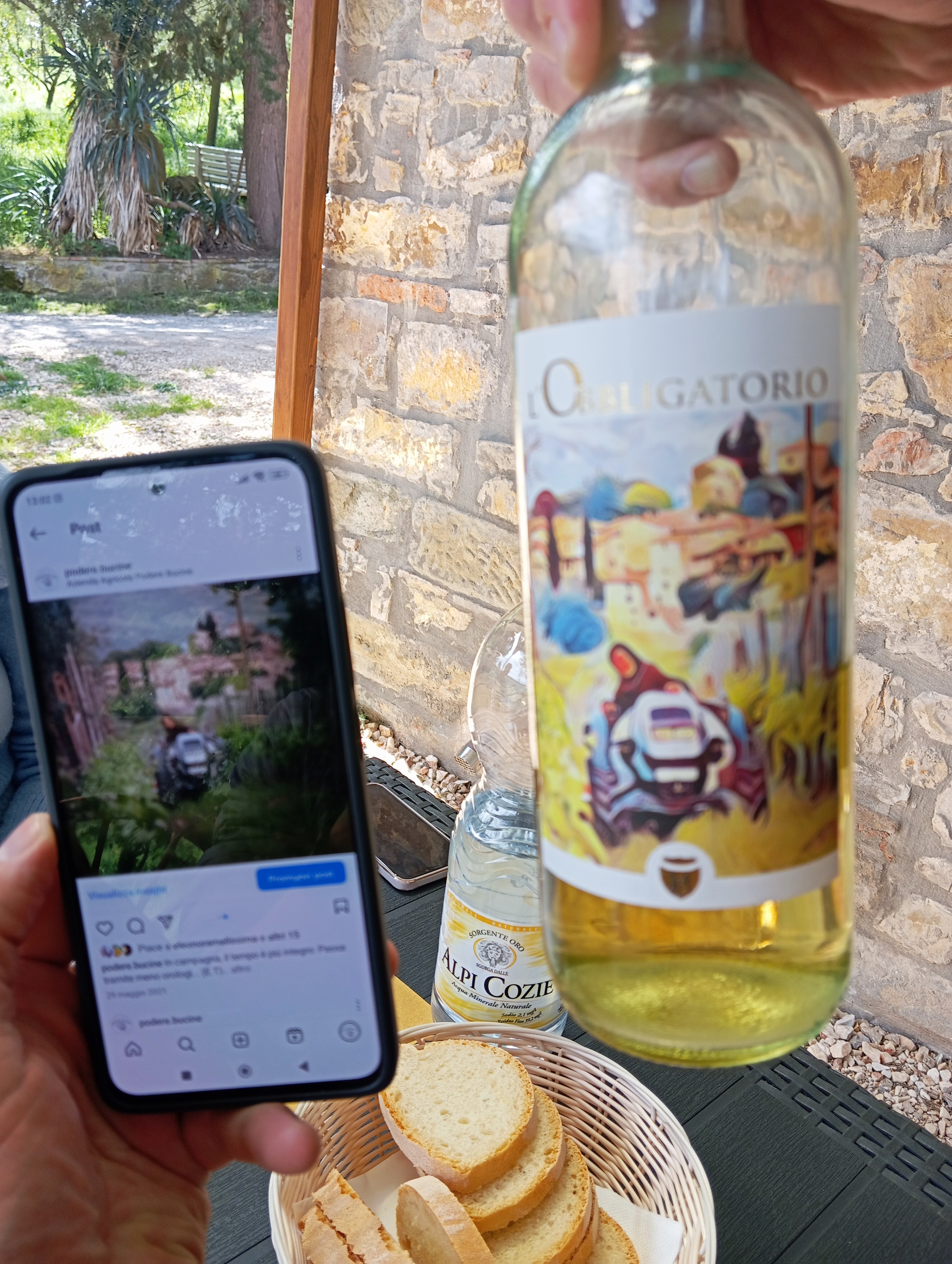 4本あるラインナップで、一番最初にテイスティングするのがこの白。かつてはキアンティ・クラッシコに数パーセントの白ブドウを使用することが決められていたため、昔からここには白ブドウ畑があり、規定が変わって赤ブドウ100%になってからも家族用に白ワインを生産していたそう。それに自分たちのラベルを付ける夢を追っていた最中に、義父は他界・・・そんな彼との約束をア果たすために付けた名前が L’Obbligatorio(責務)で、ラベルのイラストは義父がトラクターに乗った写真をデザインしたもの。全てを教えてくれた義父への愛があふれる1本は、トレッビアーノとマルヴァジアをブレンドした食事に合わせやすいワインです。そうそう、こちらではワインのみのテイスティングの他にブルスケッタ(自家製オイル、トマト)付、そして+サラミ・チーズ付きの3種類があるのですが、最後のものはけっこうな量が出てくるので立派なランチになります!