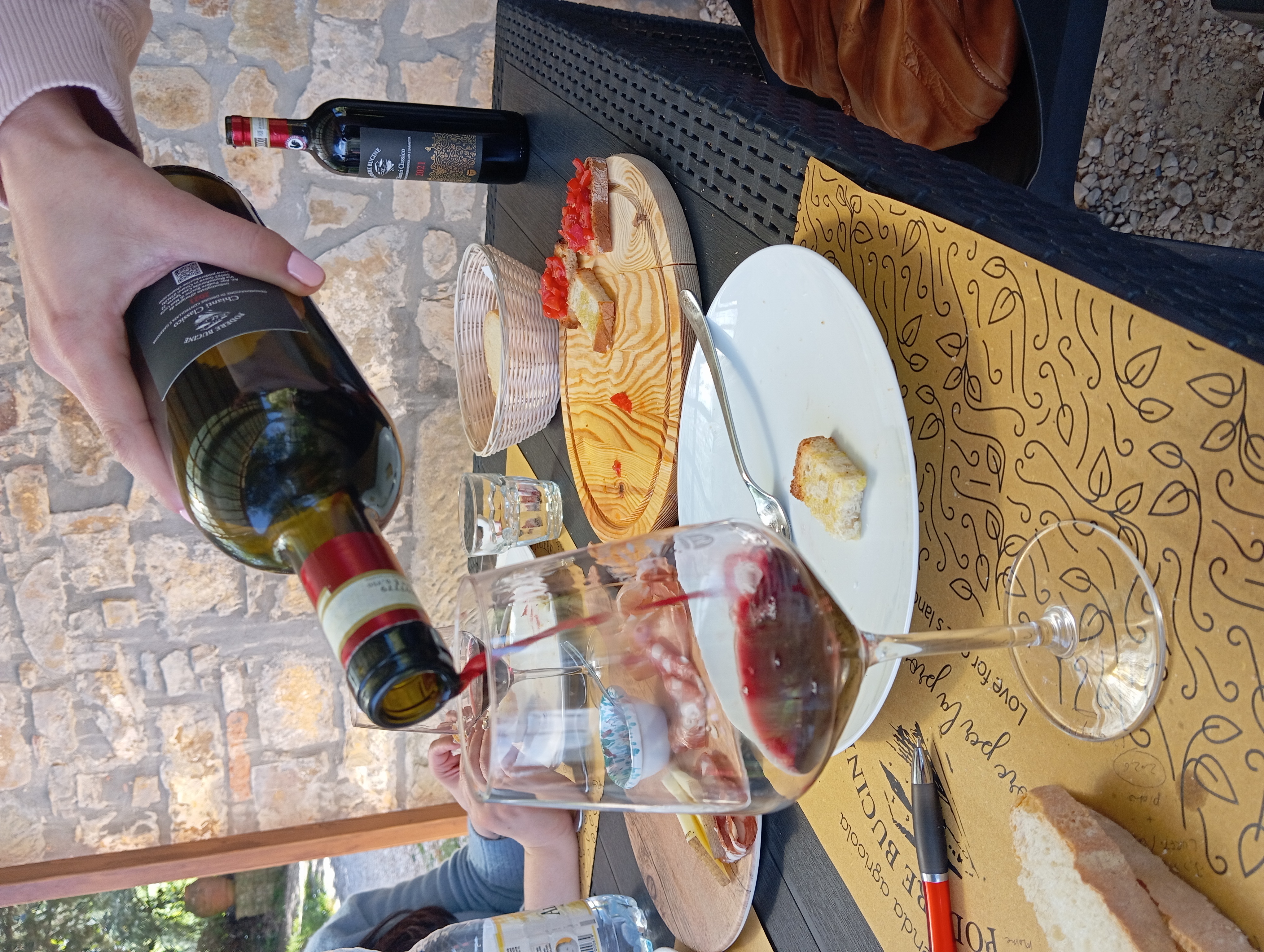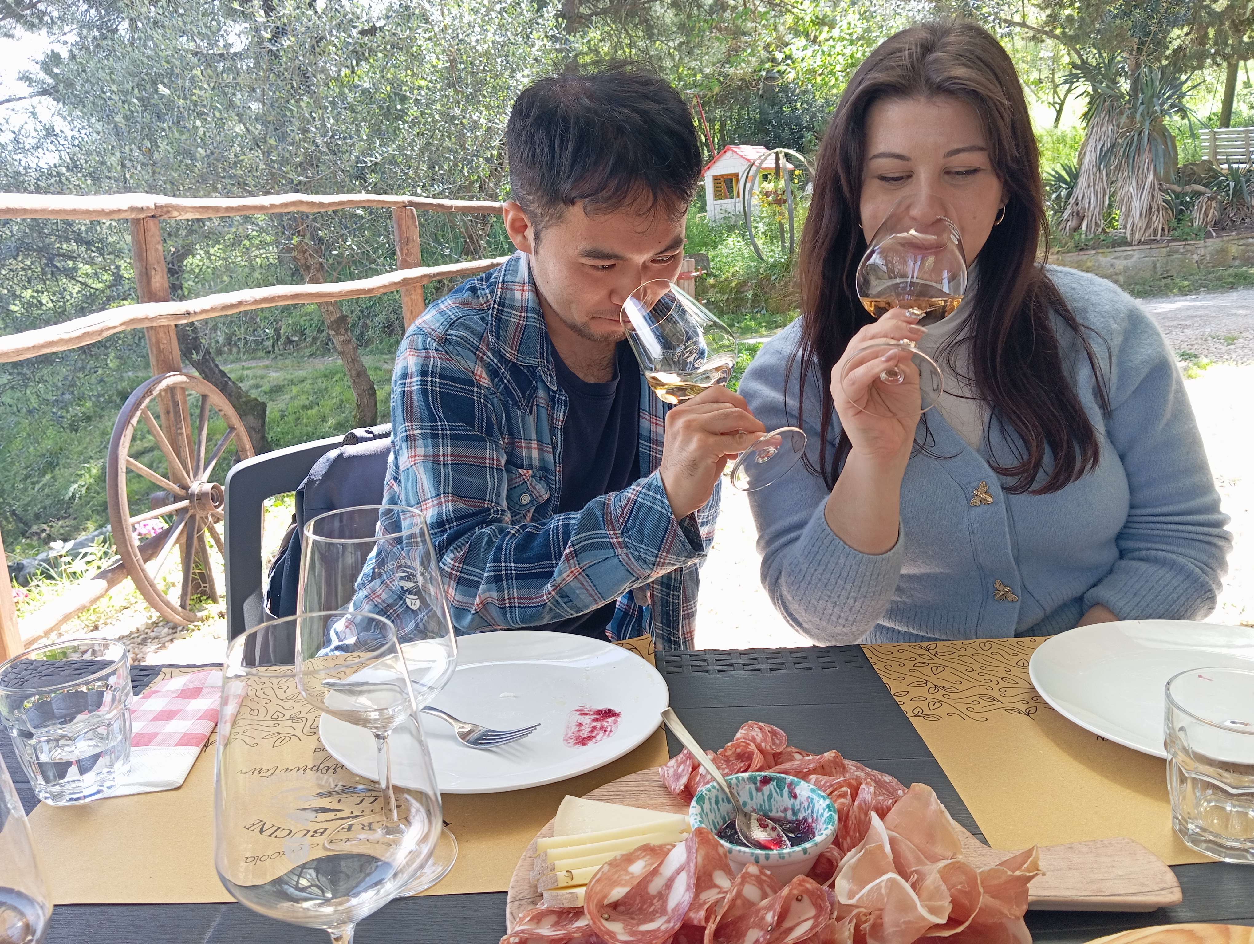 ワイナリーでのテイスティングは、その時の状況によりますが1人からでも予約なしでも可能。ブドウ畑やセラーのガイド付き見学は予約のみになります。ガイド付き見学あり・なしとも、4種のワインテイスティングで、タラッリのみ、ブルスケッタのみ、ブルスケッタ&ハム・チーズの盛り合わせ付きから選べます。見学なしであれば19時以降~の夜のテイスティングも可能。いずれも1人あたり25~45ユーロ。