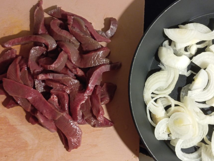 日本だとやっぱり焼肉で食べるんでしょうが、イタリアではどうやって食べるんやろ?とこちらも調べてみると、最初のほうに出てくるレシピはいずれも玉ねぎとの煮物。レバーに比べると癖はないようですが、レバーと同じような扱いのレシピばっかり=玉ねぎとの組み合わせはまさに「ヴェネツィア風レバー」と同じです。いや、作り方も基本同じでめちゃくちゃ簡単。たっぷり目の薄切り玉ねぎをいため、短冊切にしたハツを投入、白ワインで飛ばし、塩こしょうで味付け、すればできあがり!