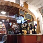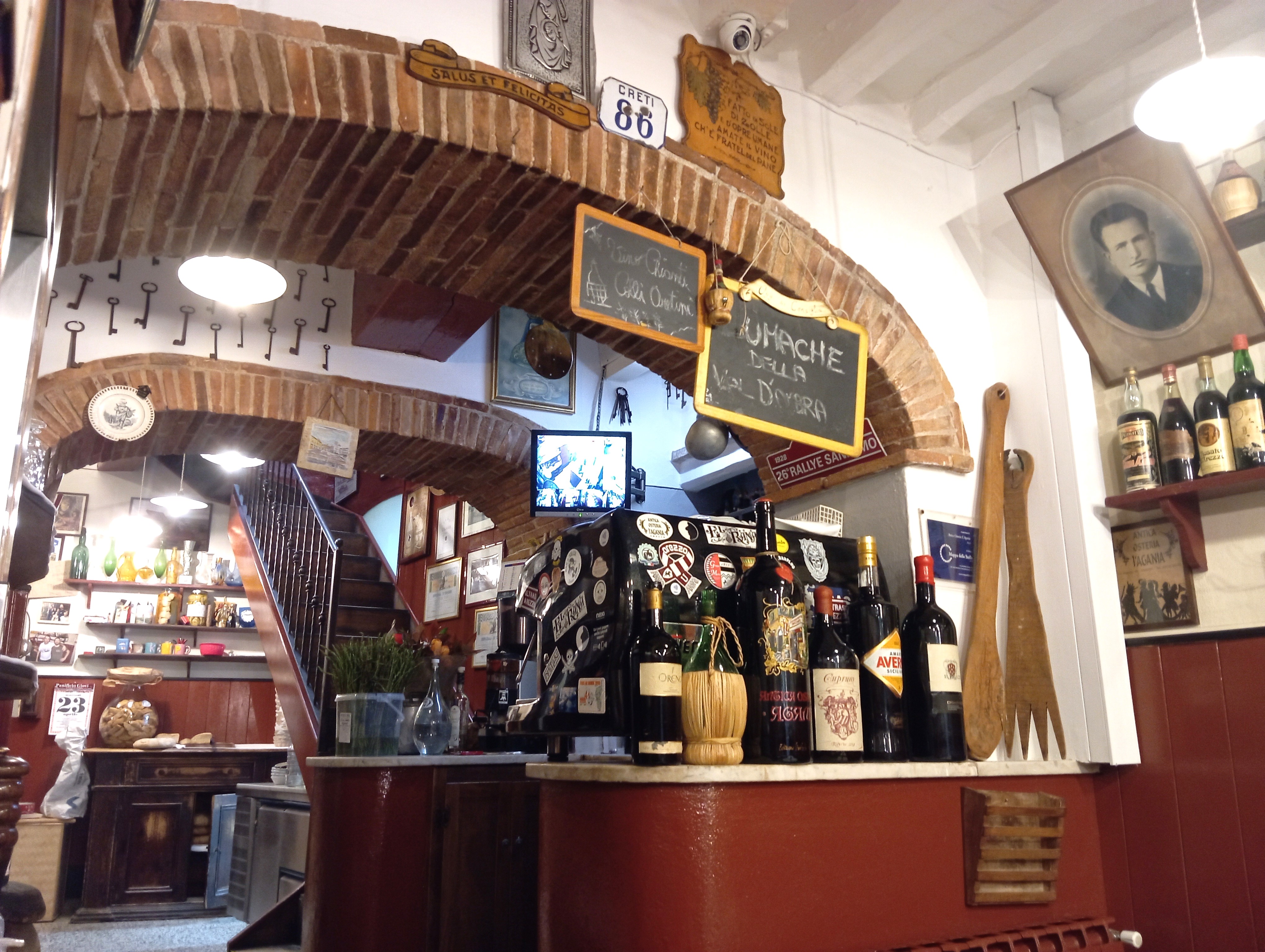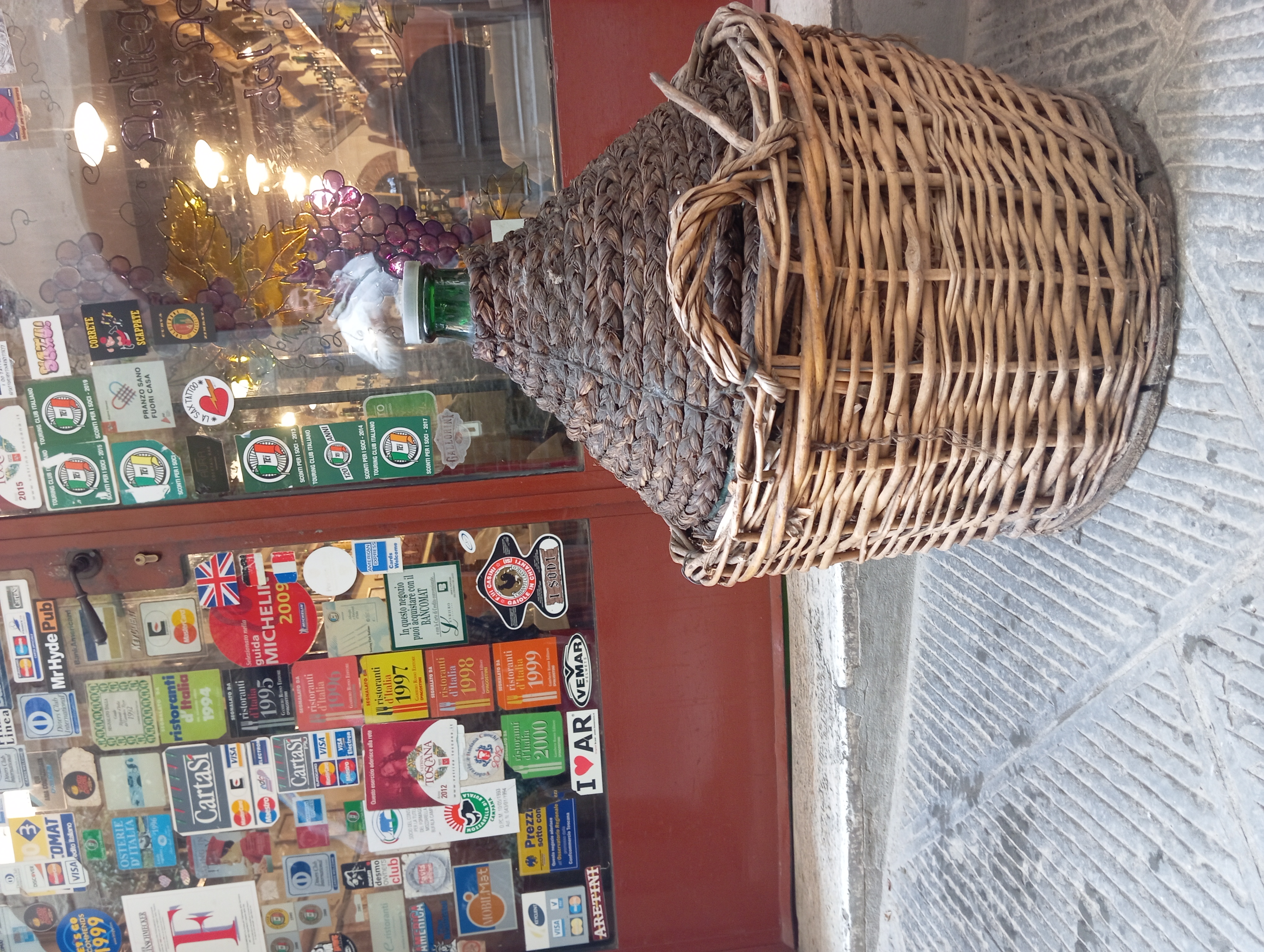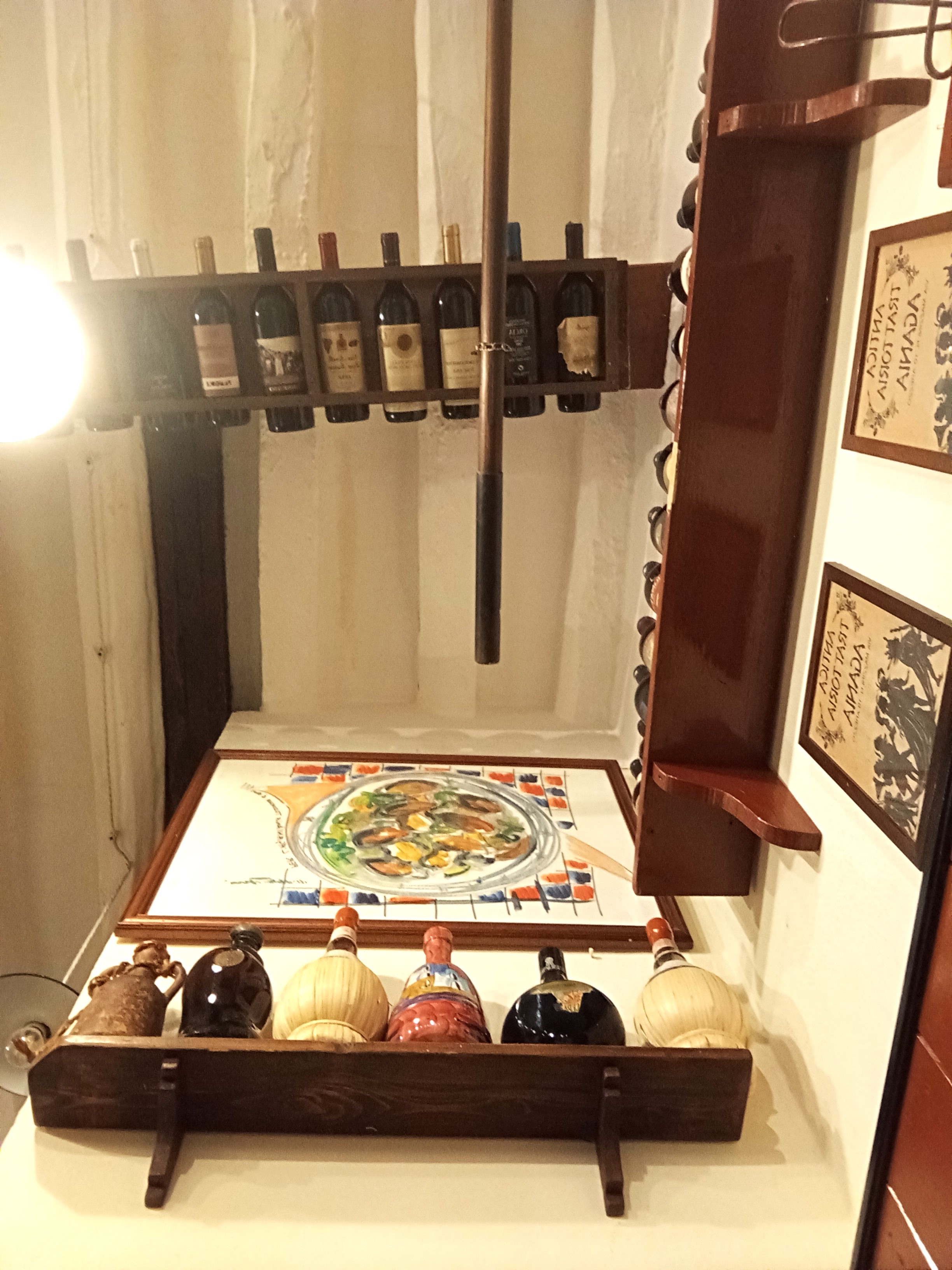 開店すぐということもあり、スタッフがワインボトルを置く作業中。このワイン、壁や天井、私が座った席の真上にもありました。昔ながらのフィアスコもいっぱいでザ・トスカ―ナのオステリア、という雰囲気たっぷり。