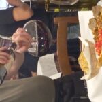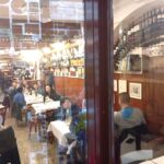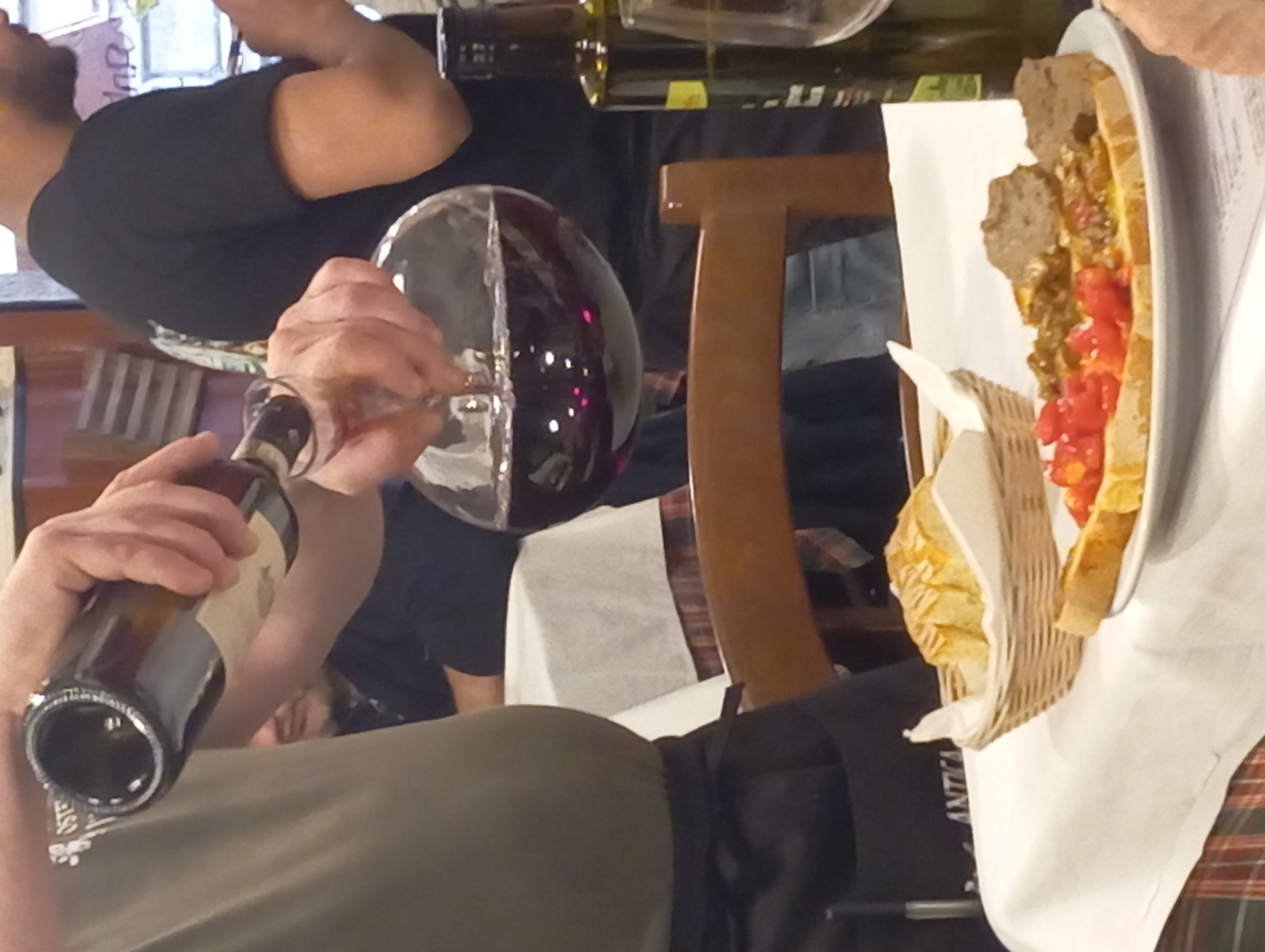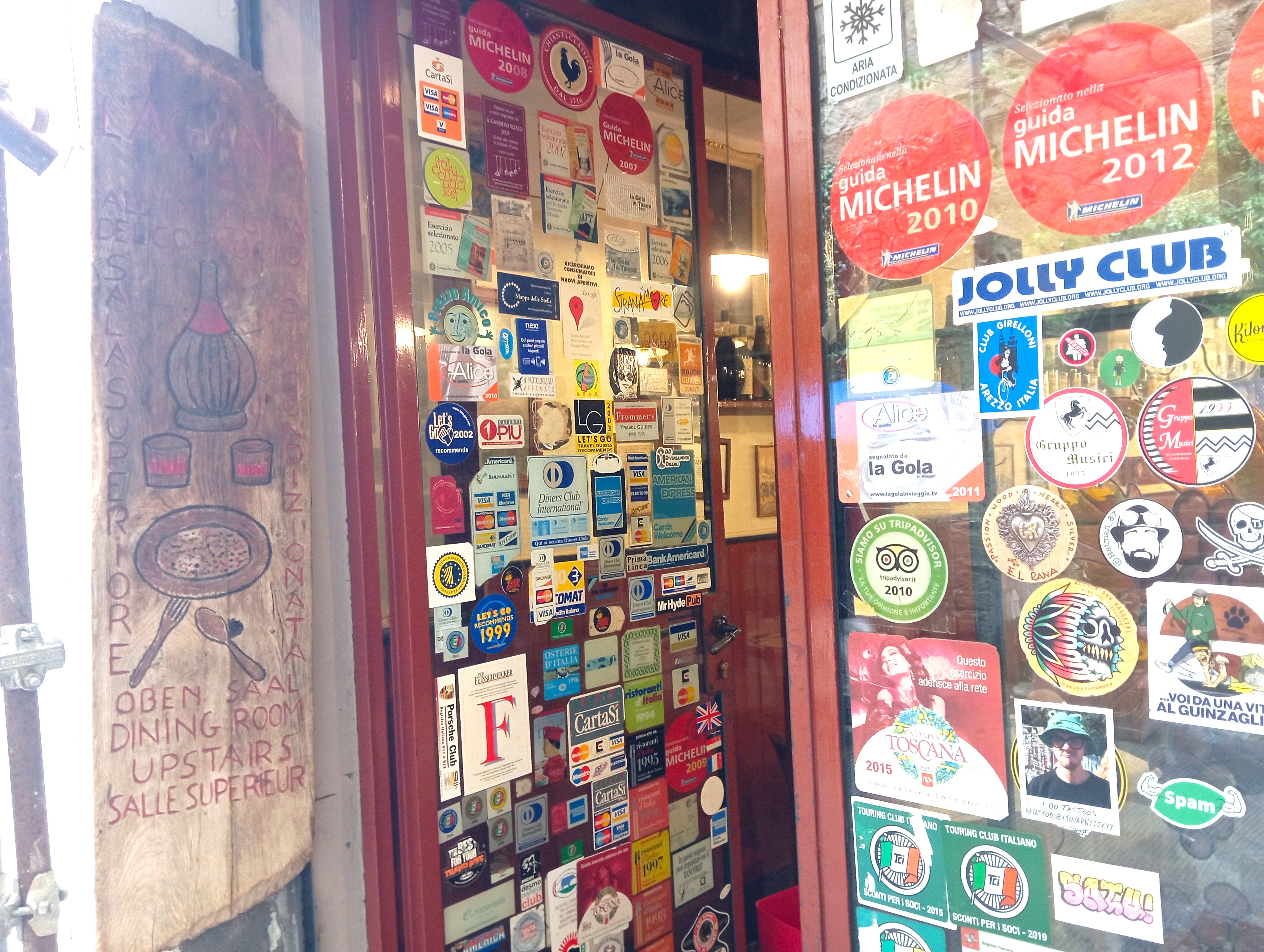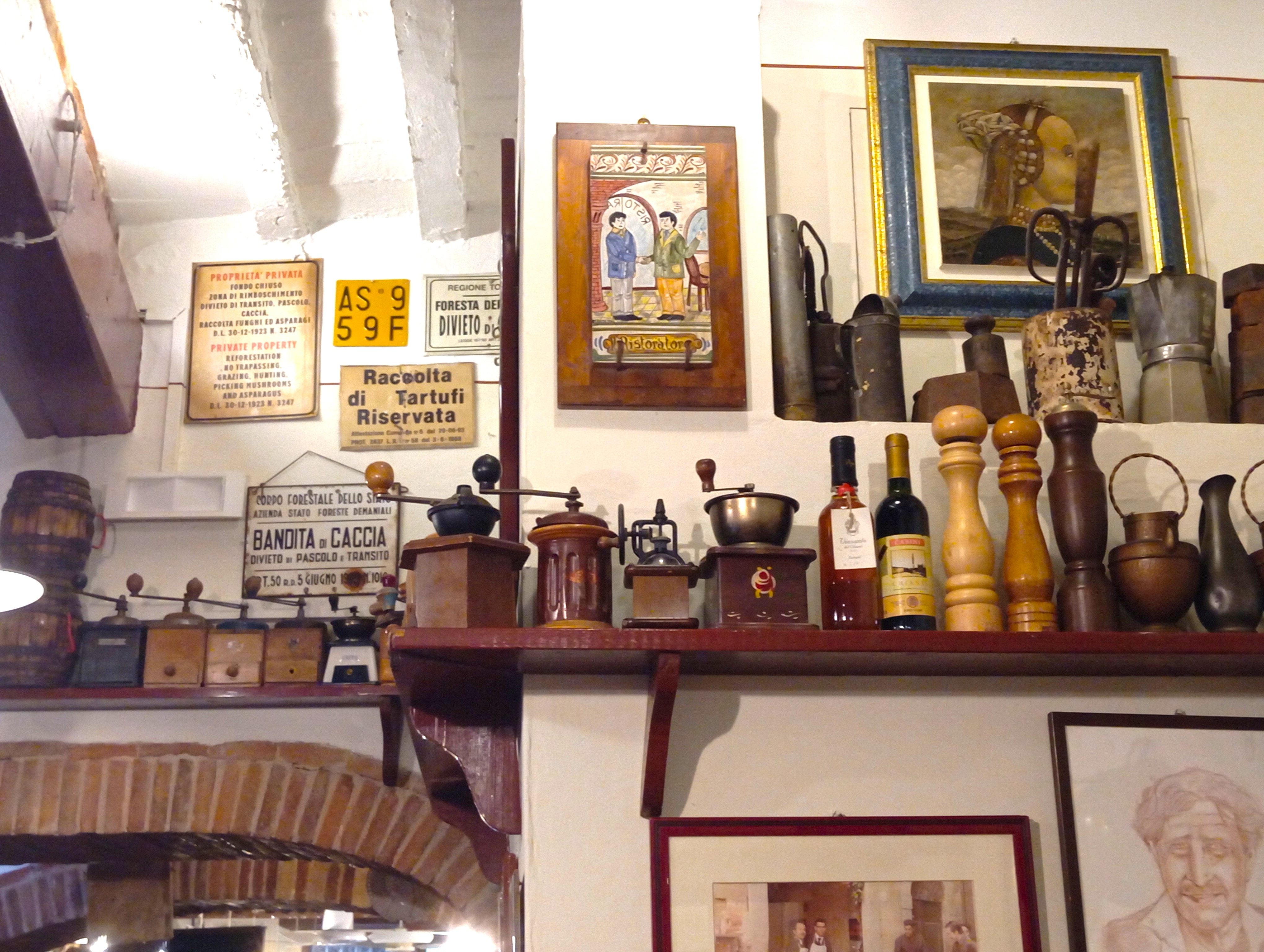 開店すぐということもあり、スタッフがワインボトルを置く作業中。このワイン、壁や天井、私が座った席の真上にもありました。昔ながらのフィアスコもいっぱいでザ・トスカ―ナのオステリア、という雰囲気たっぷり。