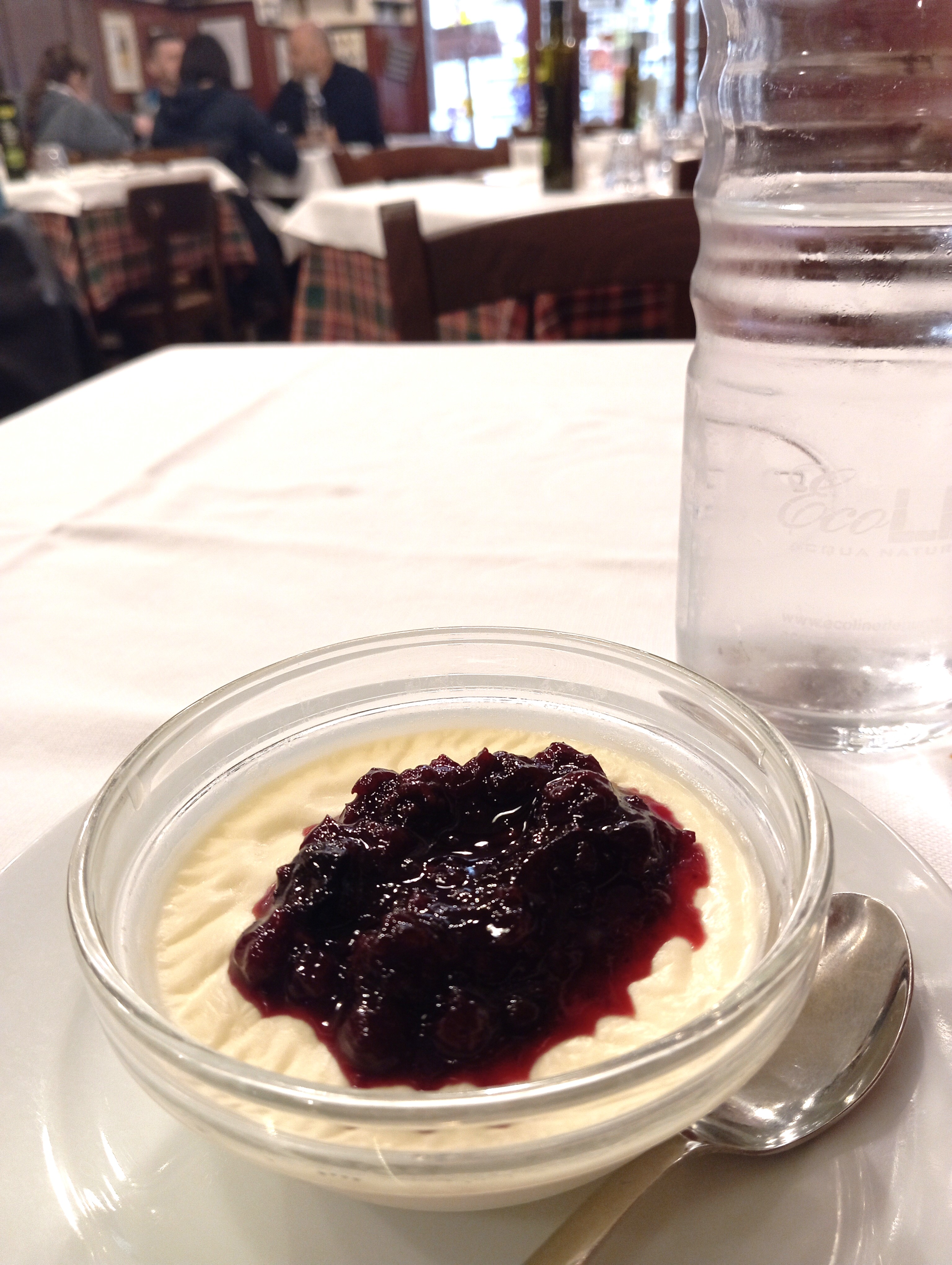 ちょっと肌寒い日だったので、ポレンタ付きの煮込みというにもひかれたのですが、何よりも初めてのこの「グリーフィ」。仔牛の顔、頬や鼻あたりの肉を示す言葉で、注文前に聞いたようにゼラチン質と柔らかい肉が混ざっています。トマトベースのソースでじっくりと煮こまれているので、口に入れるとホロホロ、ぷよぷよの食感でいくらでも食べられそうな優しい味。時間も少なかったのでこれとパンナコッタだけしか頼みませんでしたが、赤ワインにもよく合っただろうな~。