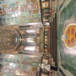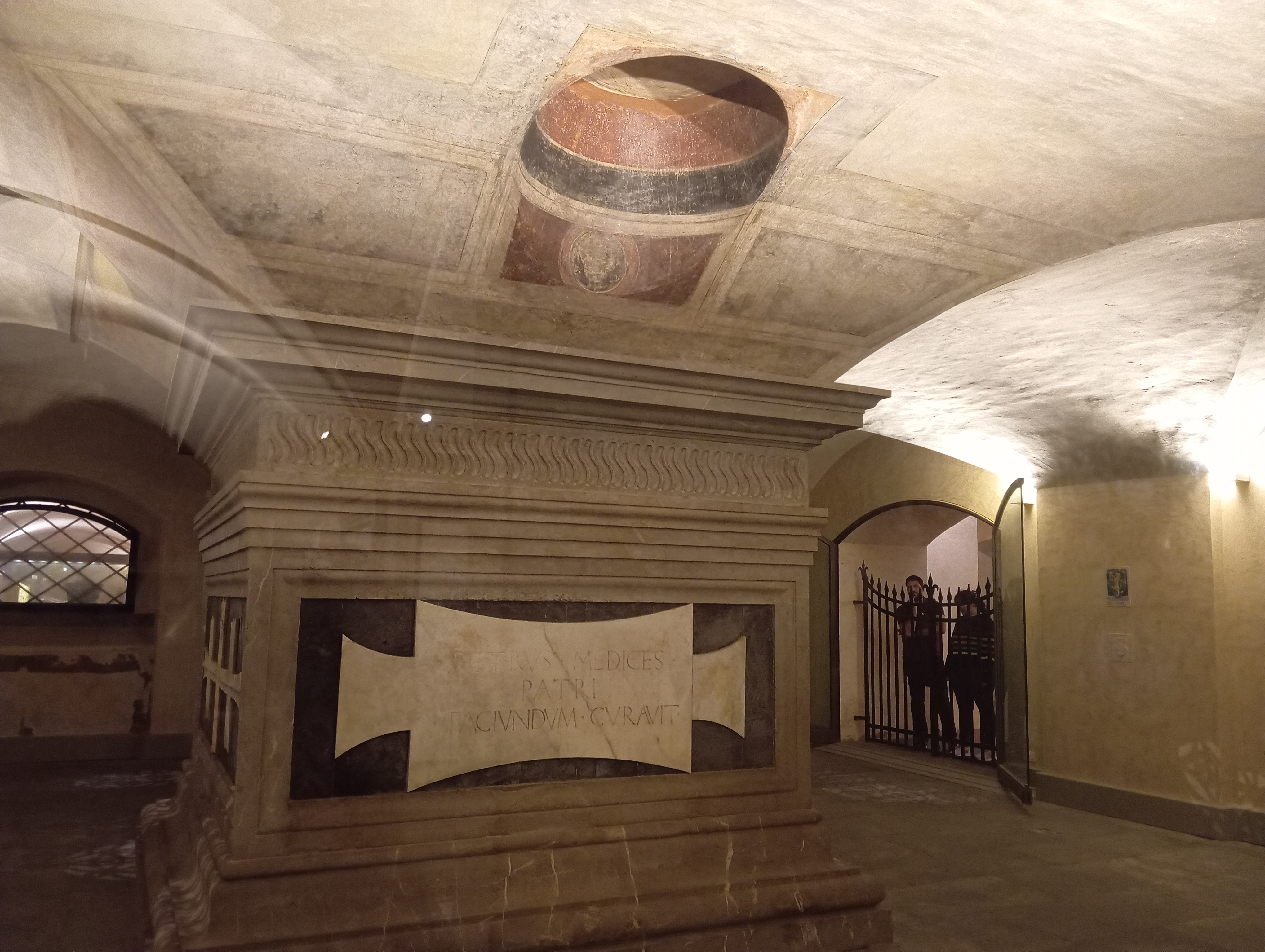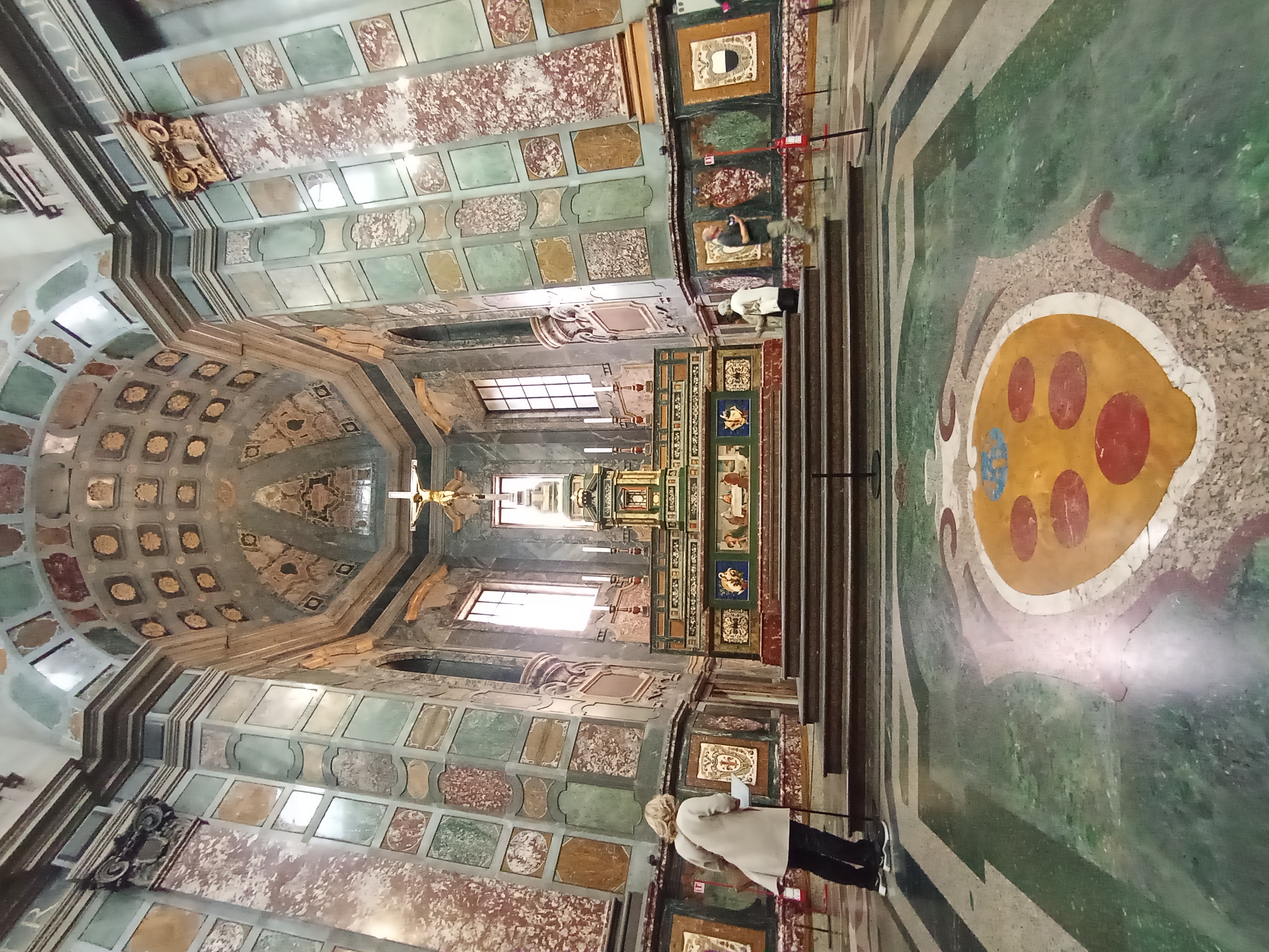チケットは秘密の部屋だけでなくメディチ家礼拝堂の見学もついていたので、予約時間の前にそちらから見学しました。2013年から8年をかけて行われた修復後、初めて訪れたメディ家の礼拝堂は、メディチ家の贅を尽くした重厚な空間。1600年代から始まった工事も工期が長引くにつれメディチ家の情勢も変わり、結局未完成に終わっています。天井に描かれたフレスコ画は1800年代初め、床のモザイクに至っては1962年に完成したそうです。祭壇の貴石芸術、その裏の左右にある聖遺物コレクションやメディチ家が輩出したレオ10世、クレメンス7世にまつわる物品が展示されています。