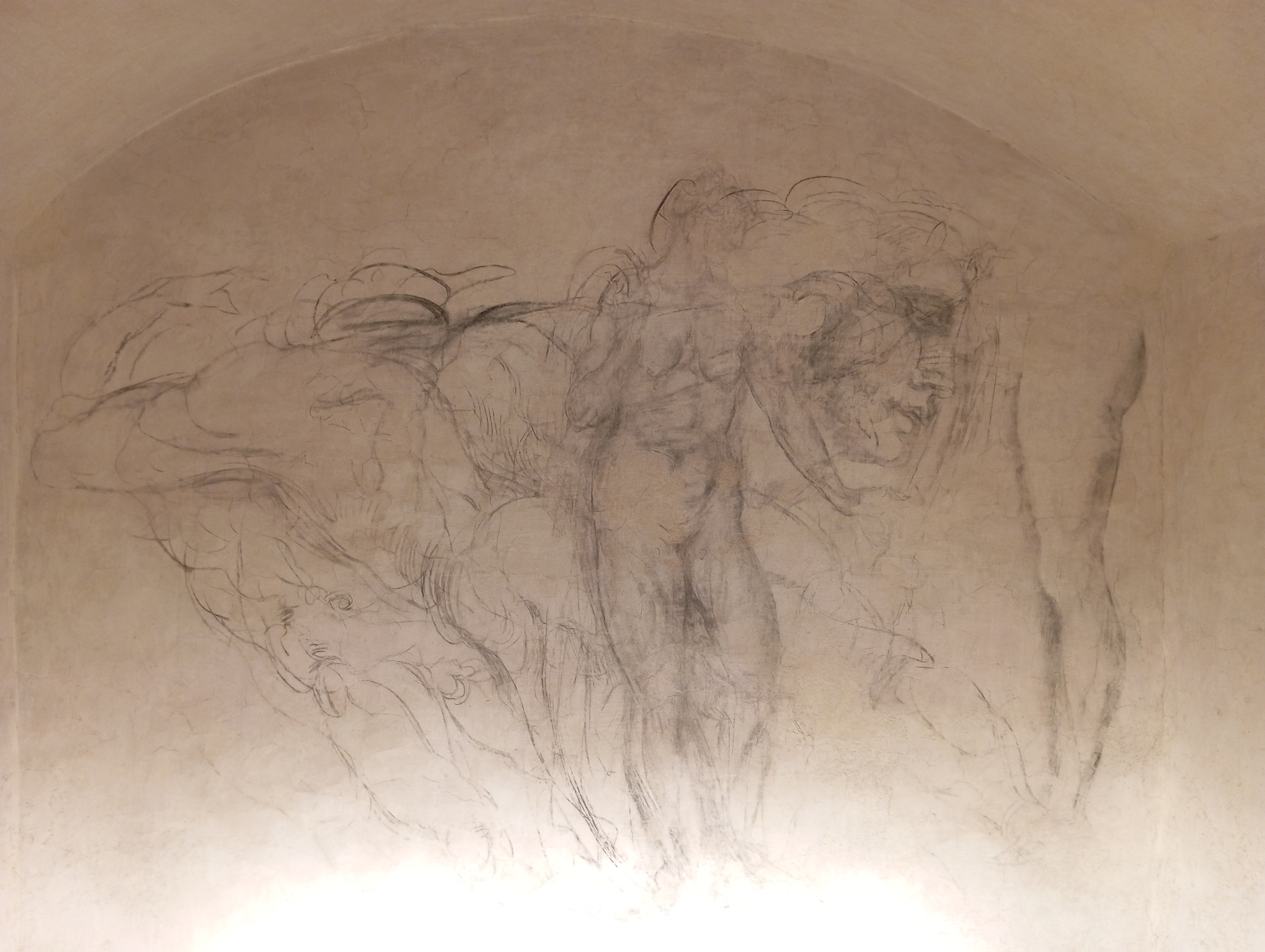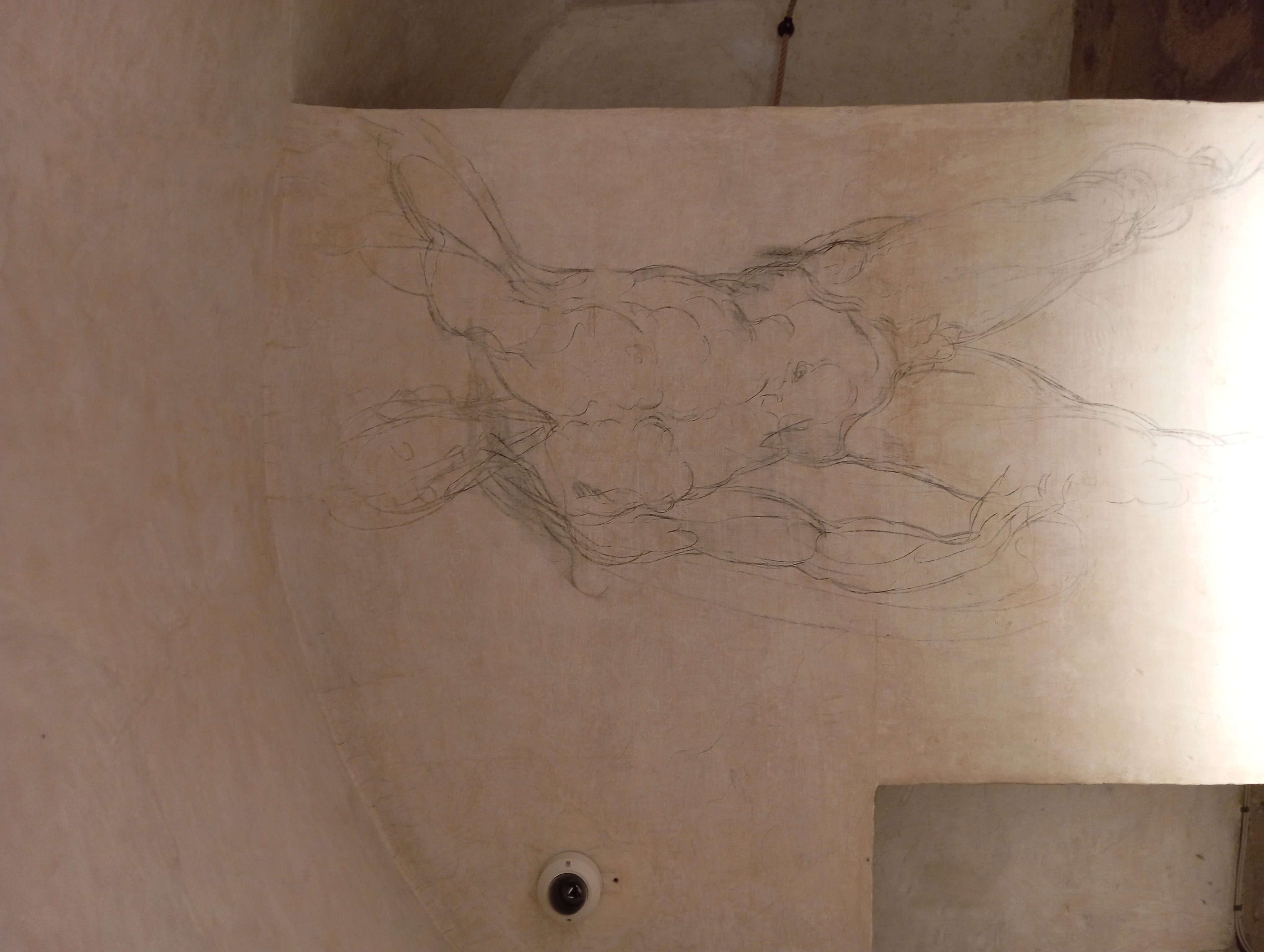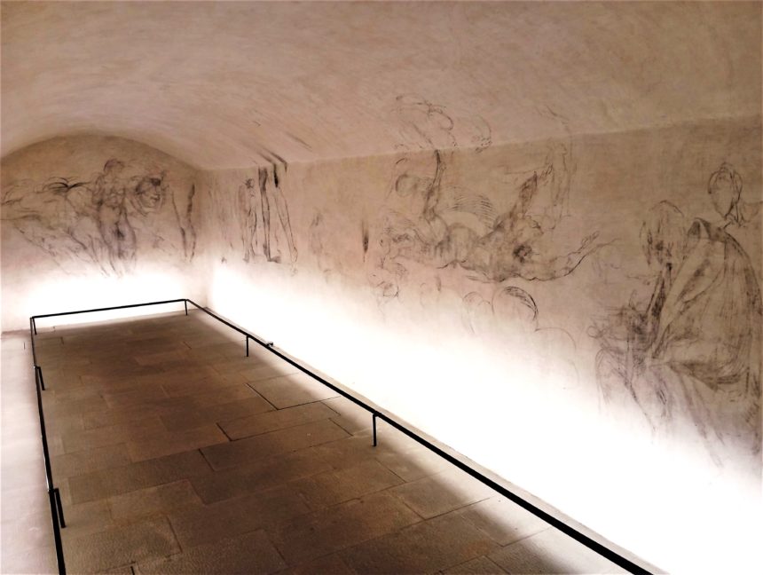 ルネサンス期の偉大な芸術家の1人、ミケランジェロ・ブォナッローティ。彼は1527年から30年にメディチ家が追放されている間に共和国派の都市計画に参加していため、メディチ家出身のクレメンス7世からの迫害を恐れ、メディチ家礼拝堂の下の小さなスペースに1530年6月~10月に身を隠していました。その部屋の使い道は近年までは不明であるものの、1950年までは炭の保管庫として使われていたもののその後は放置されていましたが、1975年になって当時のメディチ家礼拝堂の館長による指示でそのゾーンの清掃を行っていたところ、身を隠していたミケランジェロが壁に描いたデッサンが発見されたのです。