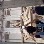 その後、もう一度エントランスに戻り、秘密の部屋の見学者集合ポイントへ。1回につき4名のはずがなぜか私と長男以外の2名が姿を現さず、なんと私たちだけ2人の独占見学に! もちろん自由見学でなく、しっかりとガイドも同行で、15分というスペースの割にはたっぷりの贅沢な時間となりました。さっきまで見学していた新聖具室に戻り、祭壇横のスペースの小さな階段を下ると……そこがすぐ、あのミケランジェロの秘密の間です(TOP写真)。下からライトアップされ、500年以上前のデッサンが浮かび上がるその空間は神秘的とも思えるほど。