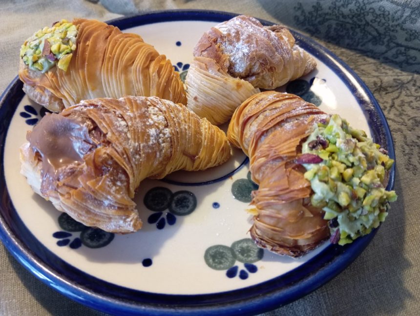 ここは今までのパン屋さんと違い、オーナーは女性・アンナでパンだけでなく焼き菓子が豊富なのも特徴。土曜の午前ということもあって、パンやスキアッチャータを買い求める人はもちろん、それにさらに+する形で、あるいはそれだけを目的に、焼き菓子を買う人が並んでいました。そこで私も、大好物のアラゴスティーナにくぎ付け。幾層にも重なったパリッパリのパイ生地にクリームがたっぷり、フィレンツェのバールで買うと2.50€くらいしちゃうのについ買ってしまう・・・ここでは値段はキロ表示だったのでまぁフィレンツェよりはお手頃だろうと、家族分4つ買ってみると4.50€、つまり1つあたり1.2€もしない!!