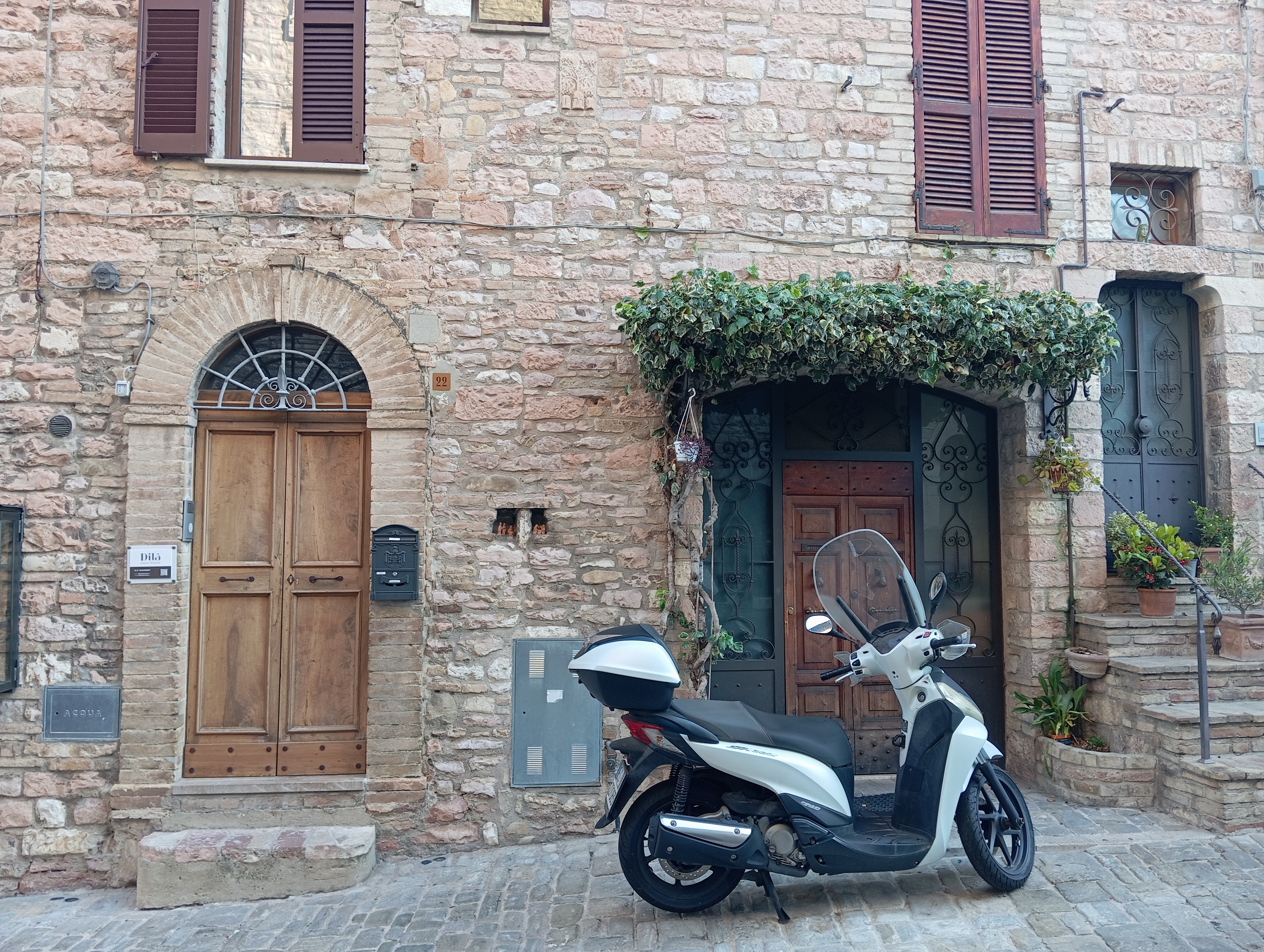 私が宿泊したのは Dila’ Assisi Rooms。駅からのバスが着くS.Francesco Assisiバス停のある広場から徒歩7分。上りが多いので荷物が多い方はB番のバスで1分。旧市街のほぼ真ん中に位置しているので観光にも便利ですし、私が泊まった時は1泊51.50€でした。窓から見える田園風景の遠景、下の通りも素敵。バスタブはありませんが、シャワールーム自体はとても広く、何よりもご覧のように清潔で快適。大満足でした!朝食はついていませんがコーヒーや紅茶などの飲み物、水などは共有スペースにあり、宿泊客が利用できるようになっています。
