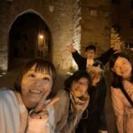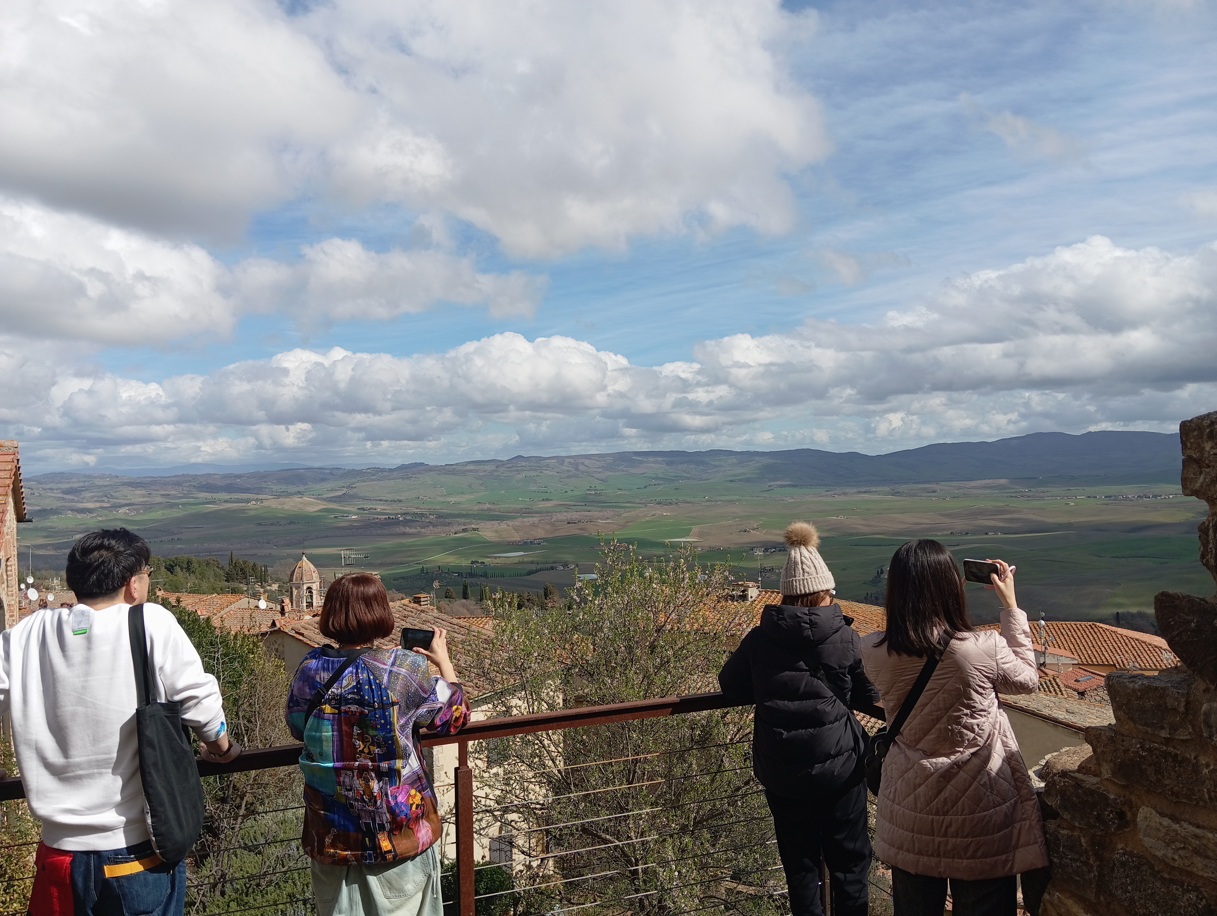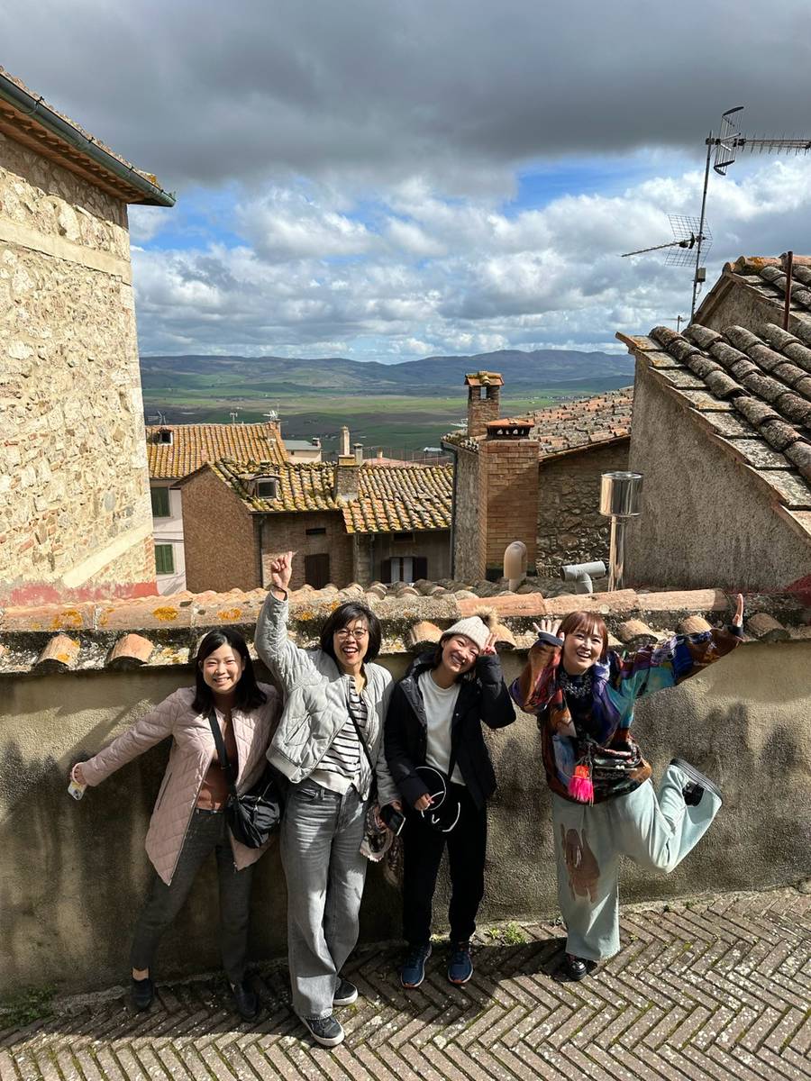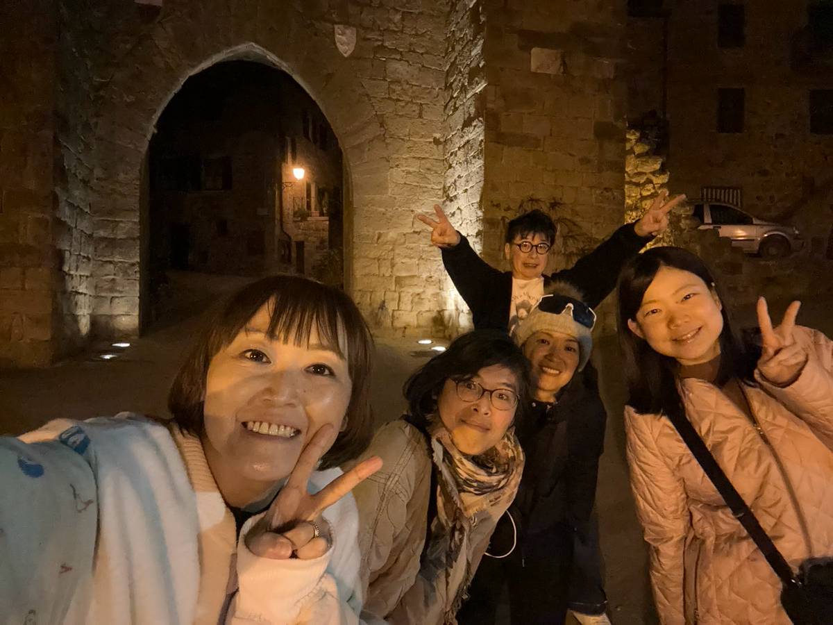 そこからは日没を考慮して モンタルチーノ には寄らず、みんなが楽しみにしていた 糸杉スポット へ。車を止めて、奥の円形の糸杉まで歩きました。遠くまで連なる丘、少し冷たい風、何もかもが現実でないかのような、夢のような時間。