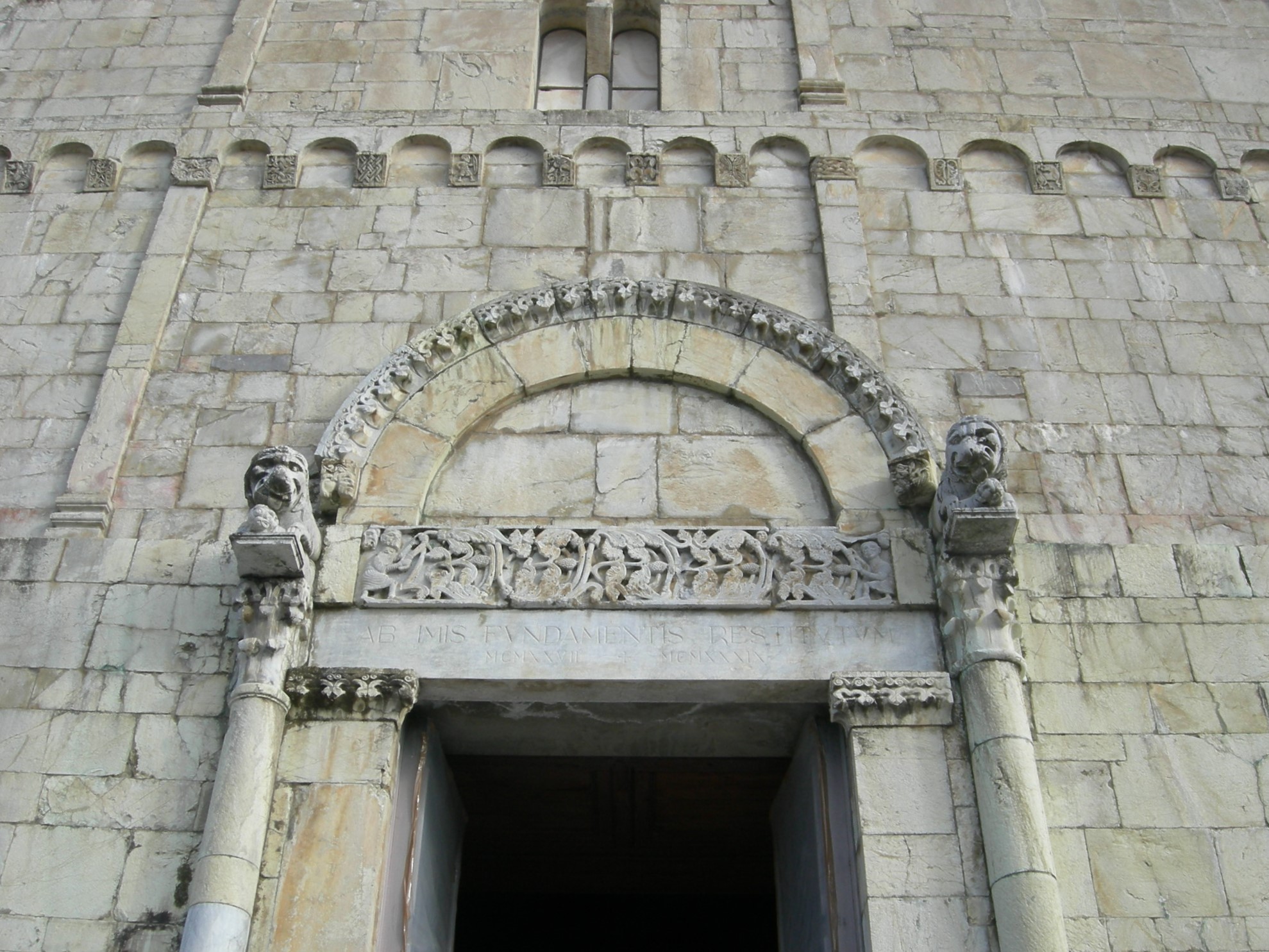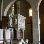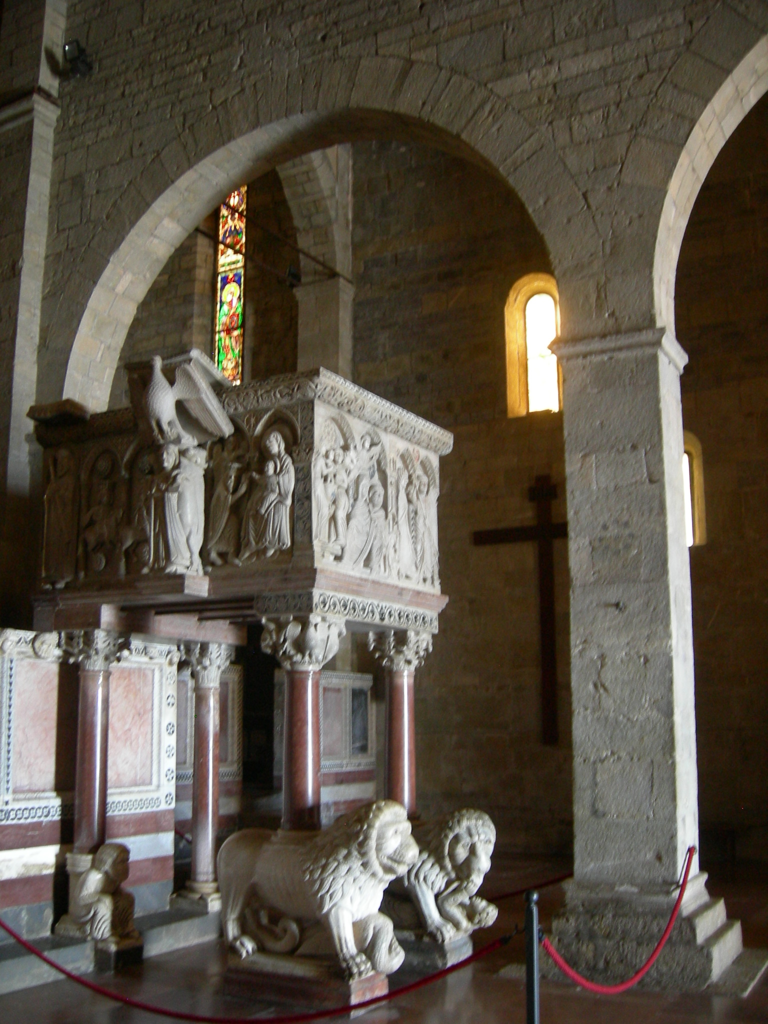 外も中もベージュ~グレーの石で プリミティブな感じ 、そして内外部の彫刻や、ちょっと滑稽な感じの動物や人の顔は サンタンティモ修道院 に似ていますね。説教壇は12世紀のもので、柱を支える2頭のライオンのうち1頭は悪のシンボルにあるドラゴンを、もう1頭は異端者を踏みつけているそうです。