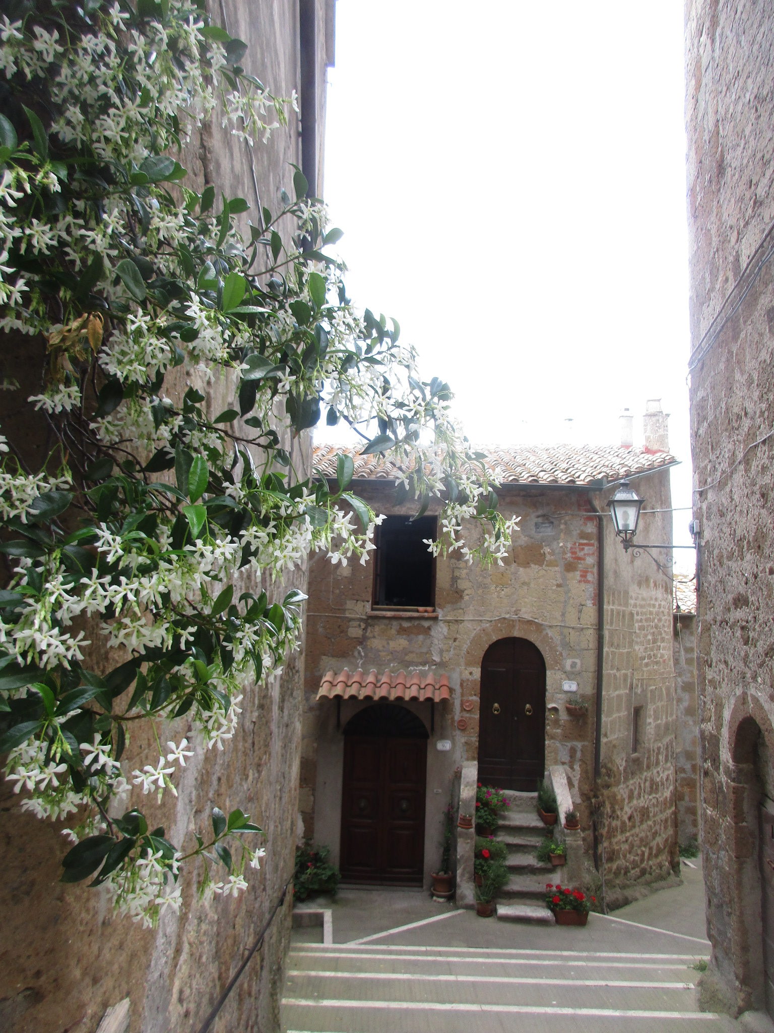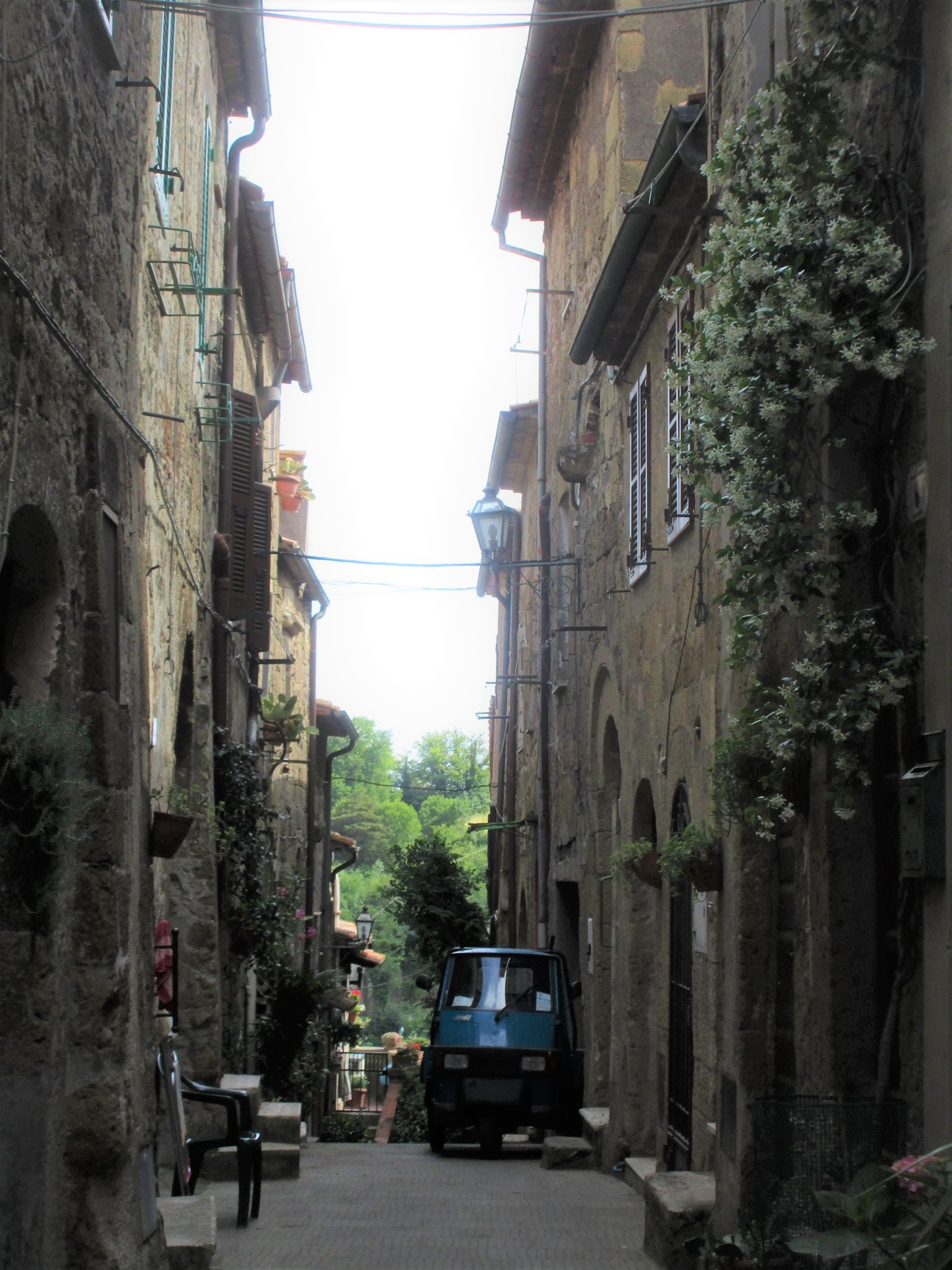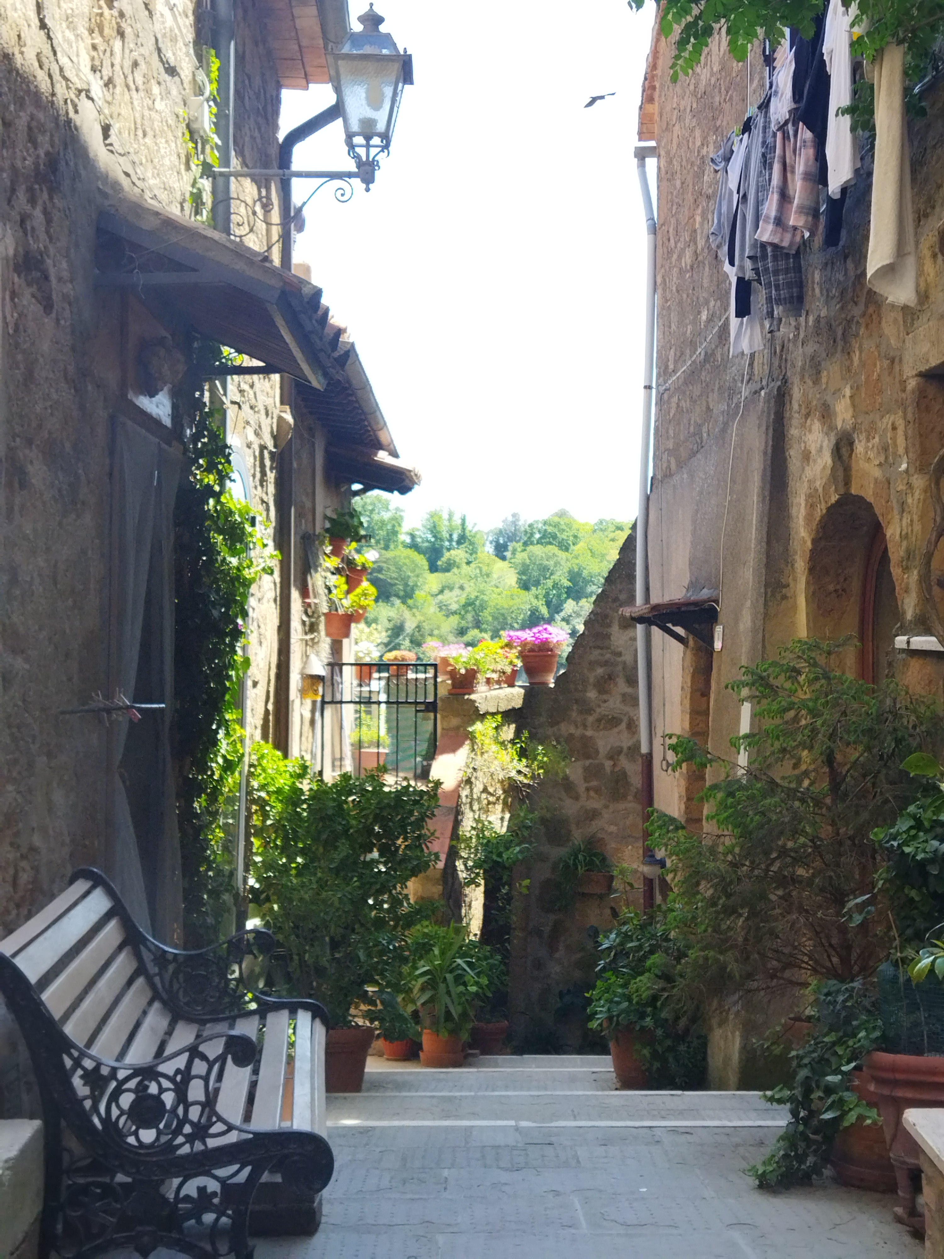 帰りはもう1つ別の道へ行くと、右側にドゥオモが現れ、さらに進むとオルシーニ広場に戻ってきます。これで旧市街をおおよそ一周したことになありますが、この2つの通りだけでなく、村の中に60もあるという路地にも気ままに入ってみてください。村の北側や西側は特に観光客も少なく、おばあちゃんが家の前で編み物をしていたり、ご近所さんがイスを出しておしゃべりしていたり、独特の村の中に今も息づく日々の暮らしが垣間見えます。