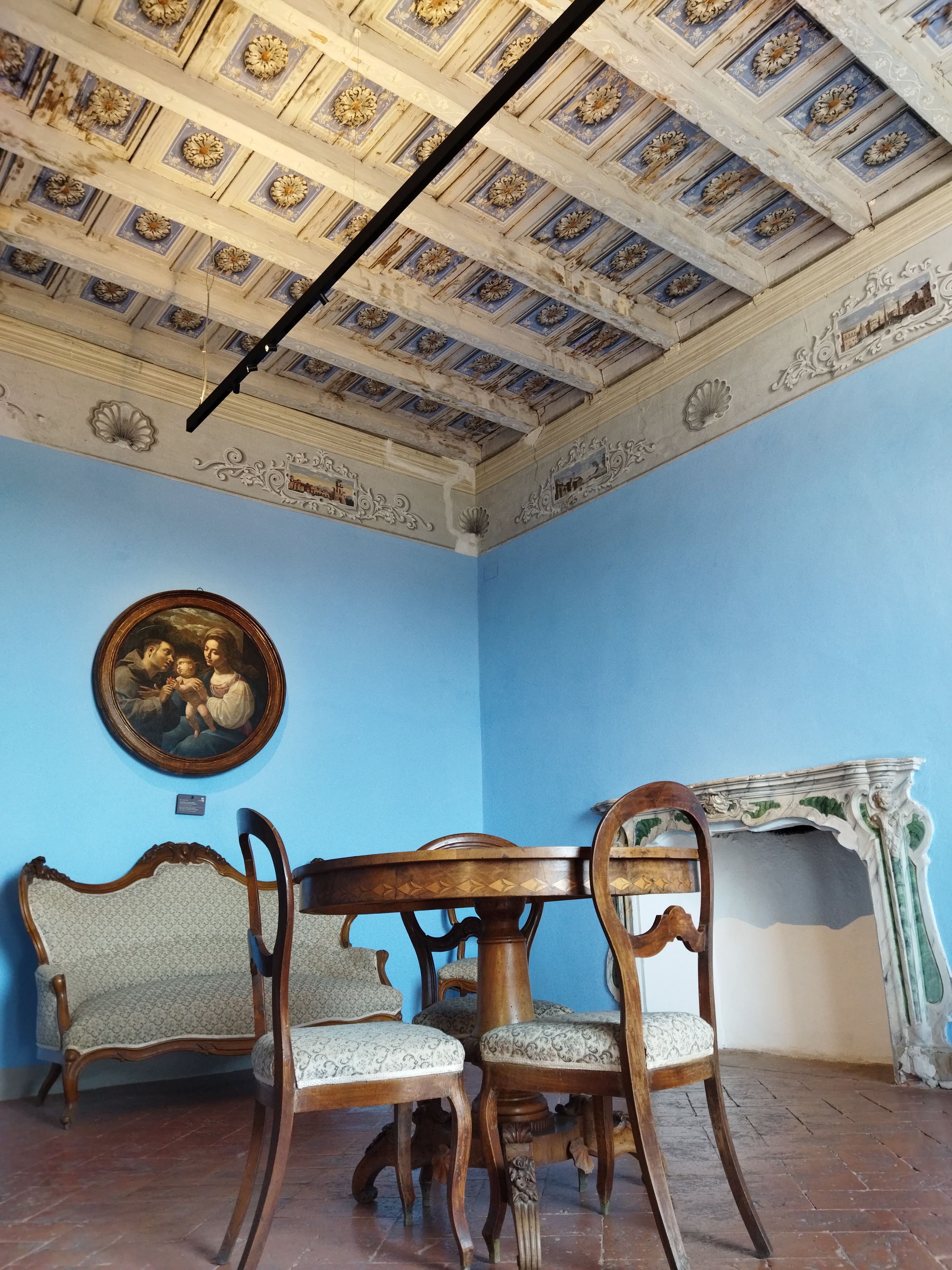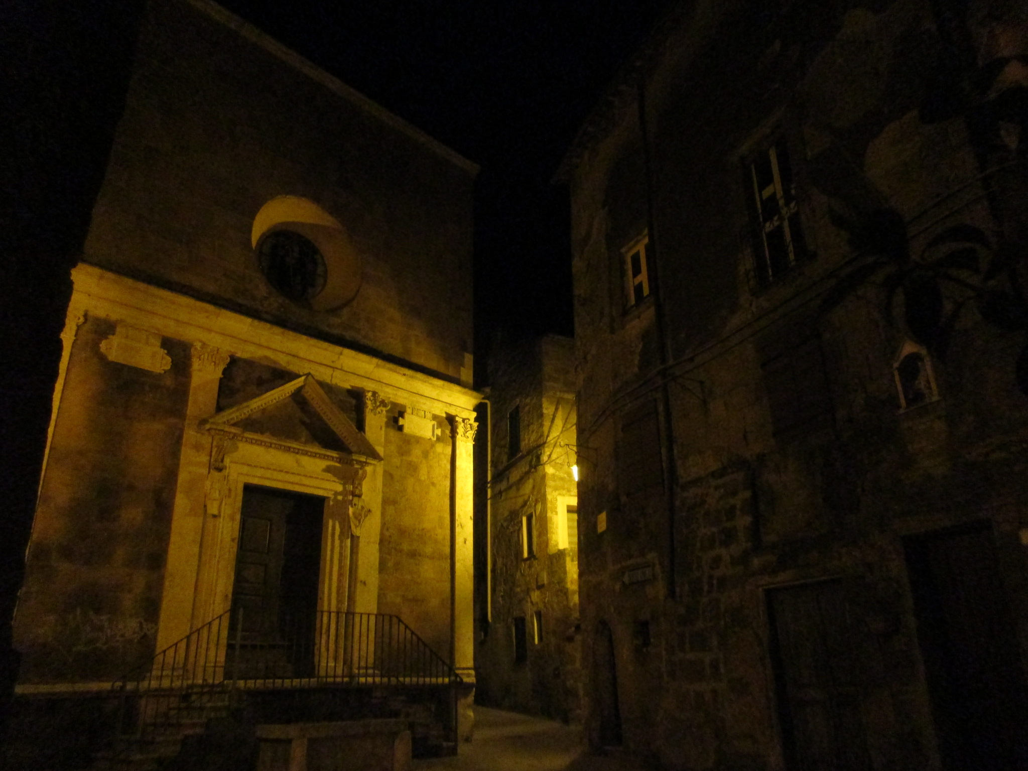 その先、オルシーニ広場を背に右側の道と合流した角にあるのが、サンタ・マリアとサン・ロッコ教会。この教会が建てられたのは、意外に近年・1800年代のちょうど町の発展の時期で、1200年代に建てられたサンミケーレ教会が狭く古いために、それらの役割を受け継ぐ形で建てられたそうです。